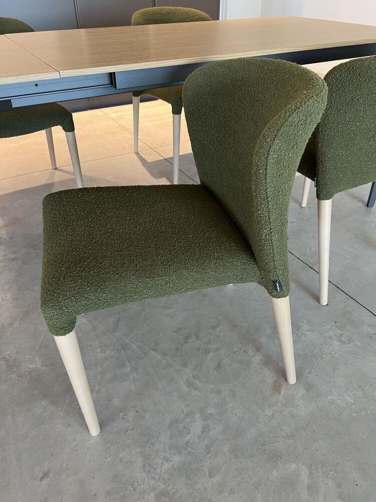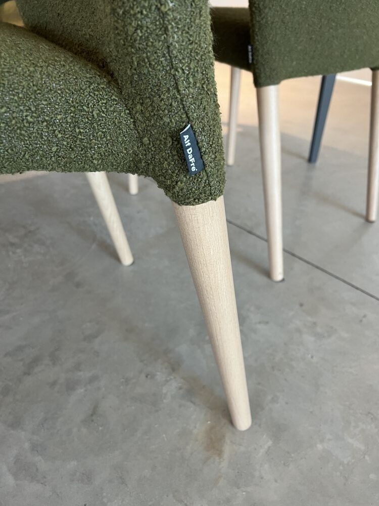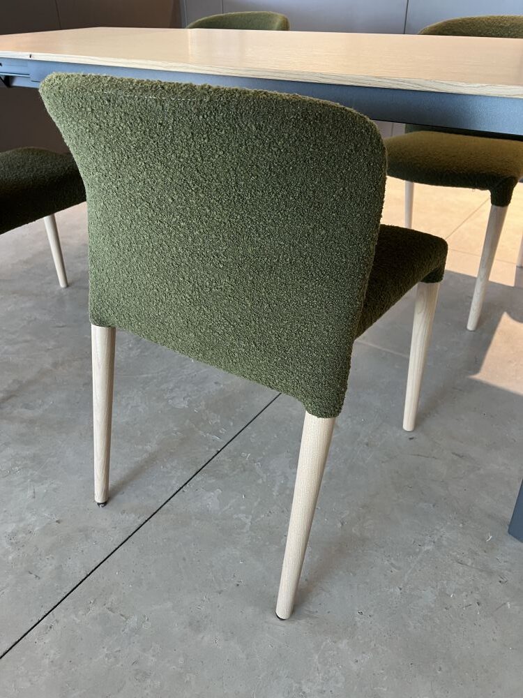 DETTAGLI E FINITURE: rivestito in tessuto Ricciolone verde militare, gamba in legno rovere naturale