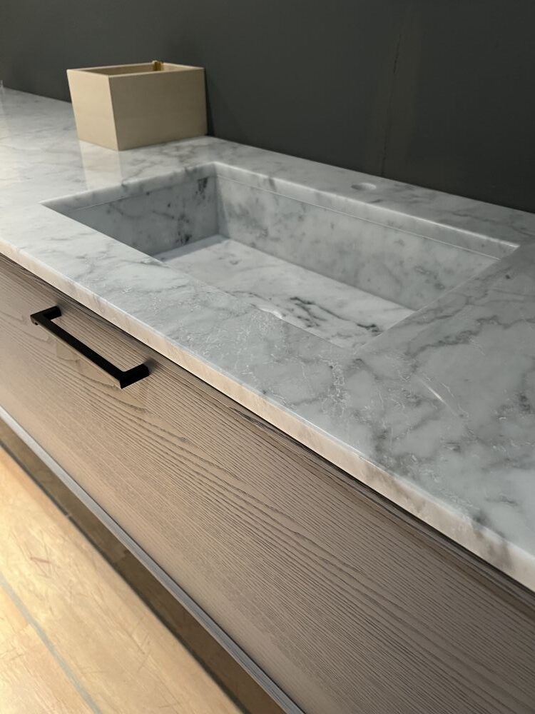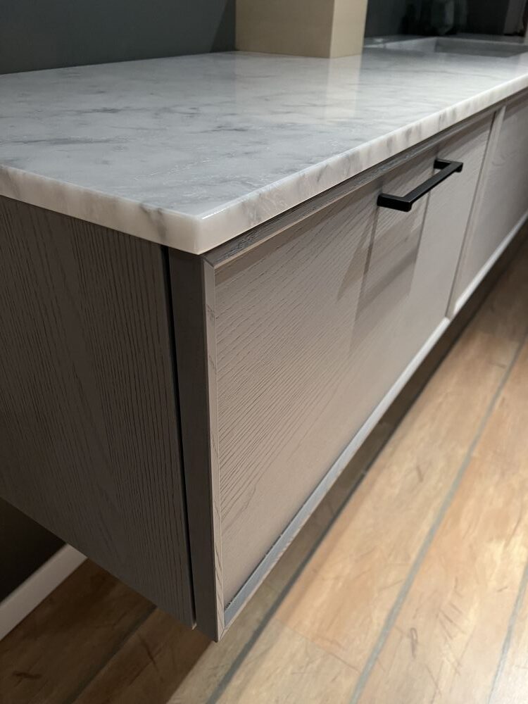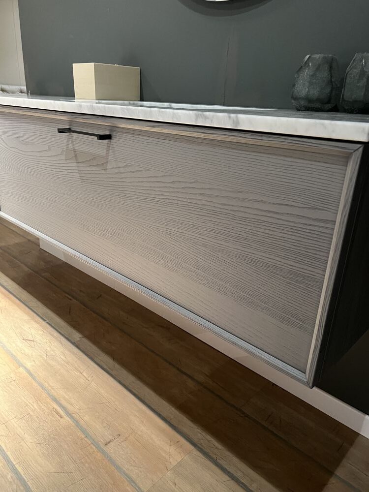 DETTAGLI E FINITURE: frontali in legno di frassino finitura fumo con due specchi rotondi led e 2 colonne sospese. Piano top e vasca in marmo.
