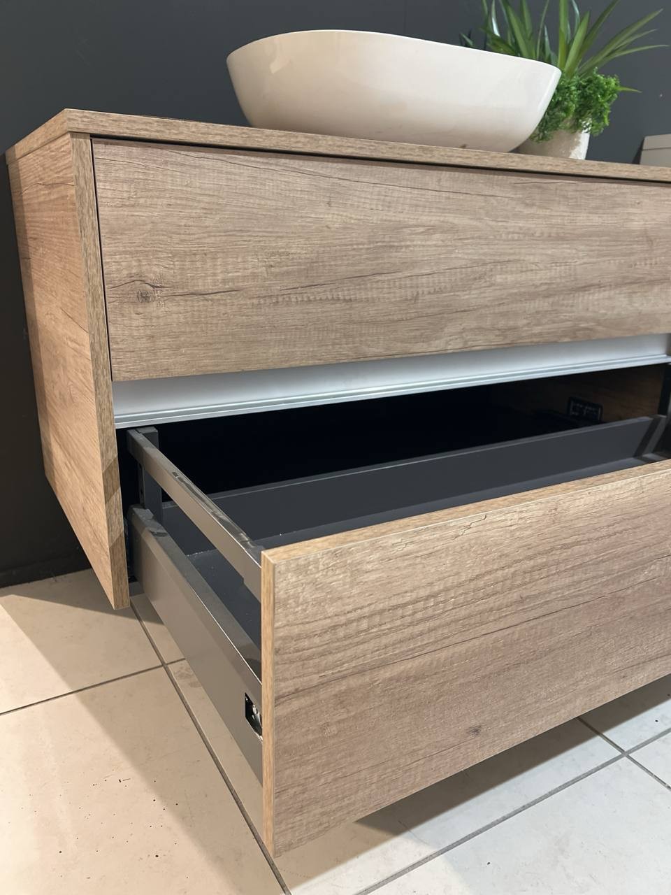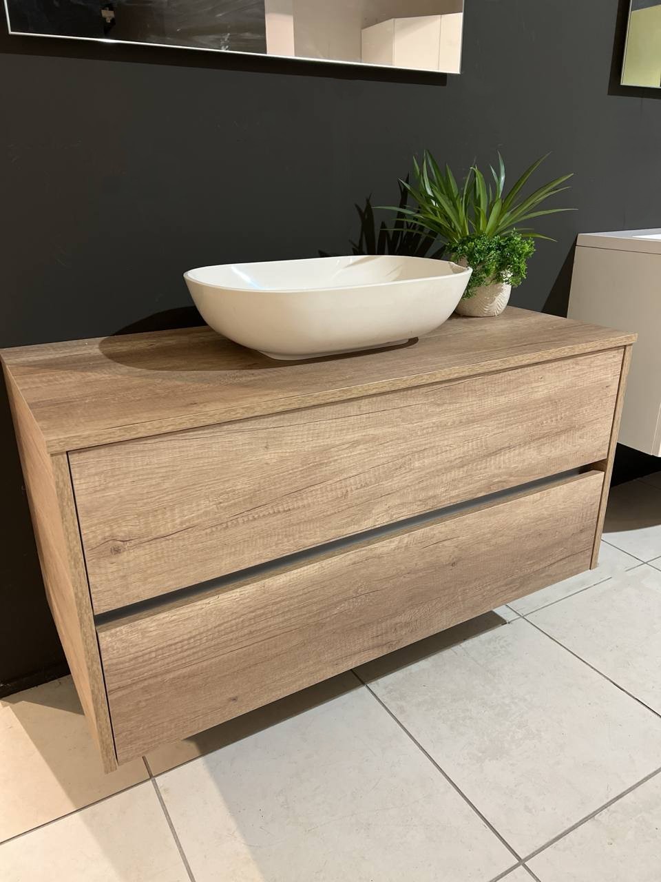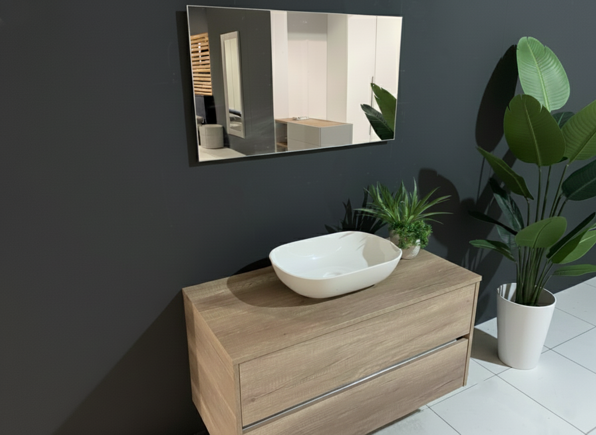 DETTAGLI E FINITURE: finitura materico rovere nodato, lavabo in appoggio e specchio