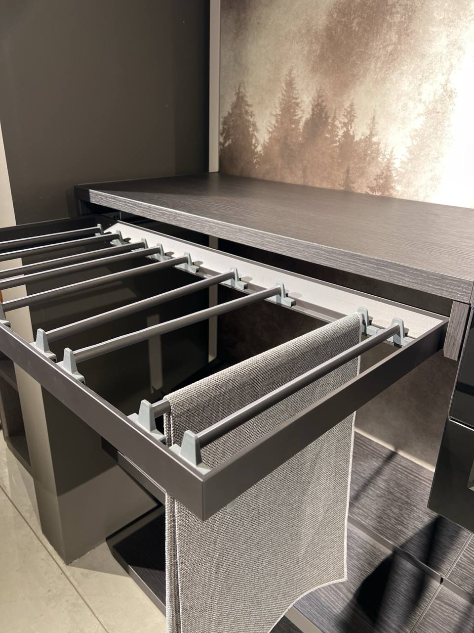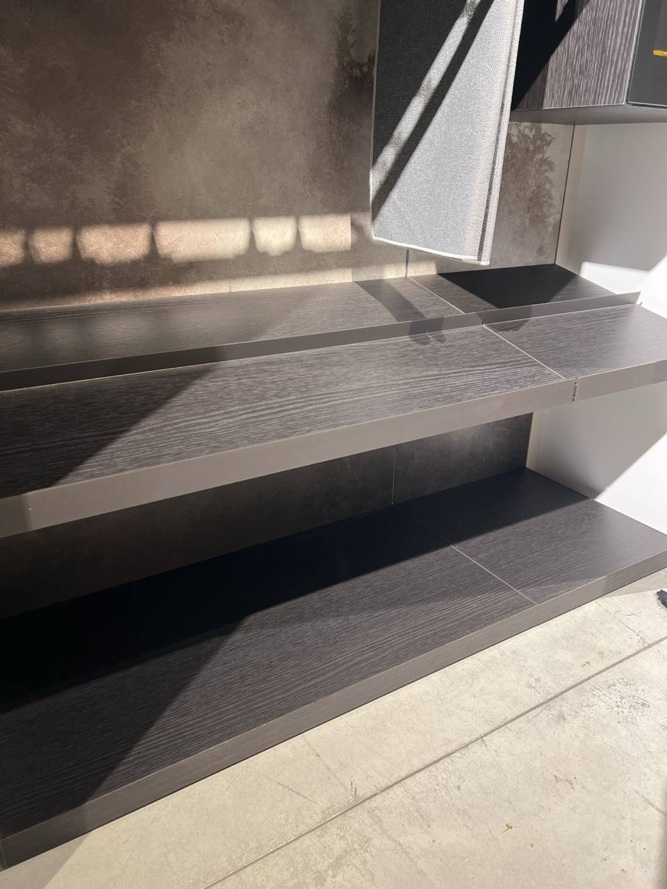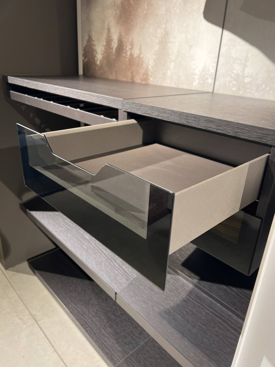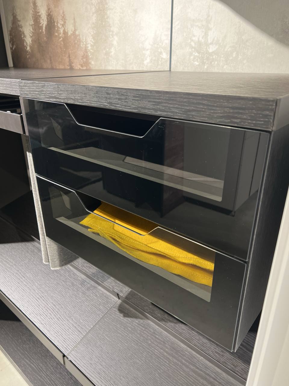 DETTAGLI E FINITURE: struttura in materico rovere carbone, elementi in metallo antracite opaco, cassettiera con frontali in vetro trasparente fumè