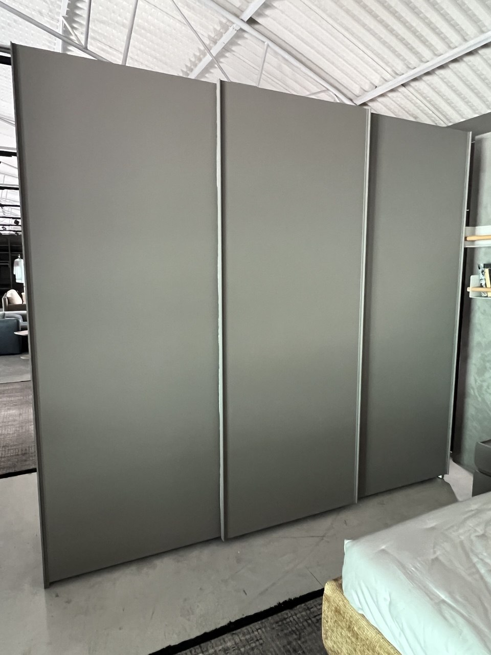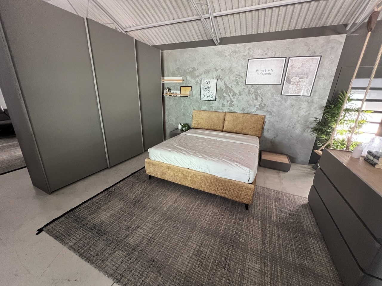 DETTAGLI E FINITURE: armadio in finitura grigio londra, gruppo in finitura grigio londra e top in rovere naturale, letto in tessuto sfoderabile ocra