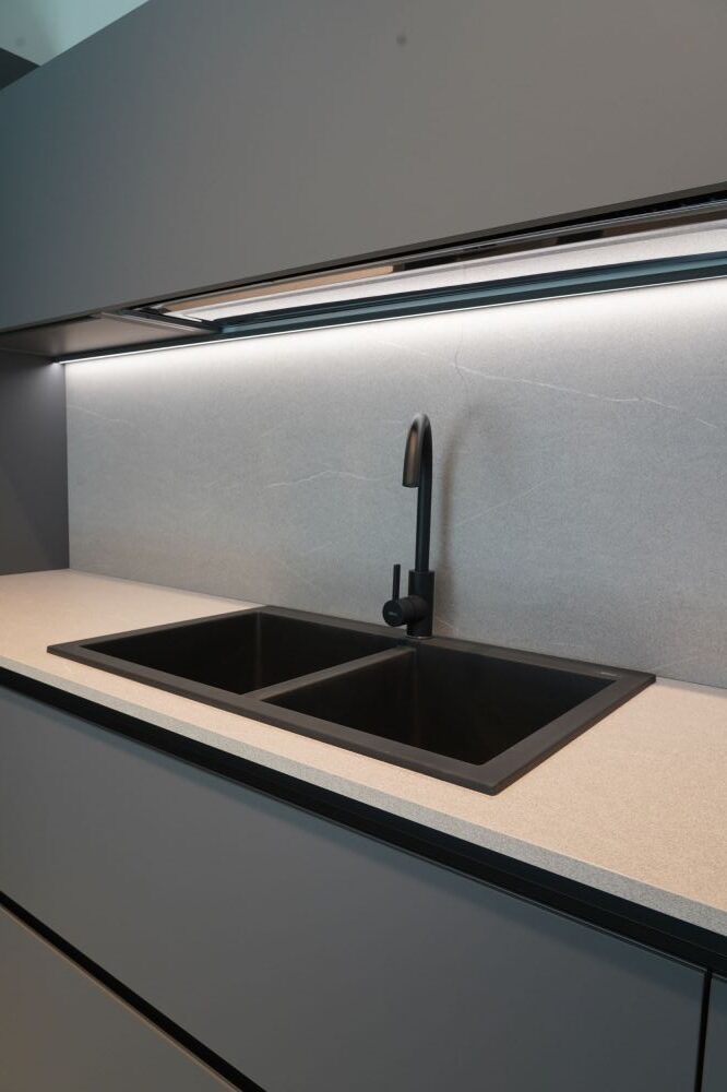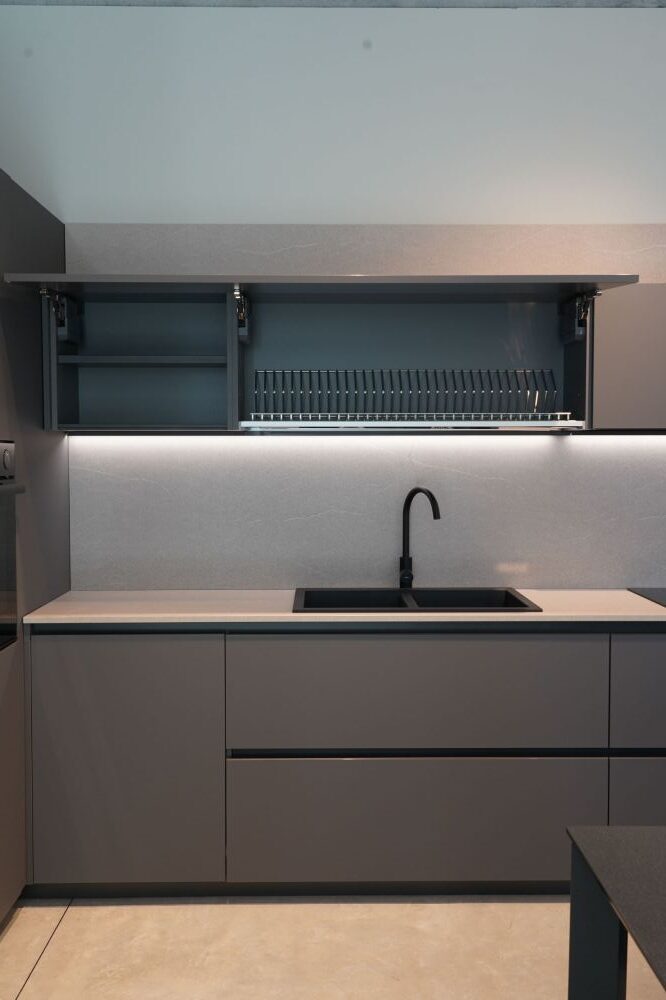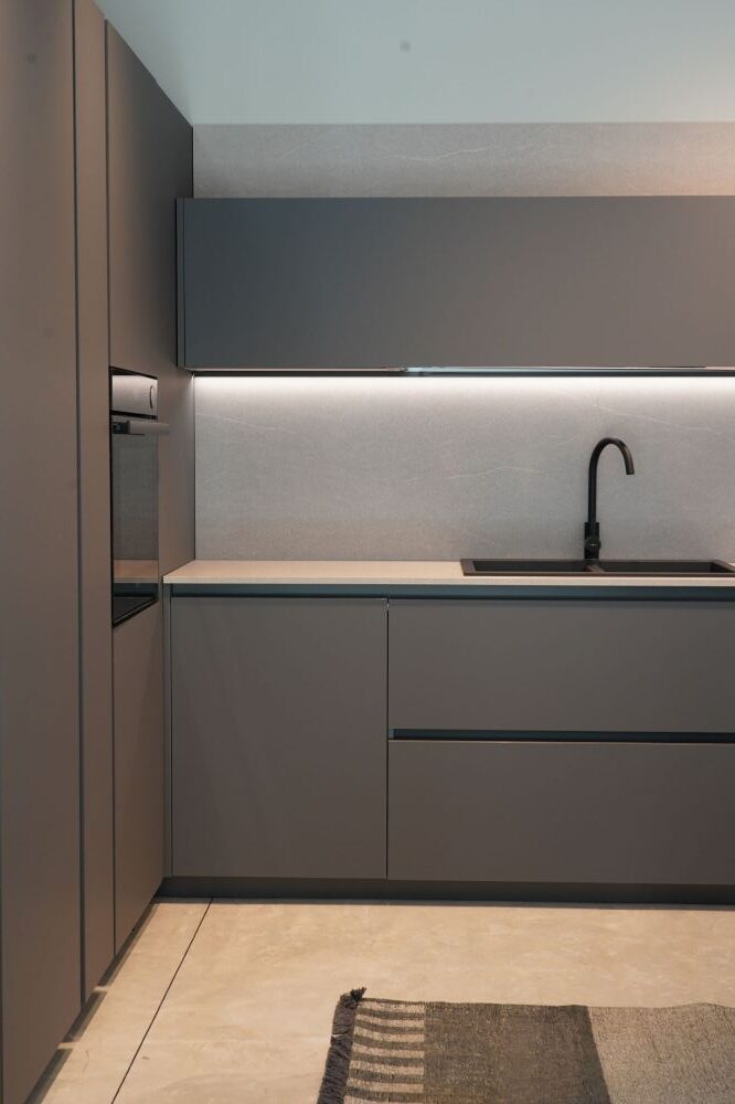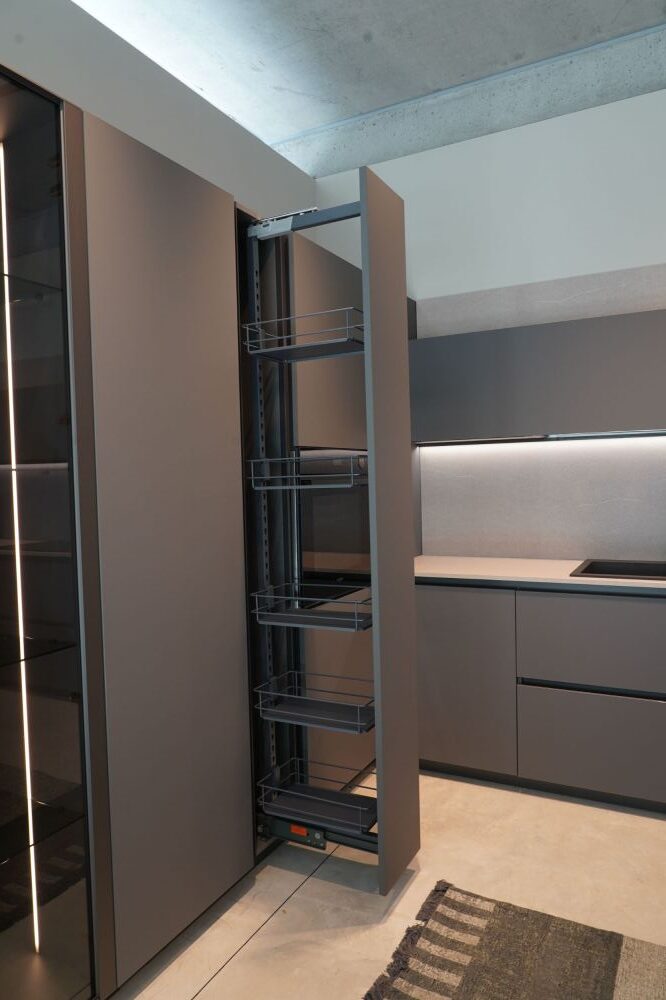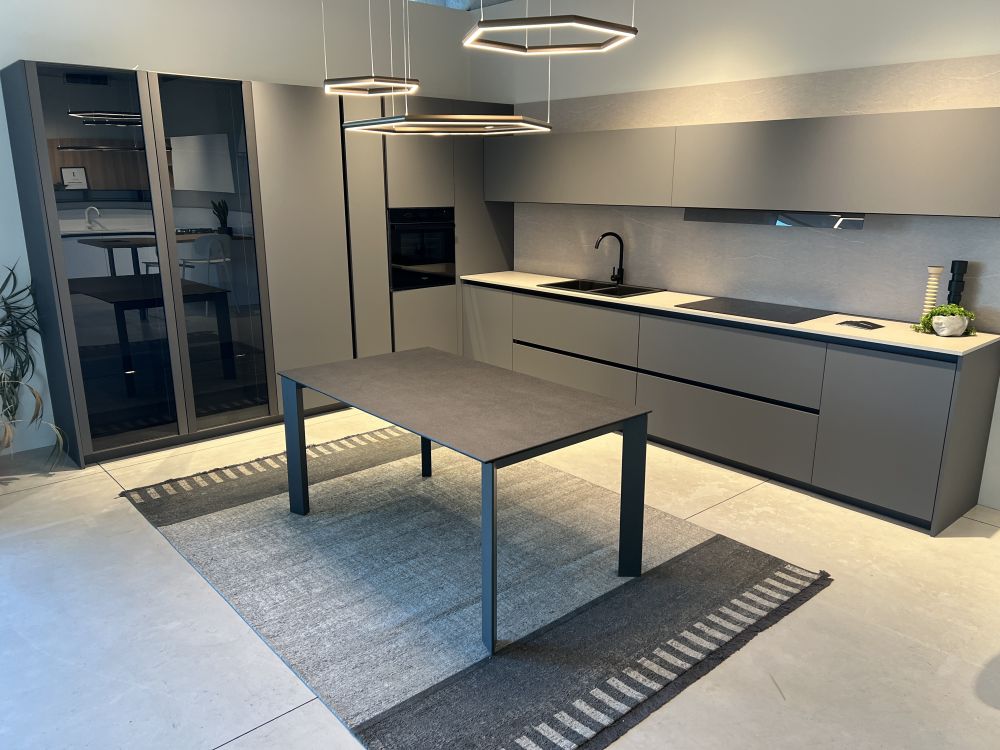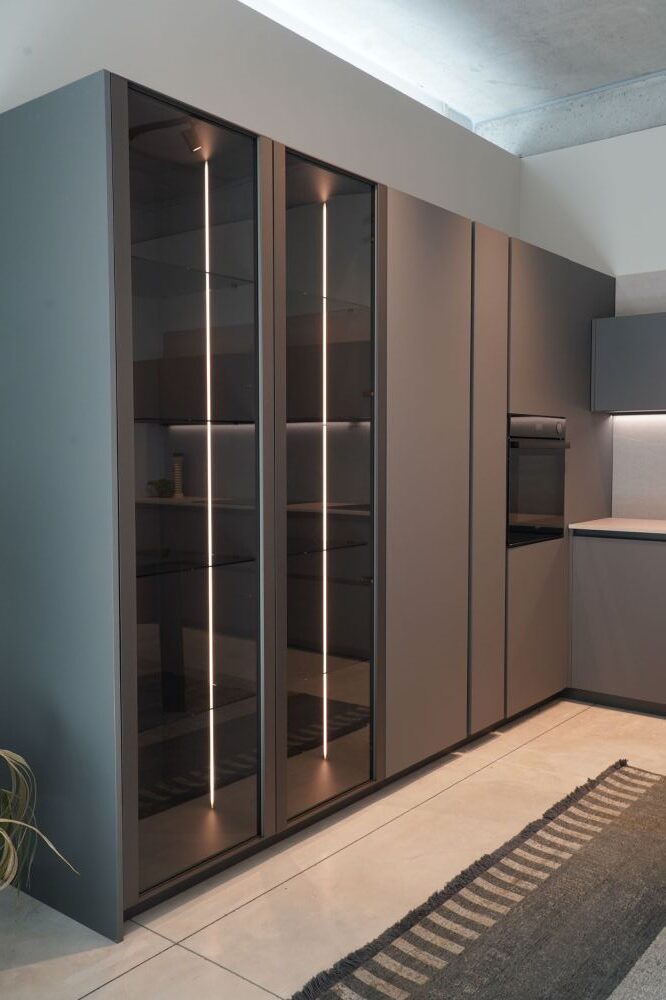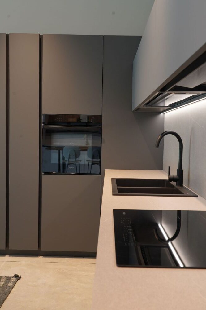 DETTAGLI E FINITURE: cucina con colonna angolo, ante basi con gola e maniglia a 90 gradi laccate Graffite, pensili laccati graffite con monoporta da 180 cm, piano top in laminato finitura sabbia con schienale e boserie, lavello in fragranite nero, colonna da 30 cm con elemento estraibile, vetrinette brunite con ripiani in vetro e illuminazione verticale, illuminazione a led sottopensili, zoccolo da 8 cm