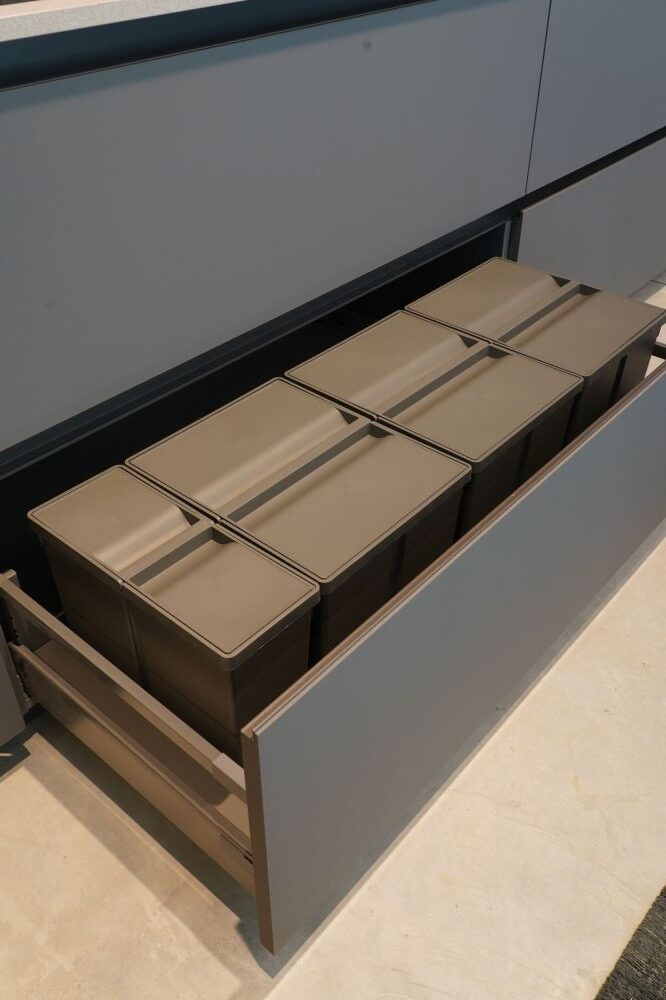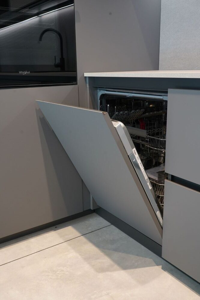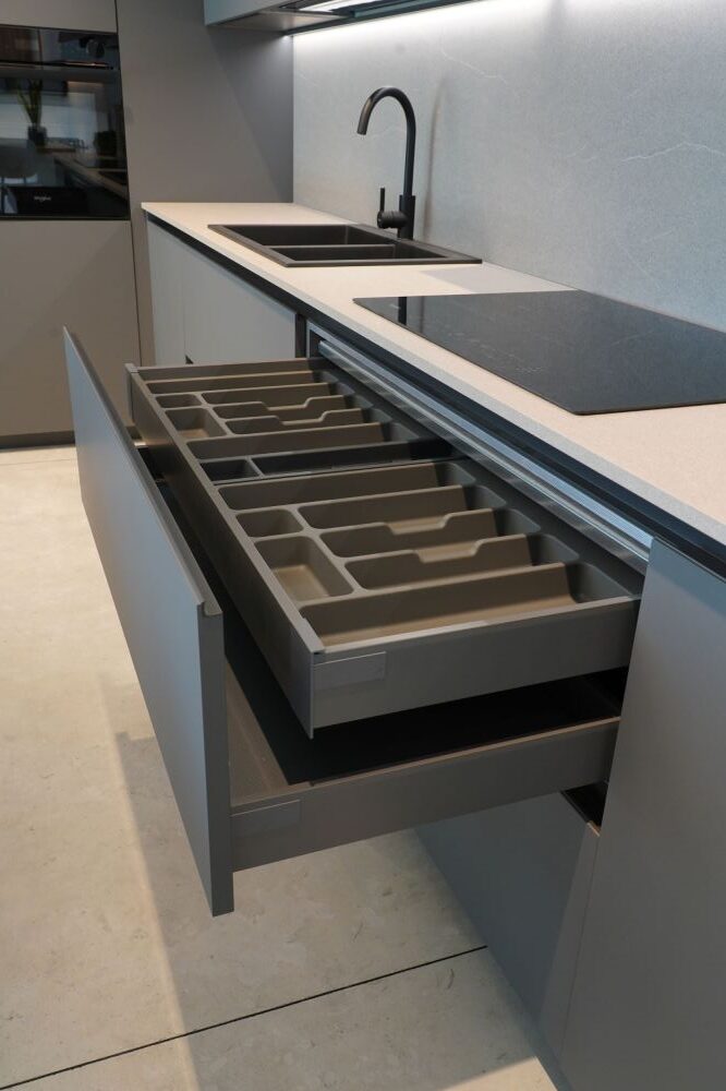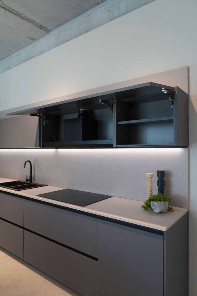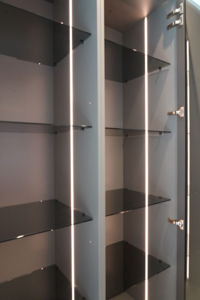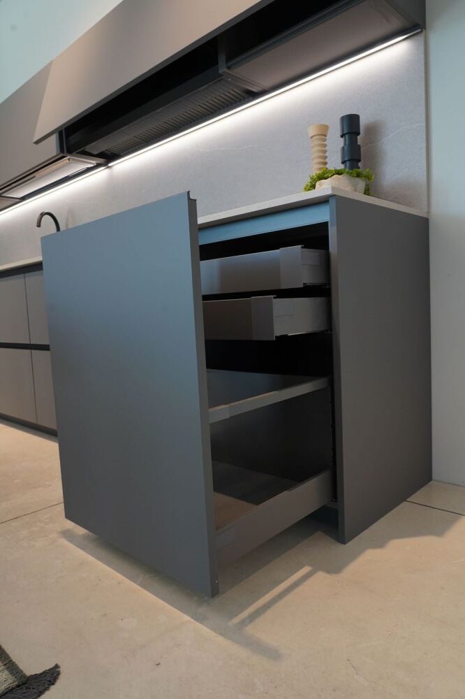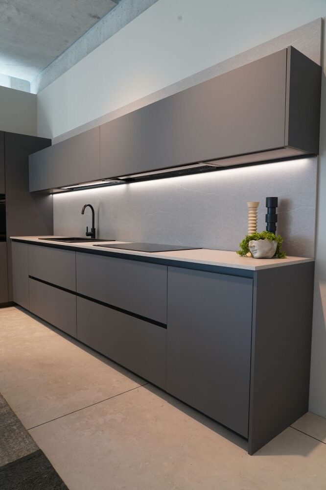 DETTAGLI E FINITURE: cucina con colonna angolo, ante basi con gola e maniglia a 90 gradi laccate Graffite, pensili laccati graffite con monoporta da 180 cm, piano top in laminato finitura sabbia con schienale e boserie, lavello in fragranite nero, colonna da 30 cm con elemento estraibile, vetrinette brunite con ripiani in vetro e illuminazione verticale, illuminazione a led sottopensili, zoccolo da 8 cm