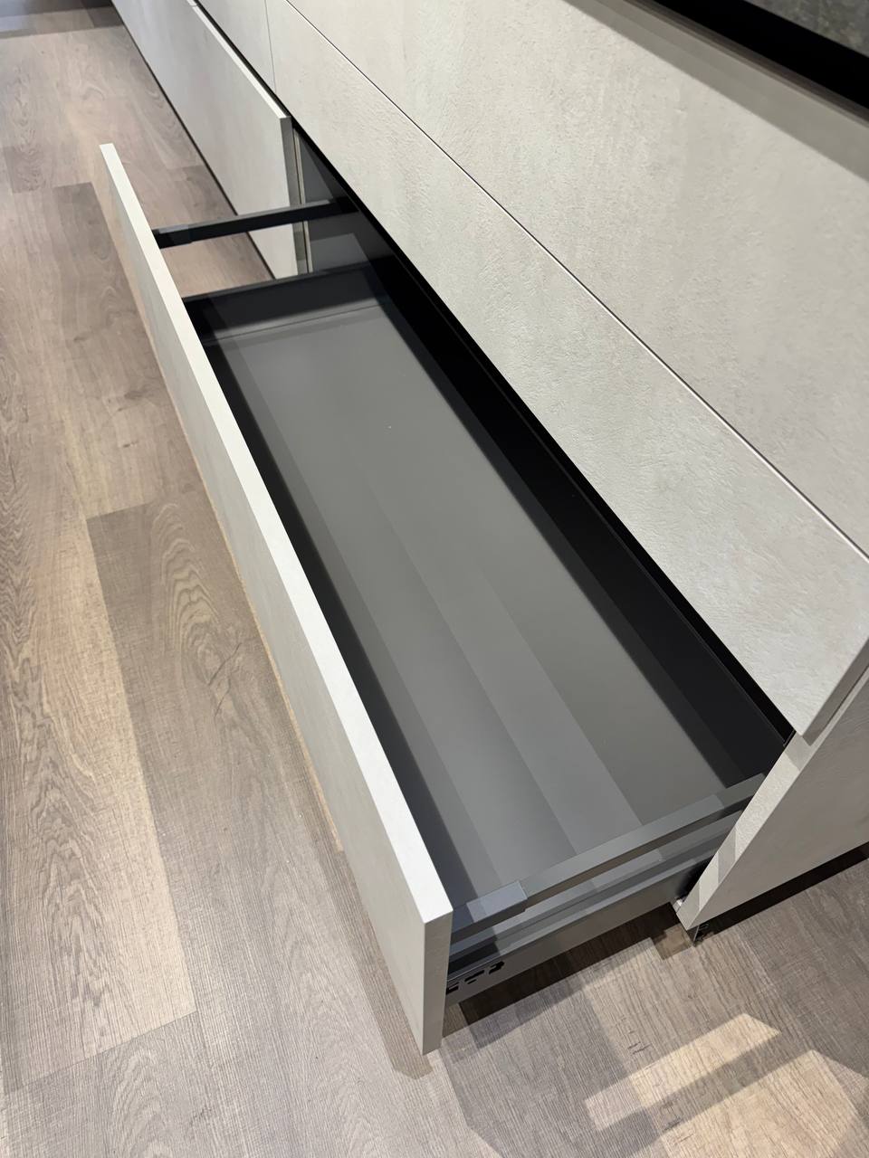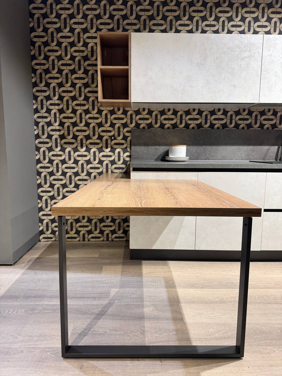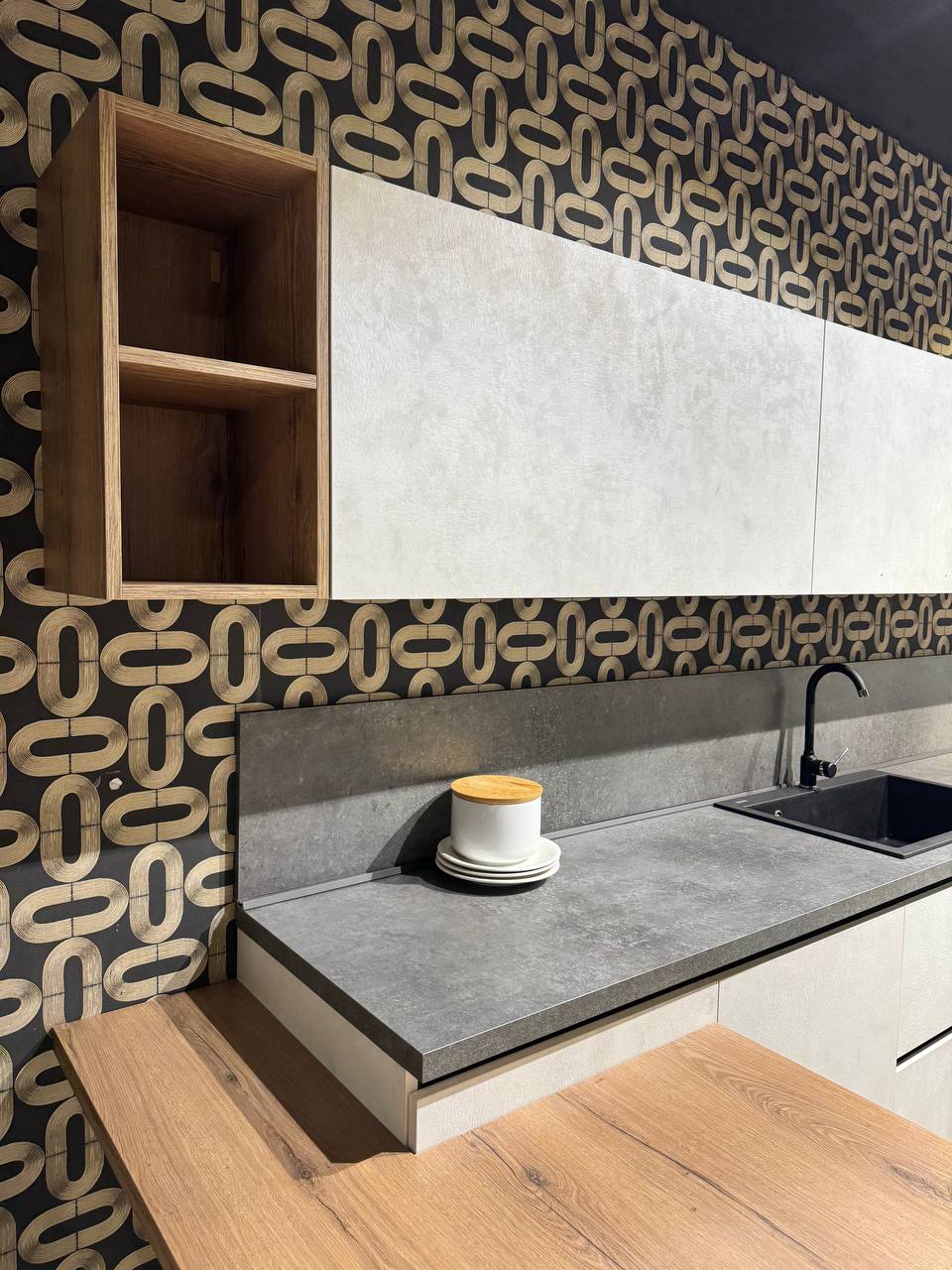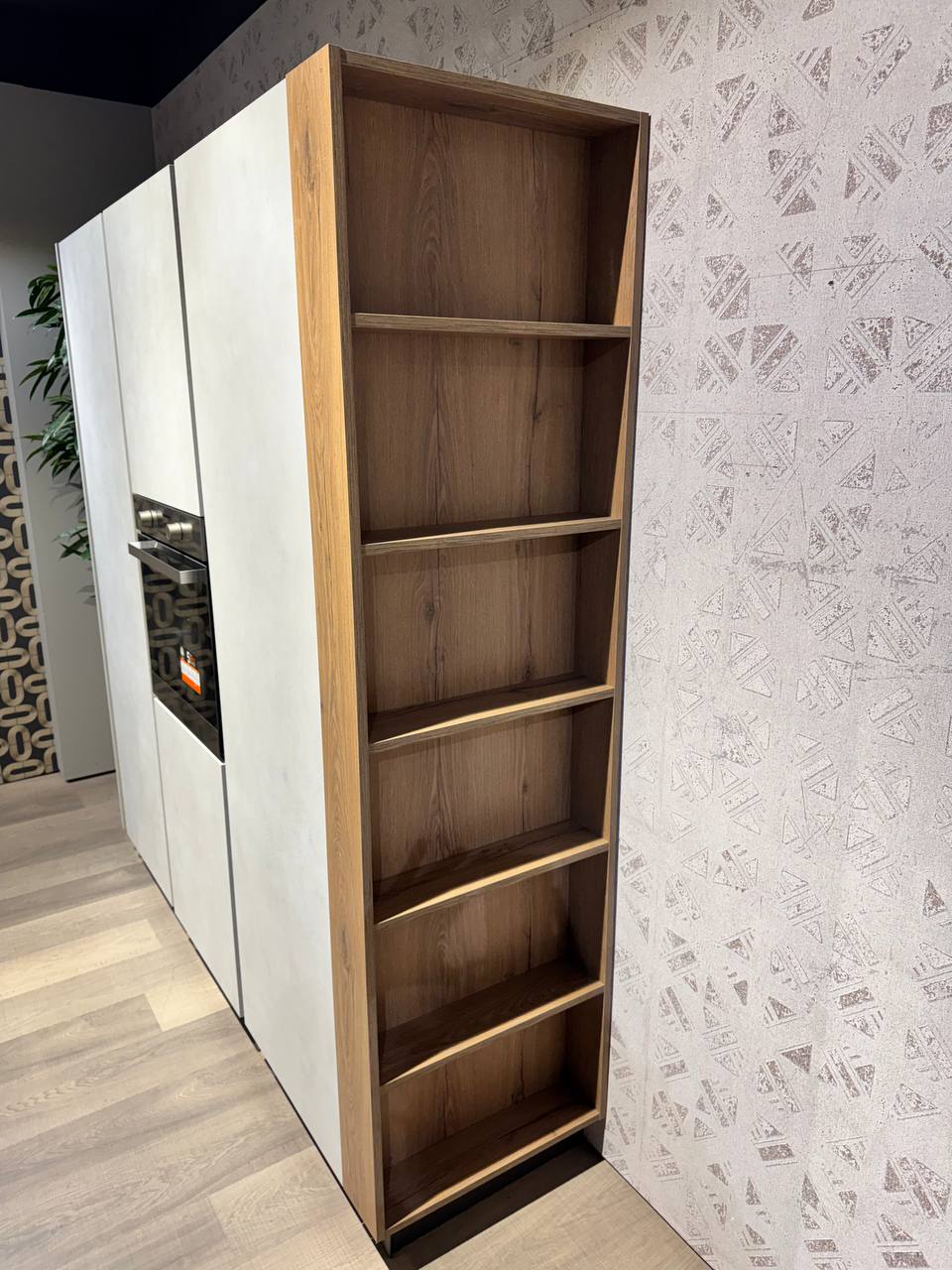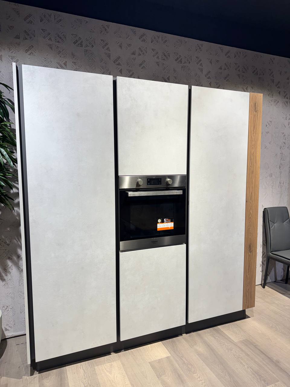 DETTAGLI E FINITURE: frontali colonne e basi in finitura cemento chiaro, maniglia integrata e zoccolo nero ossidato, Top laminato H 4 finitura grigio cemento scuro, tavolo penisola, elemento a giorno e terminale colonne in rovere nodato vintage.