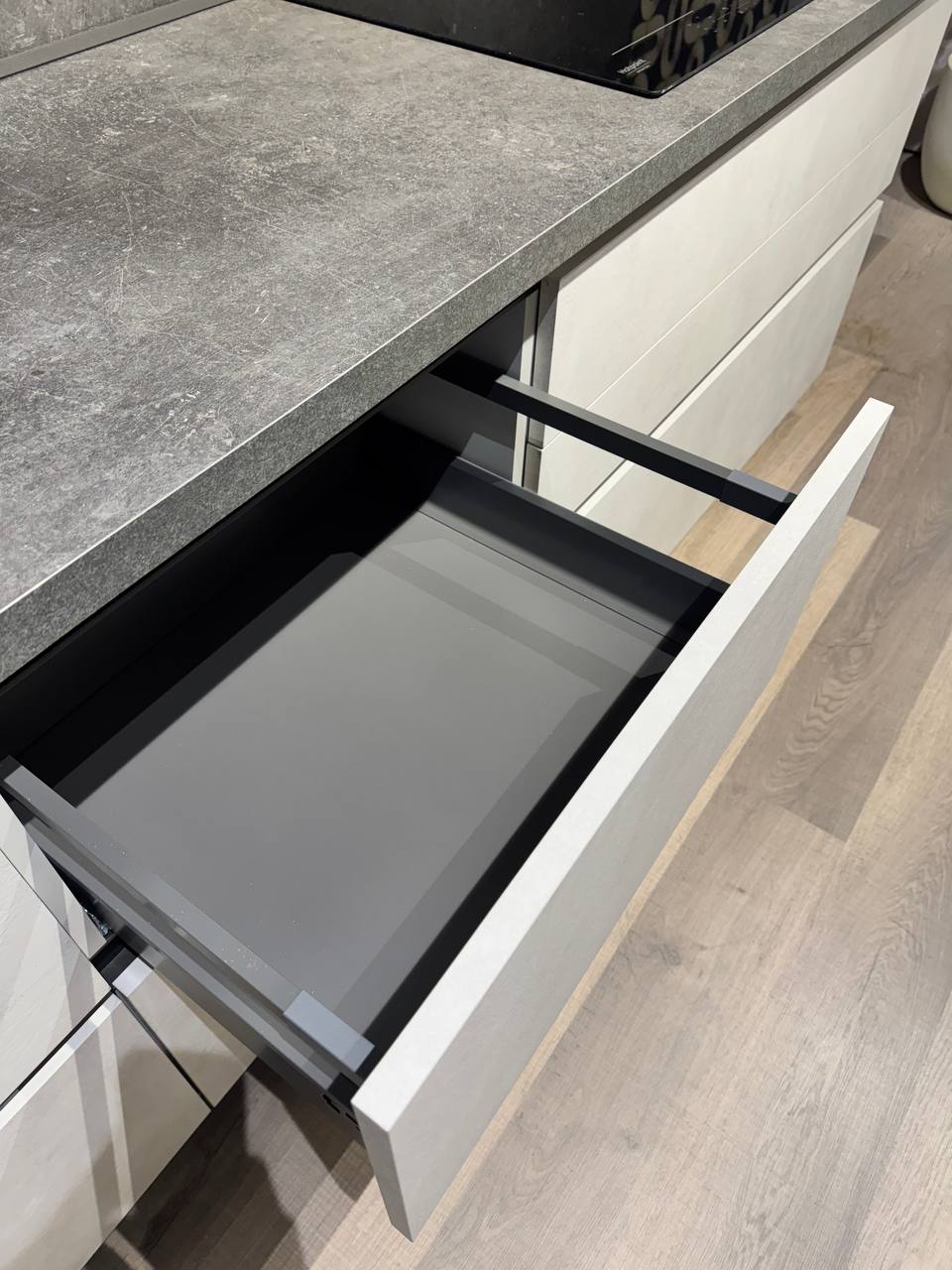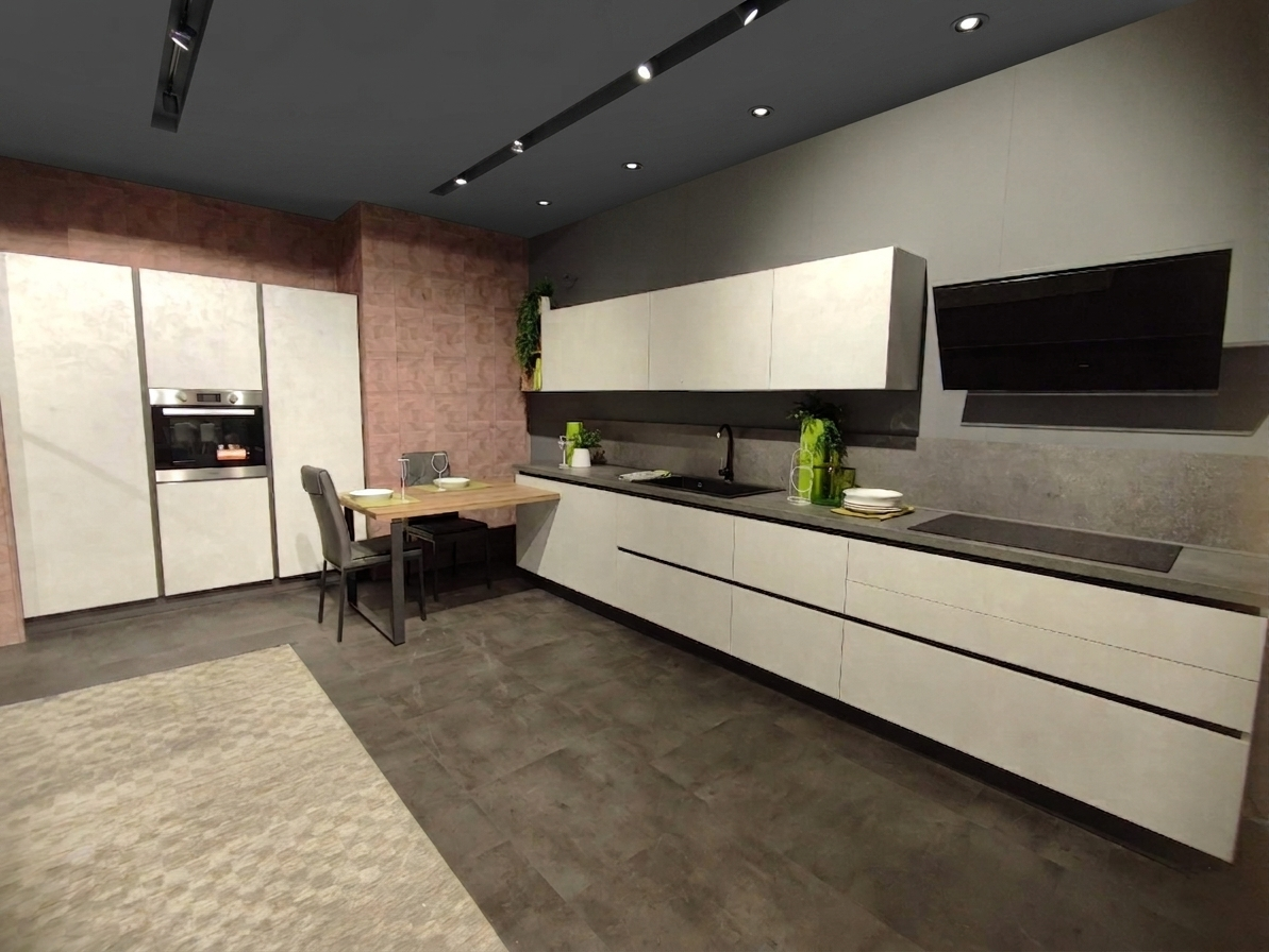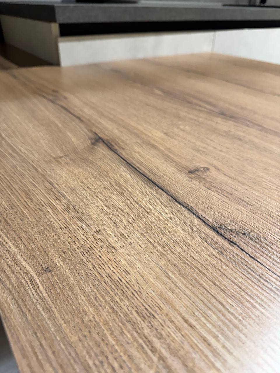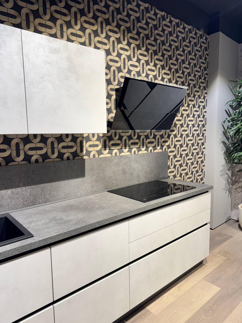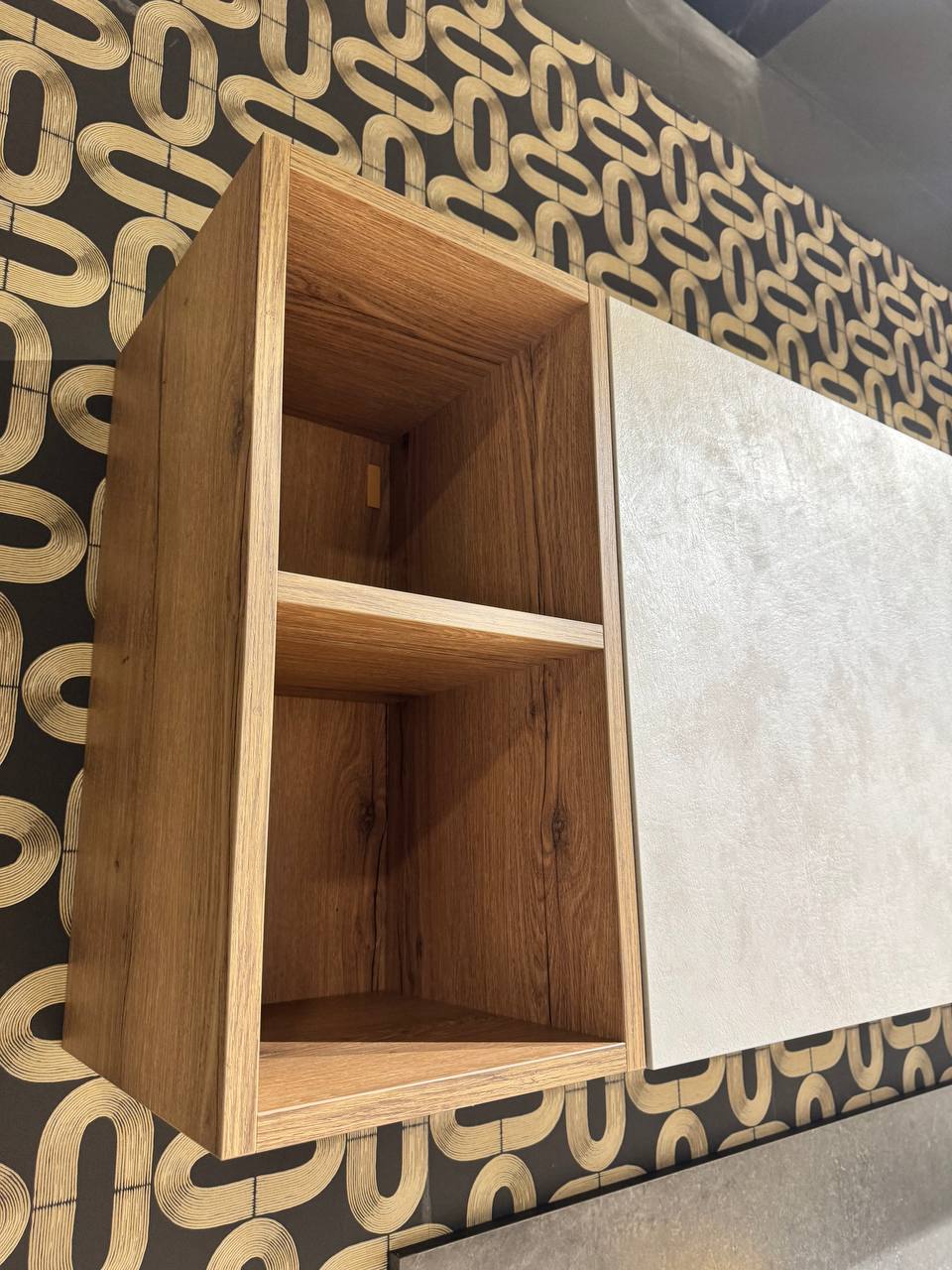 DETTAGLI E FINITURE: frontali colonne e basi in finitura cemento chiaro, maniglia integrata e zoccolo nero ossidato, Top laminato H 4 finitura grigio cemento scuro, tavolo penisola, elemento a giorno e terminale colonne in rovere nodato vintage.