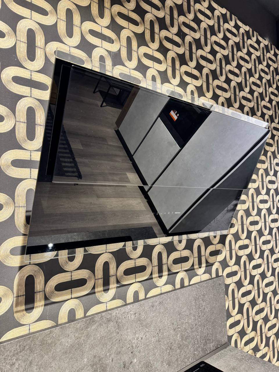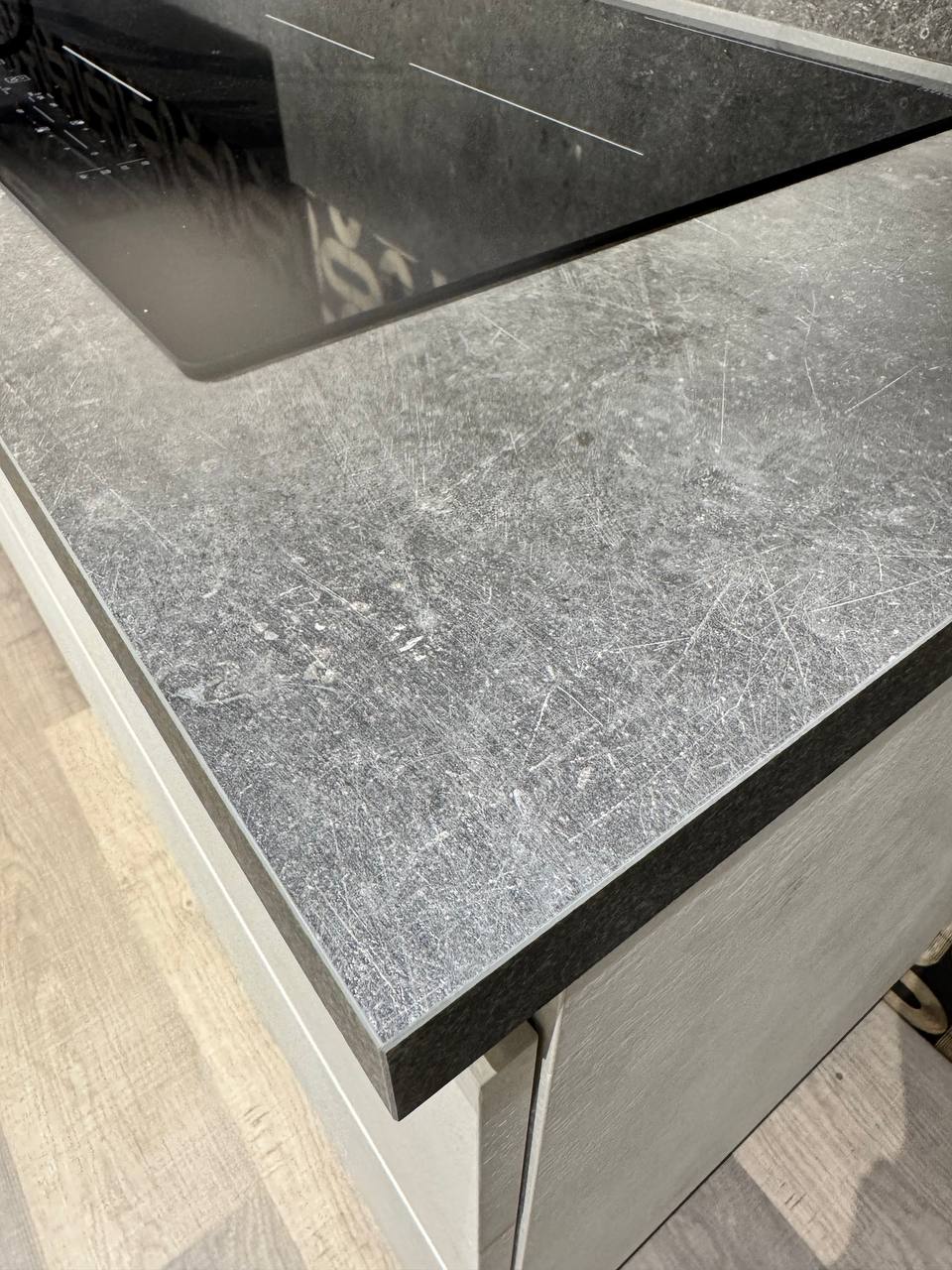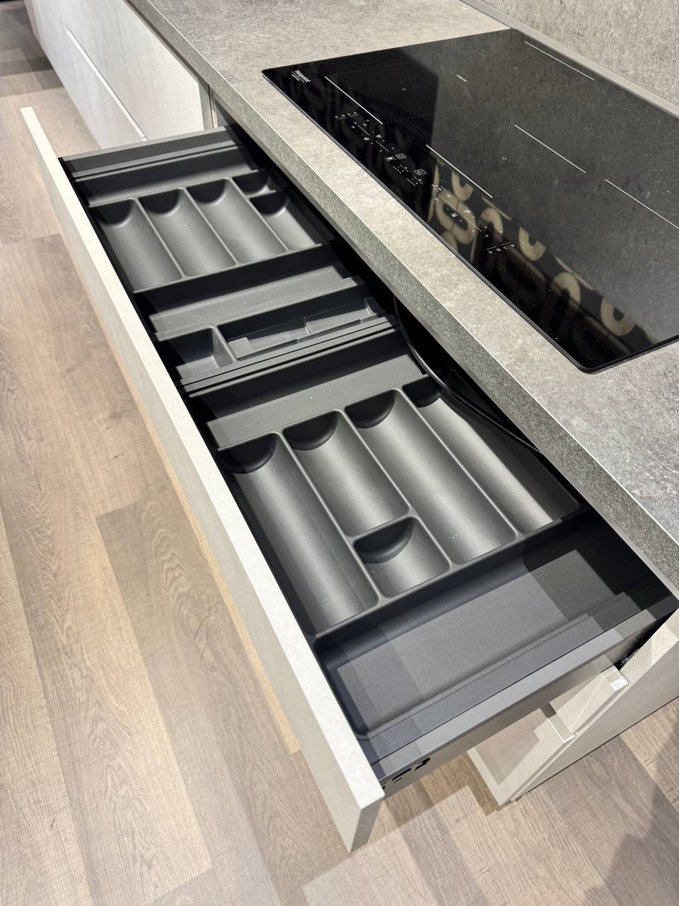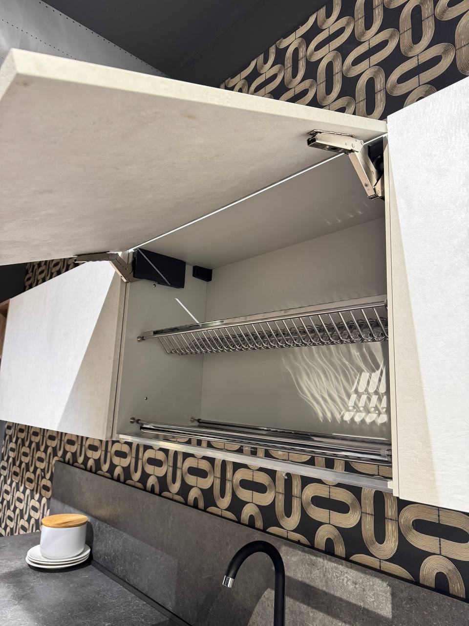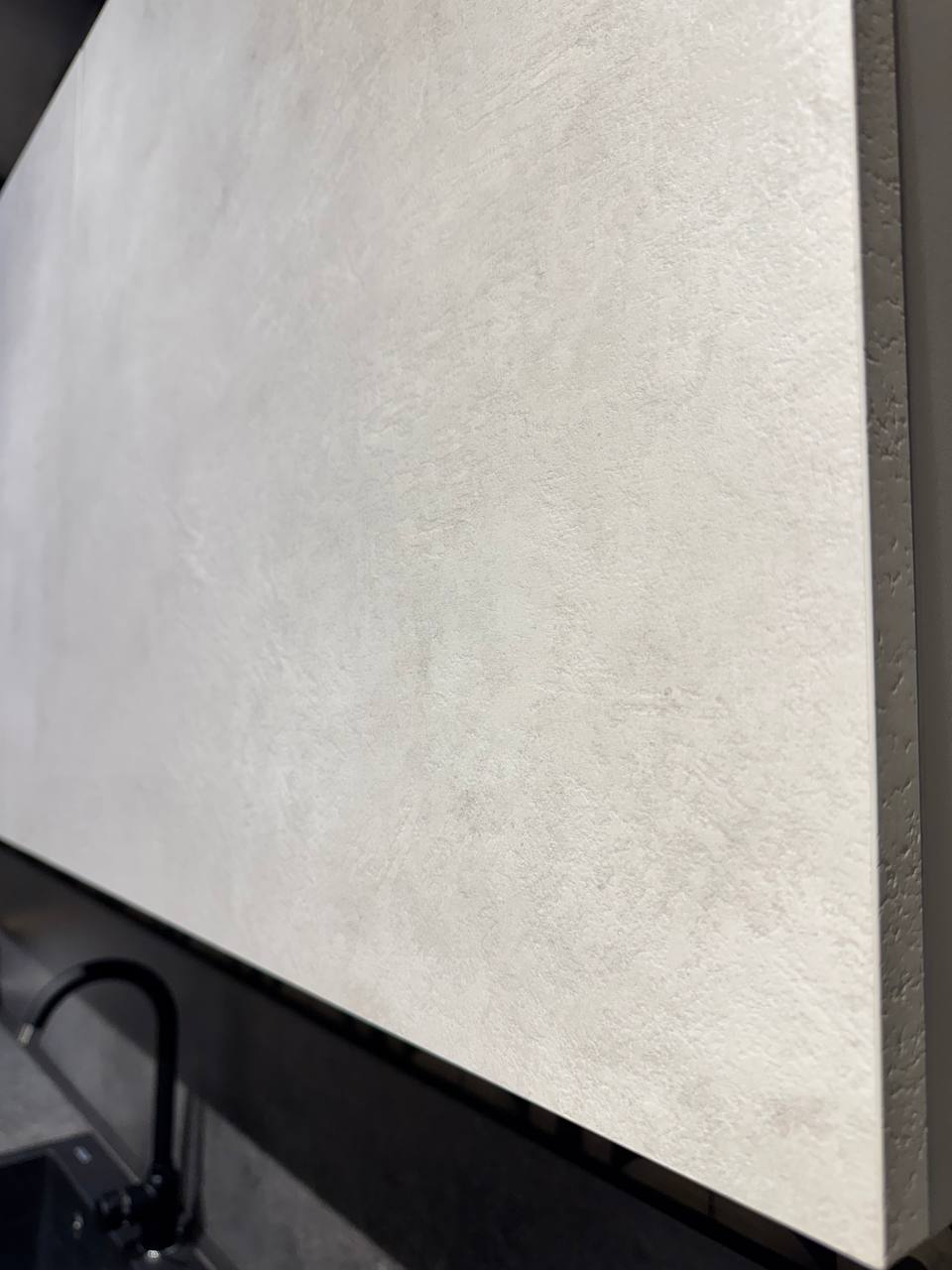 DETTAGLI E FINITURE: frontali colonne e basi in finitura cemento chiaro, maniglia integrata e zoccolo nero ossidato, Top laminato H 4 finitura grigio cemento scuro, tavolo penisola, elemento a giorno e terminale colonne in rovere nodato vintage.