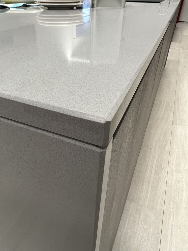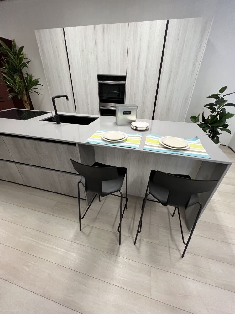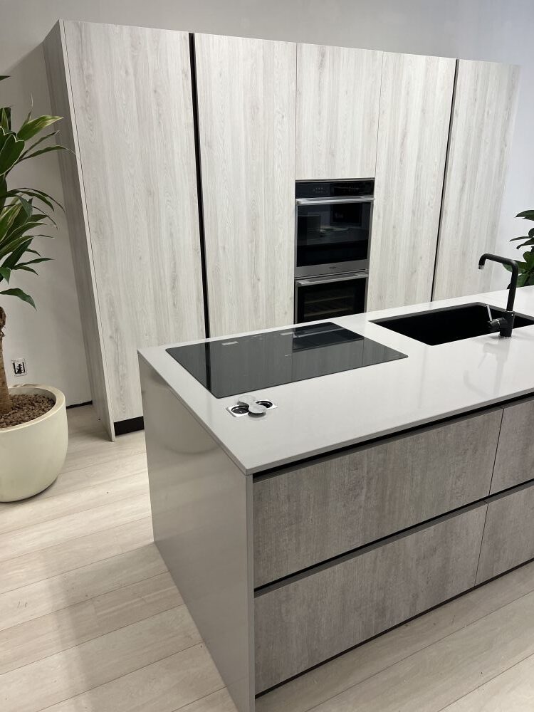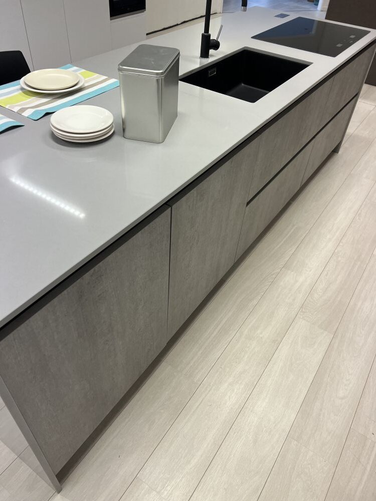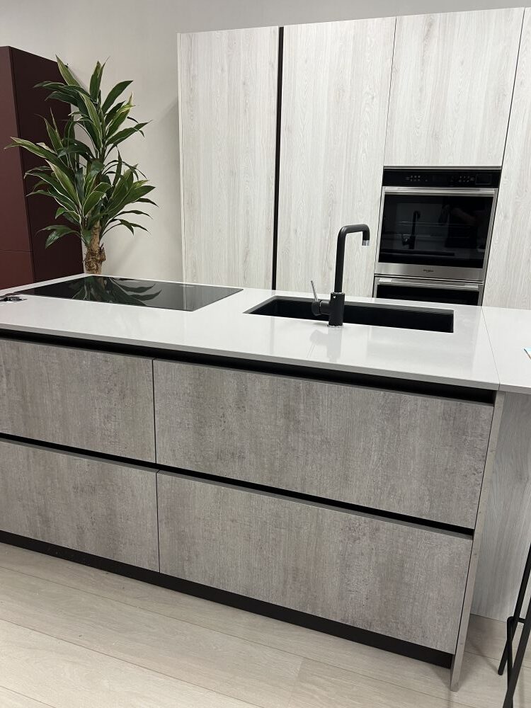 DETTAGLI E FINITURE: Frontali in finitura frassino chiaro e cemento chiaro, piano top isola e fianconi in quarzo Sp. 2 Cm, lavello e miscelatore Blanco