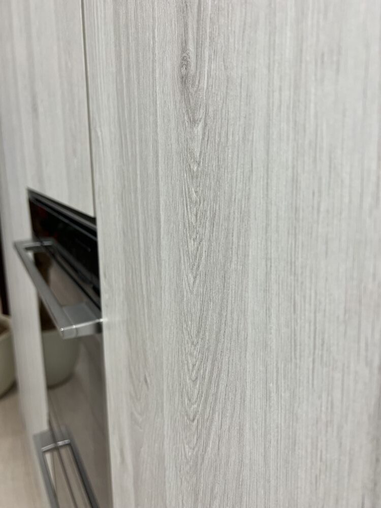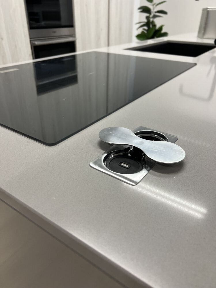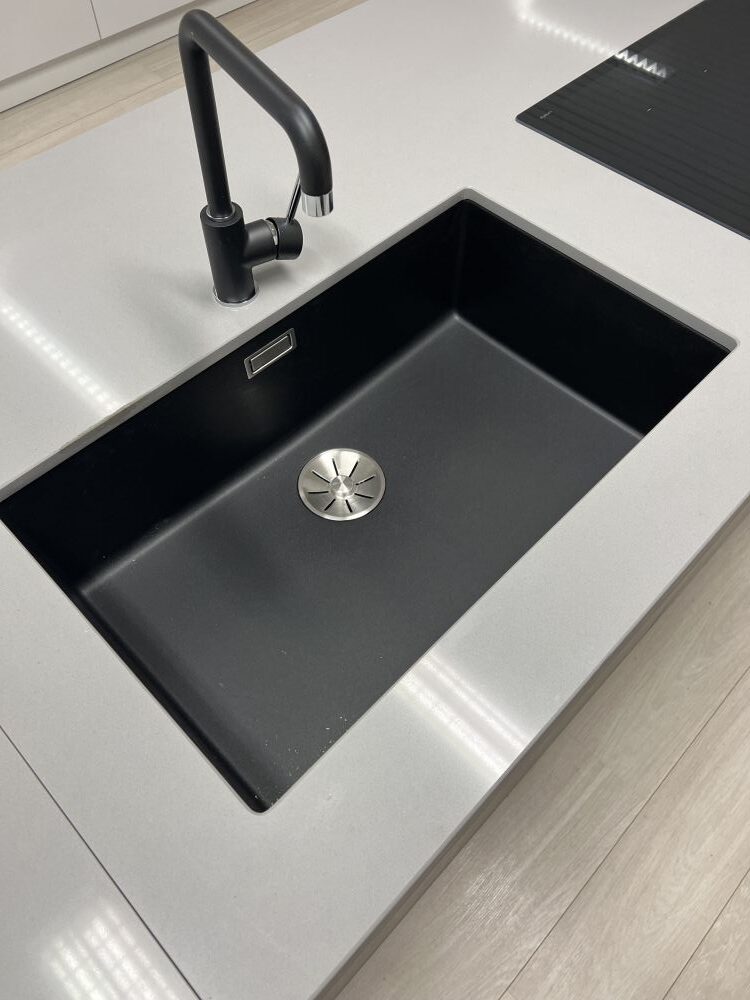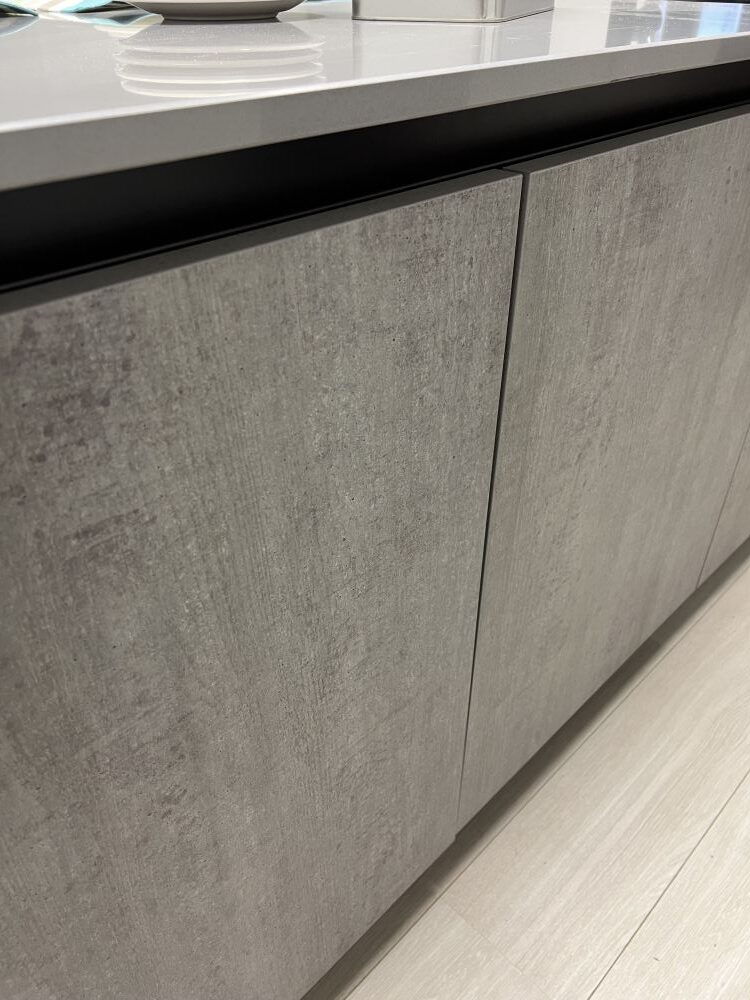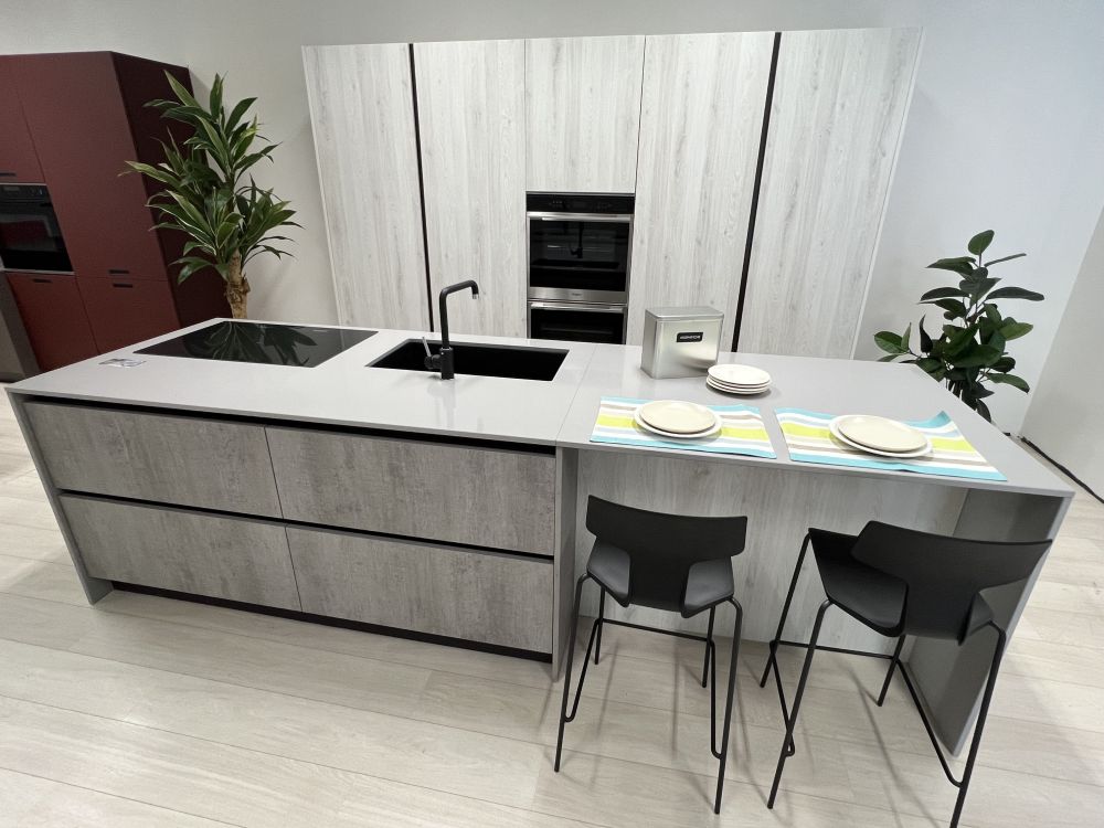 DETTAGLI E FINITURE: Frontali in finitura frassino chiaro e cemento chiaro, piano top isola e fianconi in quarzo Sp. 2 Cm, lavello e miscelatore Blanco