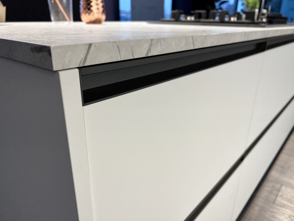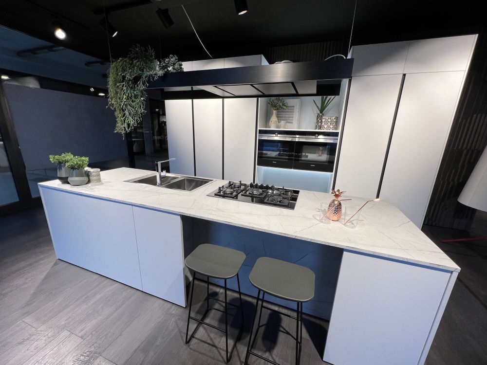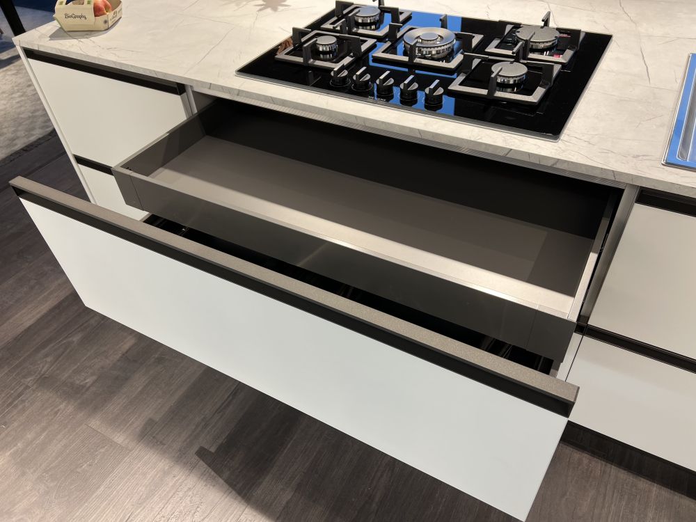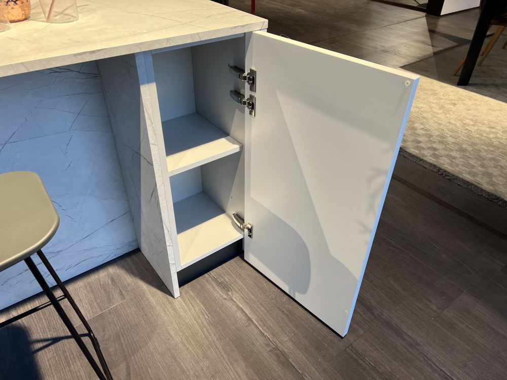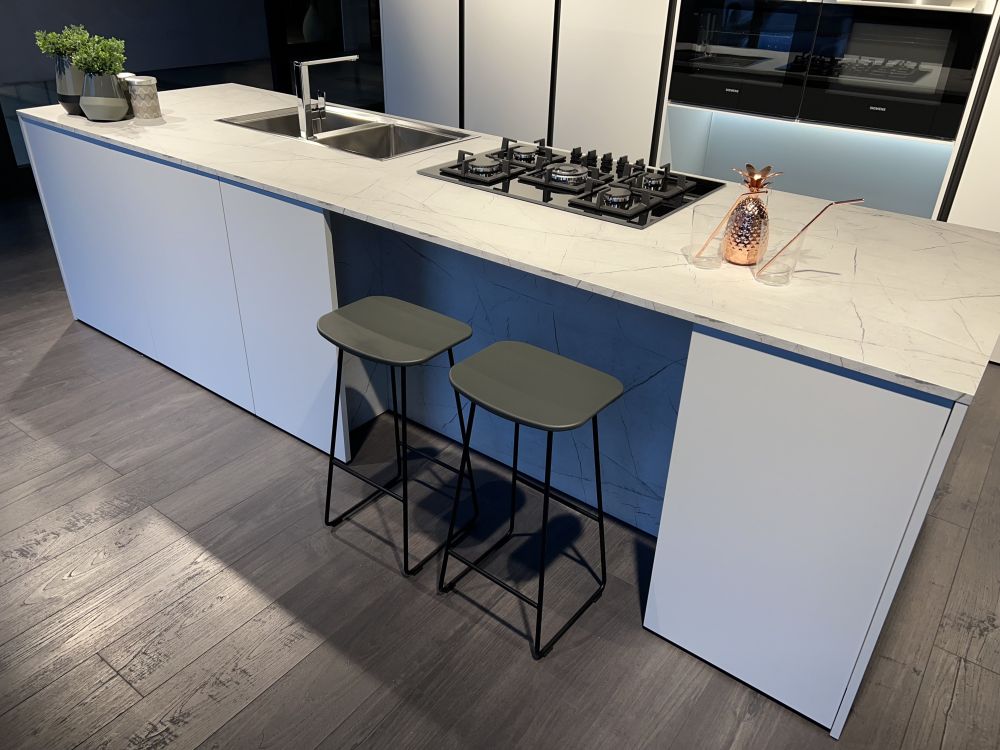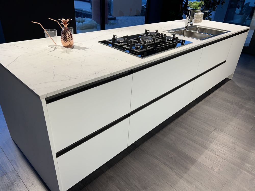 DETTAGLI E FINITURE: finitura bianco, piano top laminato, fondo schienale vetro magnetico luminoso. Ante a terra parete colonne e basi isola. Ripiani interni colonna luminosi.