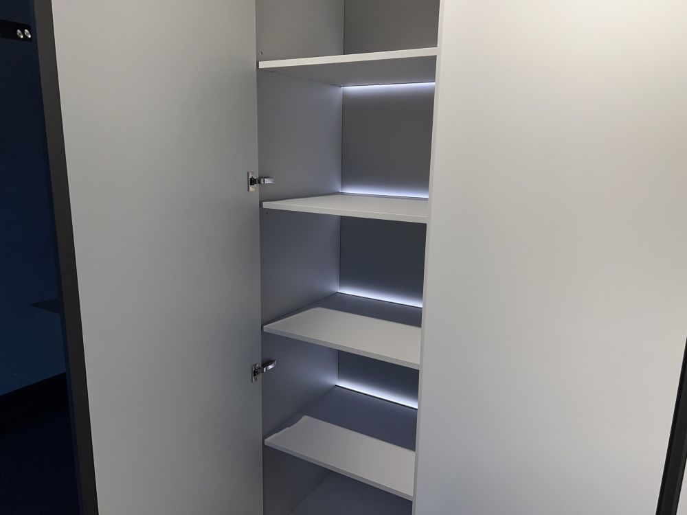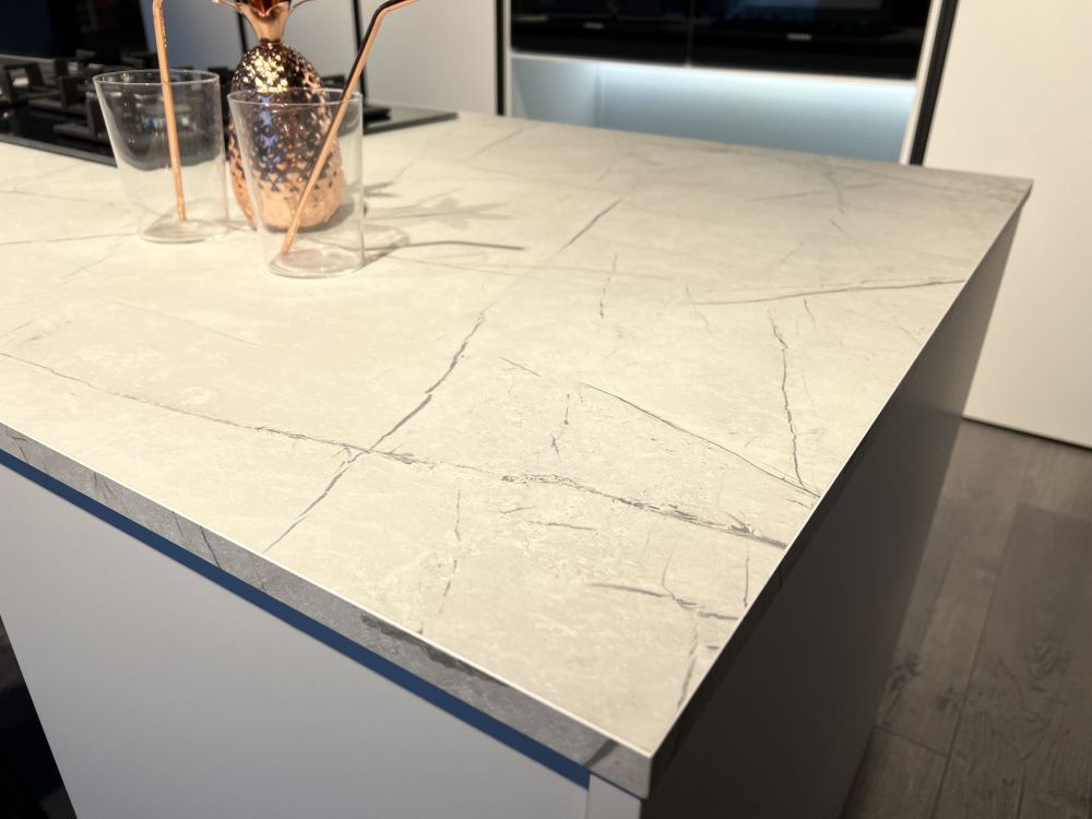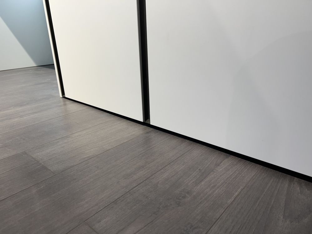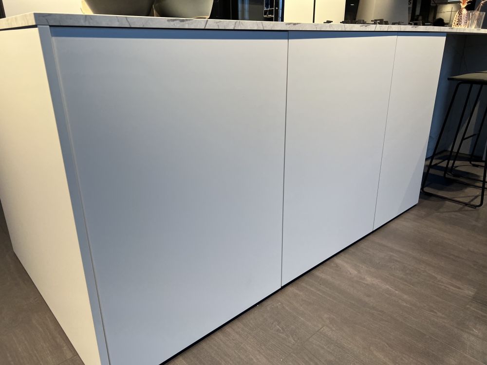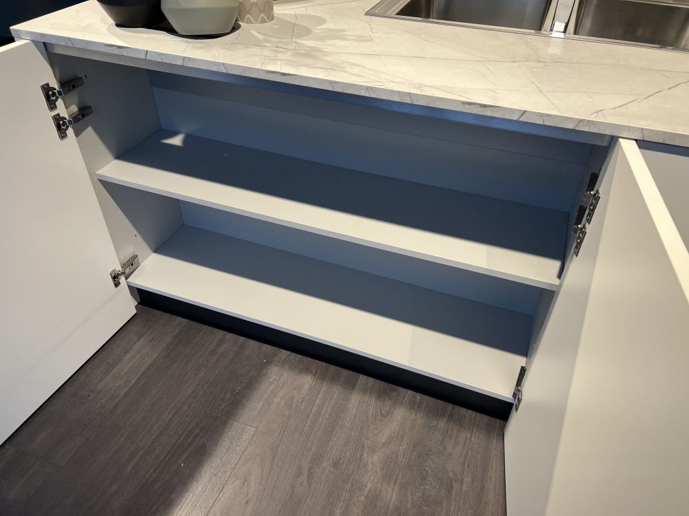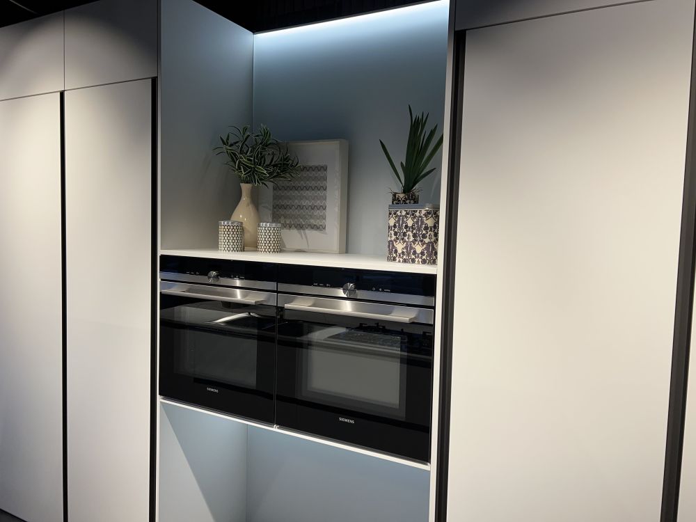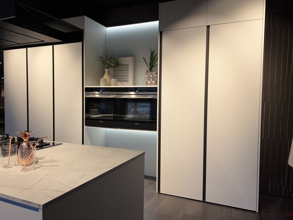 DETTAGLI E FINITURE: finitura bianco, piano top laminato, fondo schienale vetro magnetico luminoso. Ante a terra parete colonne e basi isola. Ripiani interni colonna luminosi.