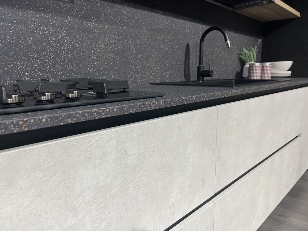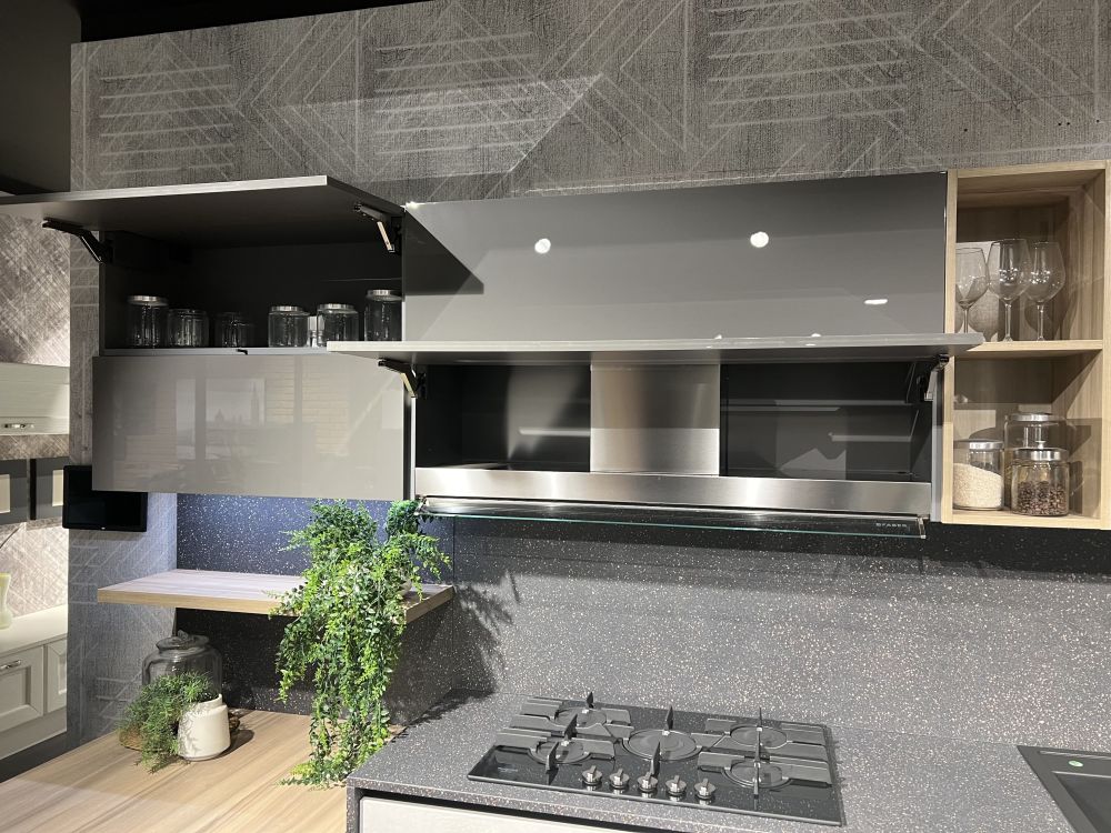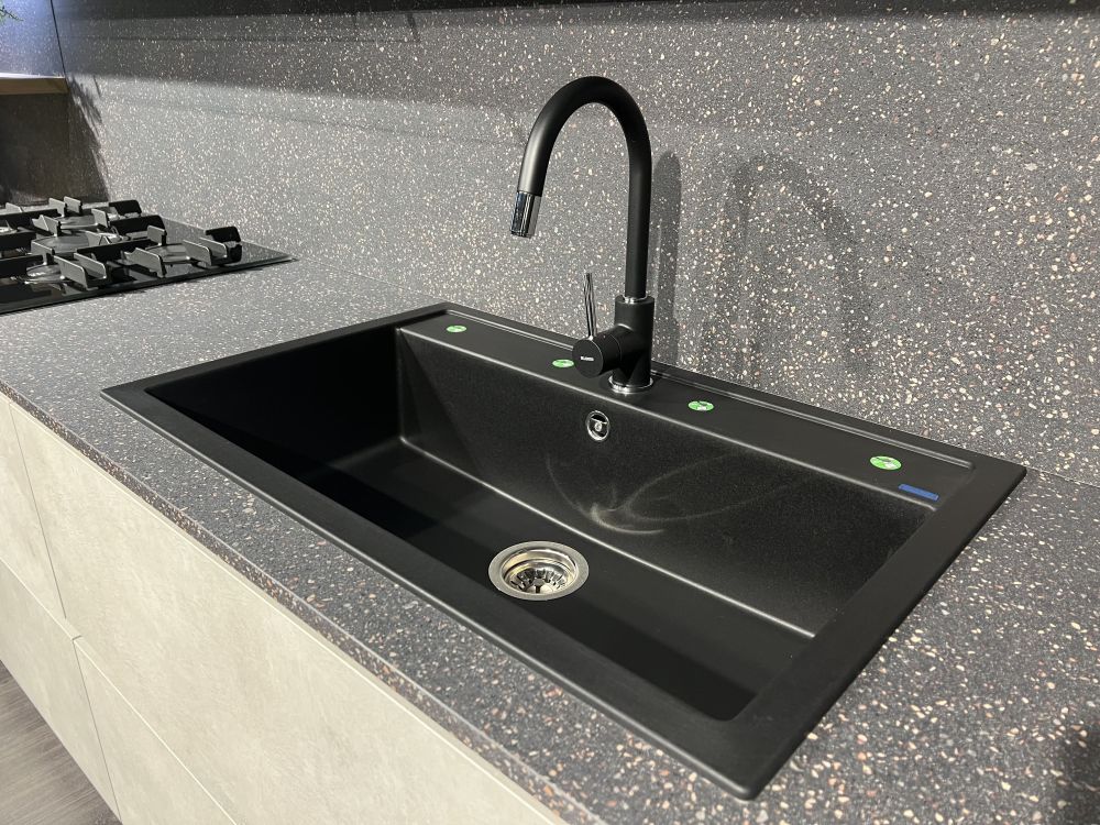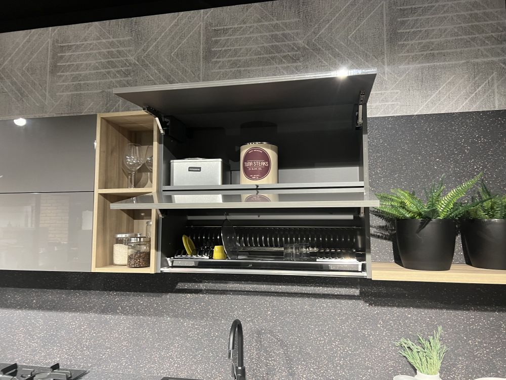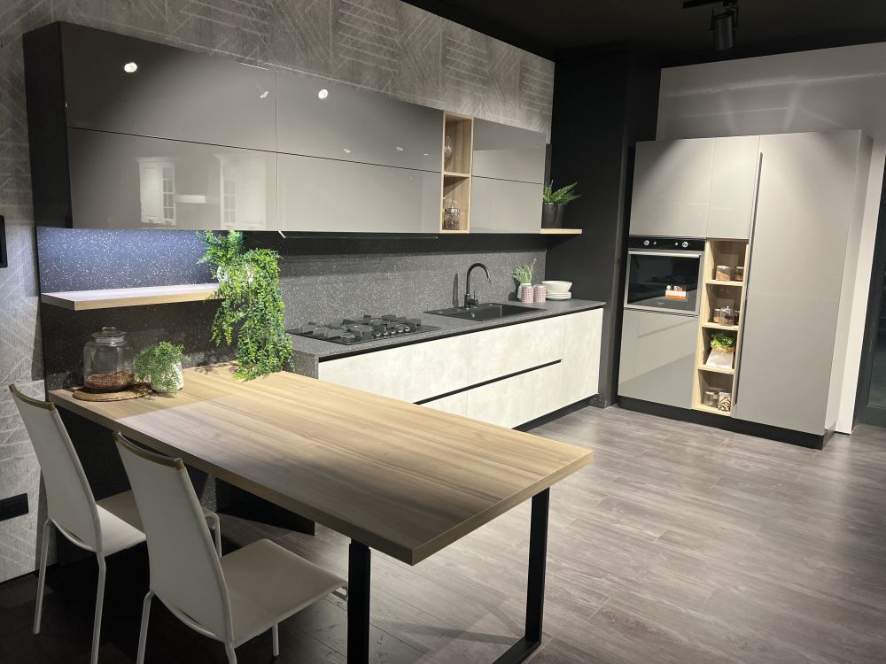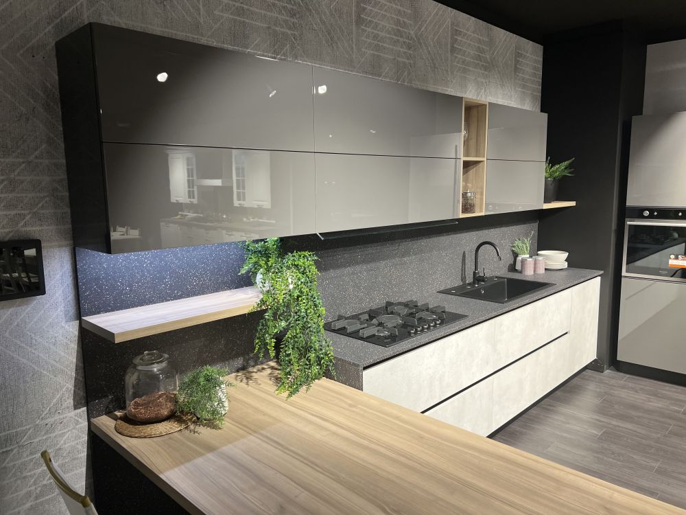 DETTAGLI E FINITURE: basi finitura platino, colonne e pensili Laccato UV lucido grigio, top e schienale Sp2 Laminato. Piano Penisola spessore 4 Cm finitura rovere. Lavello Blanco Dalago nero e miscelatore Blanco Mida con doccetta