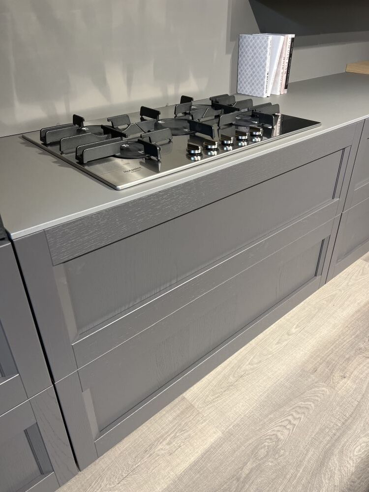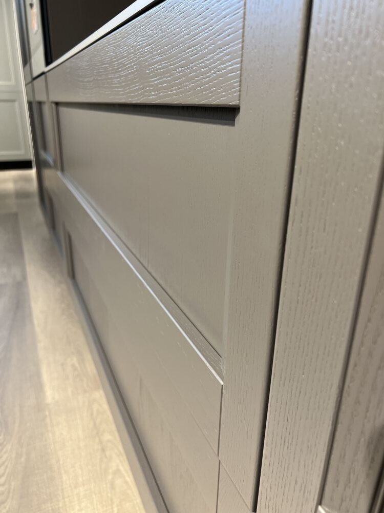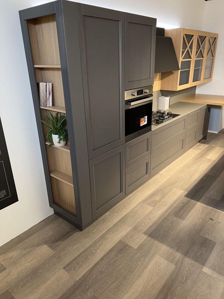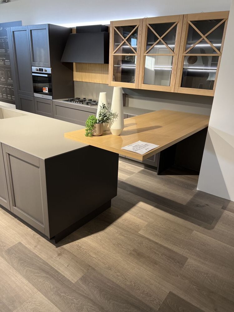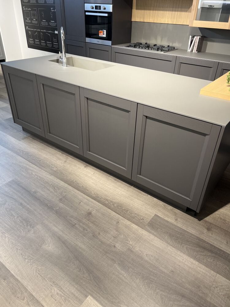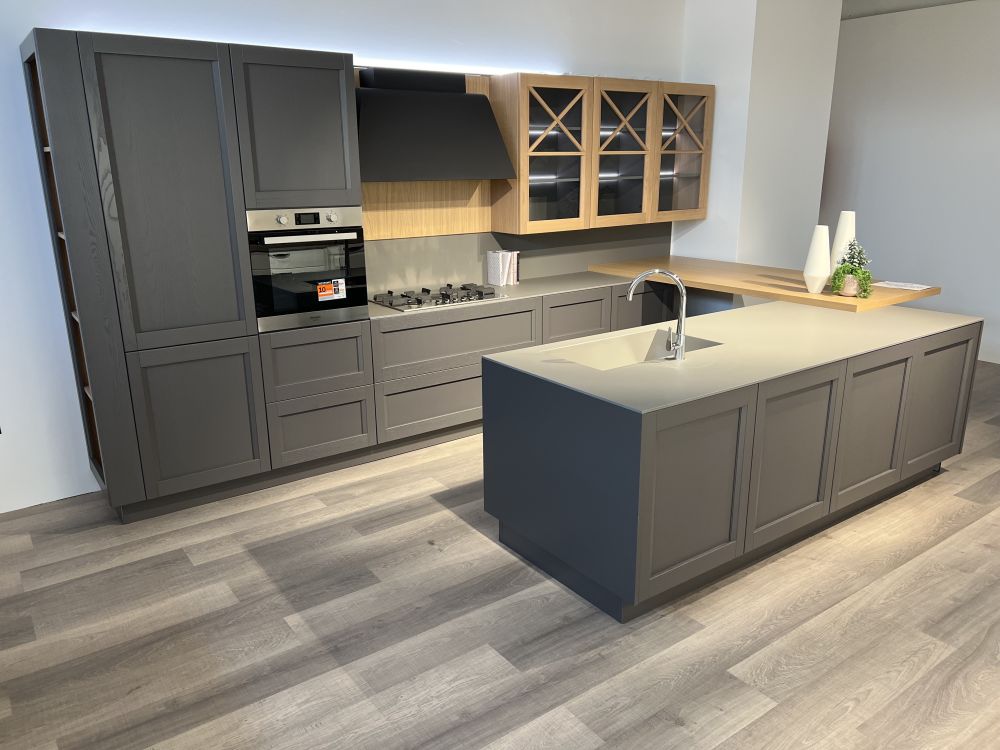 DETTAGLI E FINITURE: Basi e colonne in fin. legno laccato Vulcano Poro Aperto, Pensili e Piano Snack impiallacciato legno fin. Brandy 491, Top sp. 1.2 in HPL cm in fin. Grigio Londra Full color 967, Zoccolo H 12 fin. Vulcano. Lavello 1 vasca integrata al piano con fondo in inox, Rubinetto Gessi mod. Proton Cromo