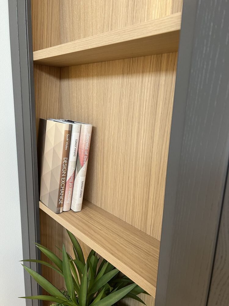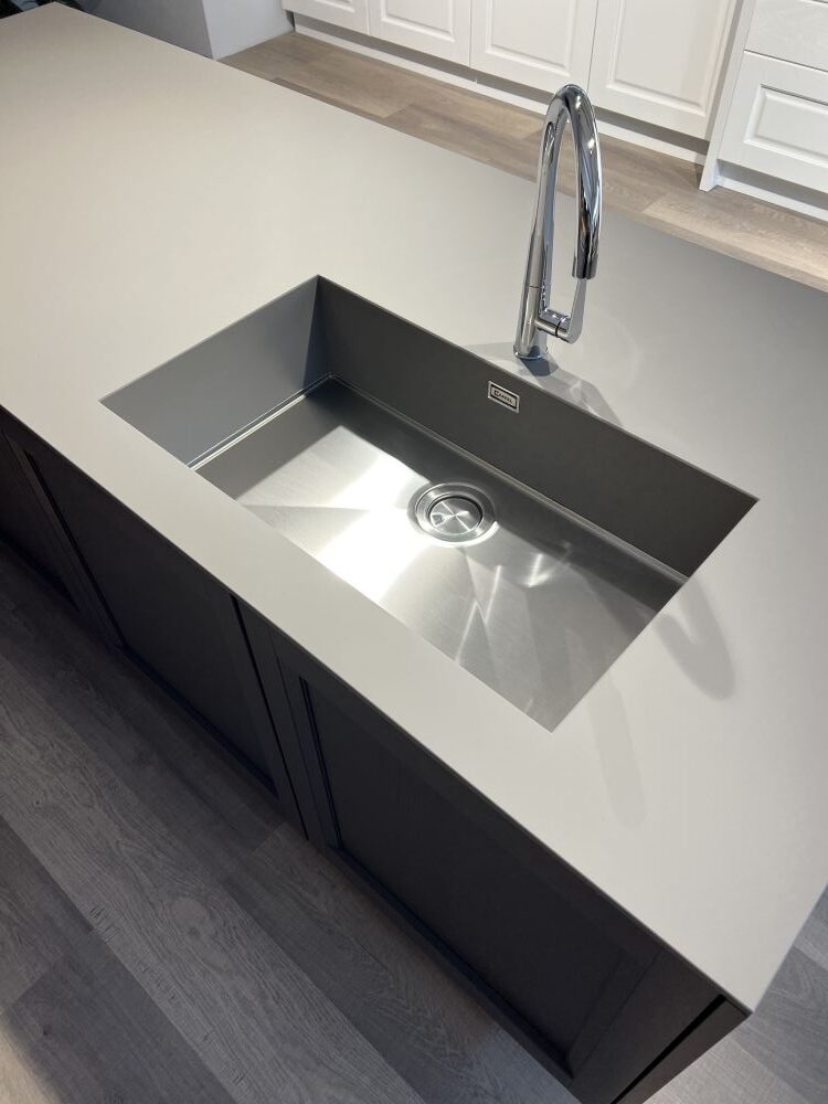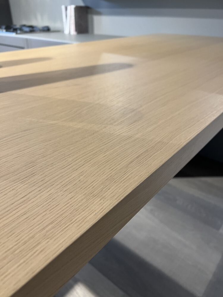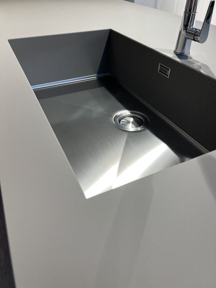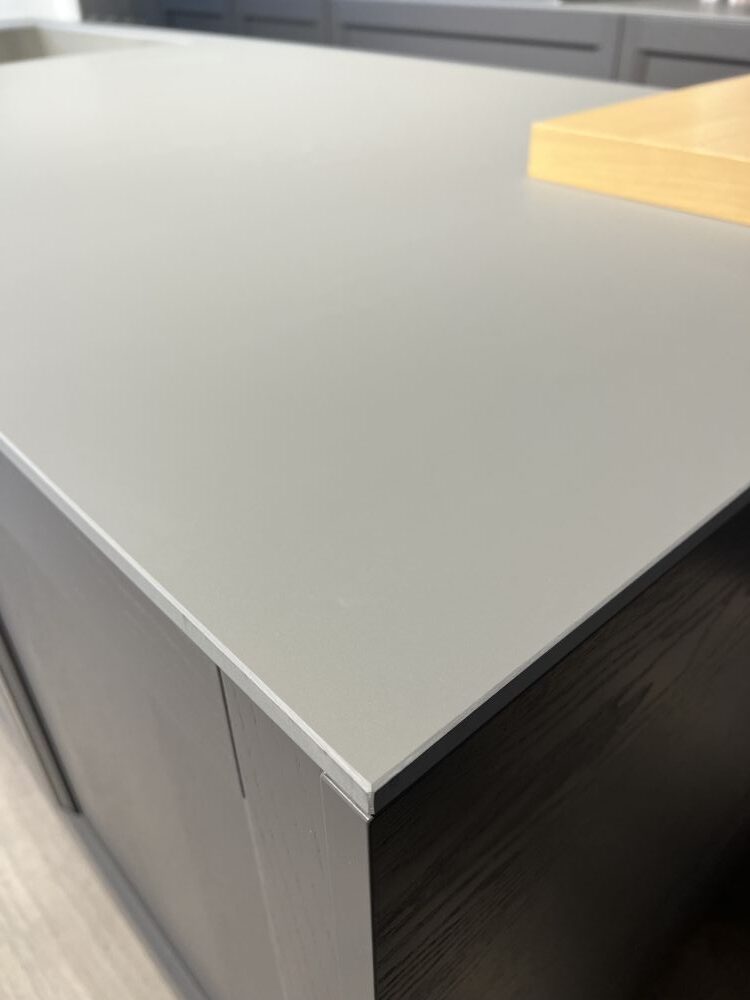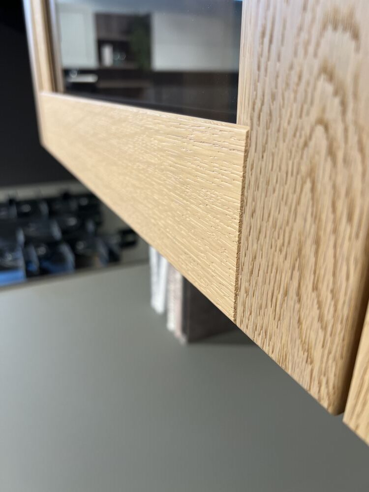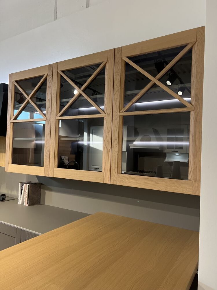 DETTAGLI E FINITURE: Basi e colonne in fin. legno laccato Vulcano Poro Aperto, Pensili e Piano Snack impiallacciato legno fin. Brandy 491, Top sp. 1.2 in HPL cm in fin. Grigio Londra Full color 967, Zoccolo H 12 fin. Vulcano. Lavello 1 vasca integrata al piano con fondo in inox, Rubinetto Gessi mod. Proton Cromo