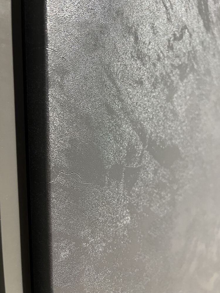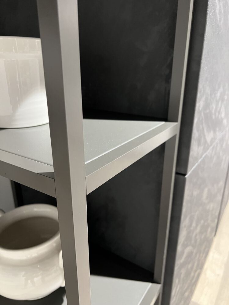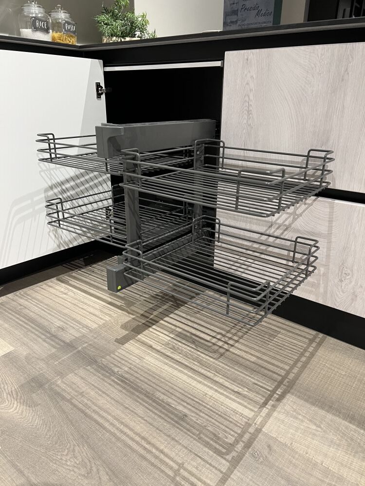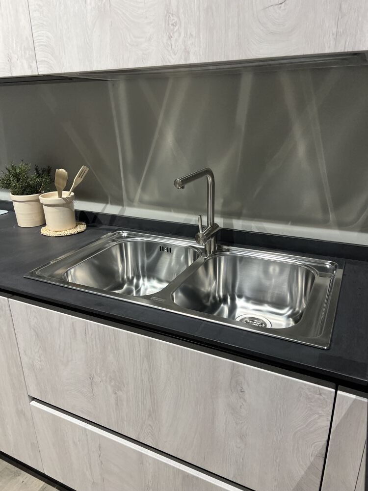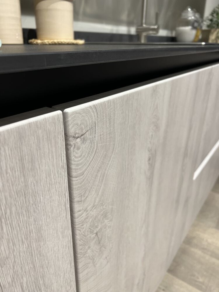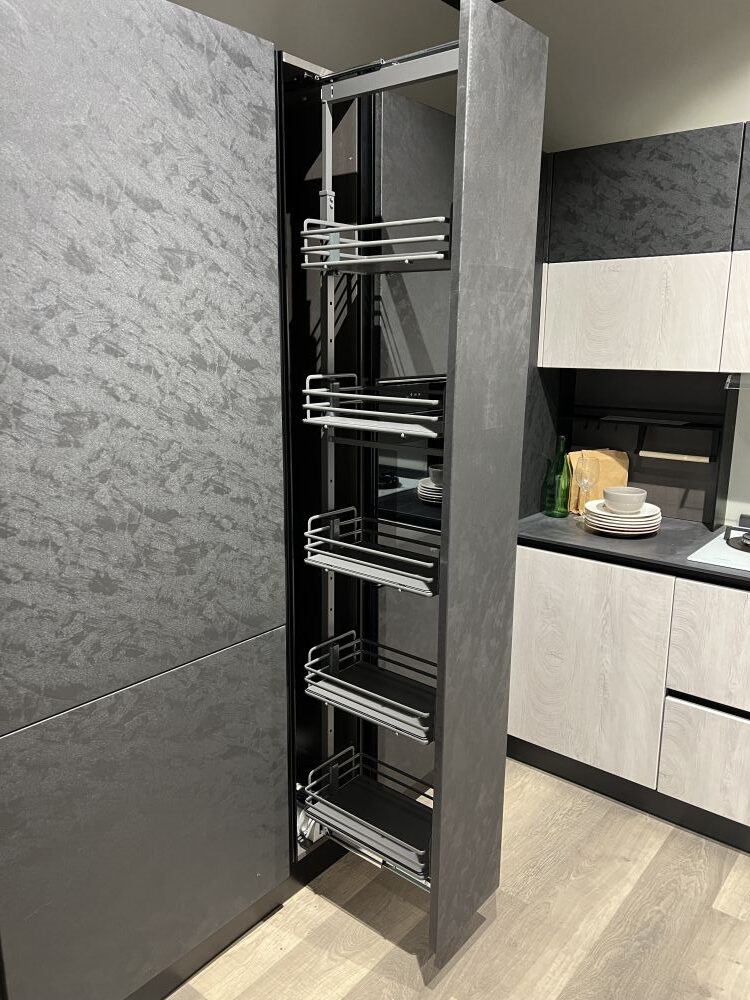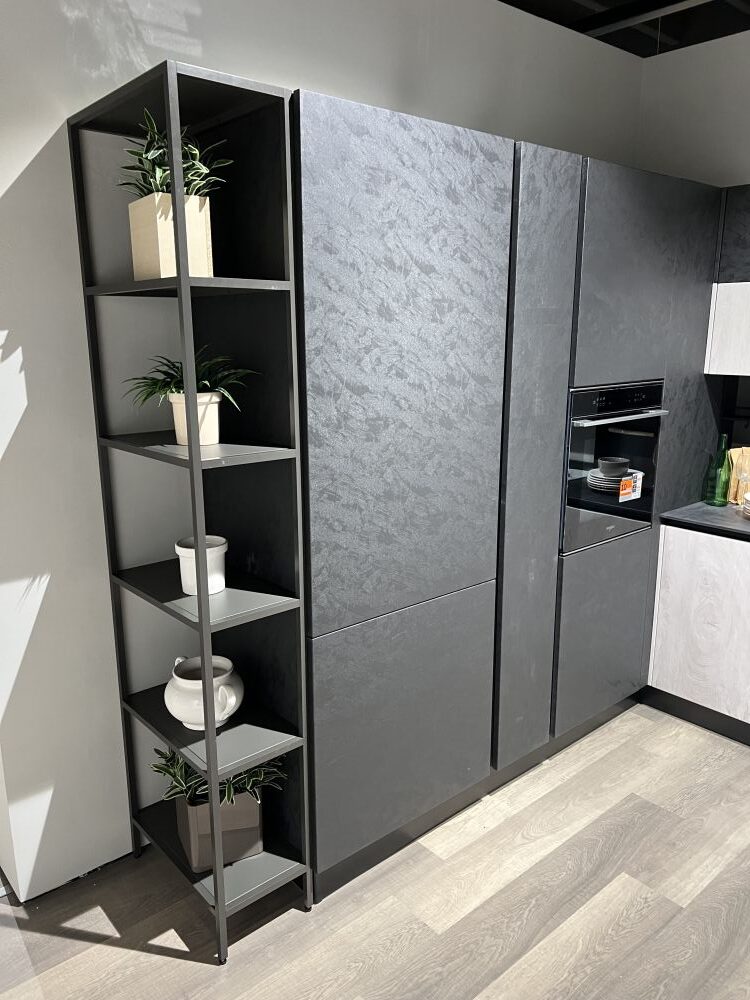 DETTAGLI E FINITURE: colonne/pensili finitura cemento nero, ante pensili e basi quercia ghiaccio ,Elementi a giorno antracite, piano H 1,2 GRES PROJECT. Cappa ELICA BOX-IN , lavello 2 vasche Franke inox con miscelatore Franke. Meccanismi ante e cestoni Blum