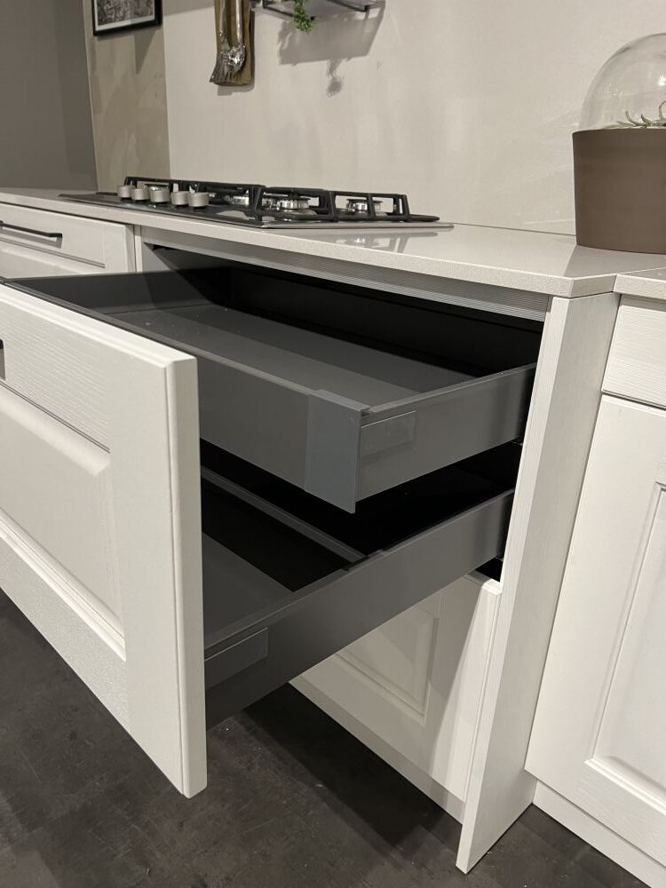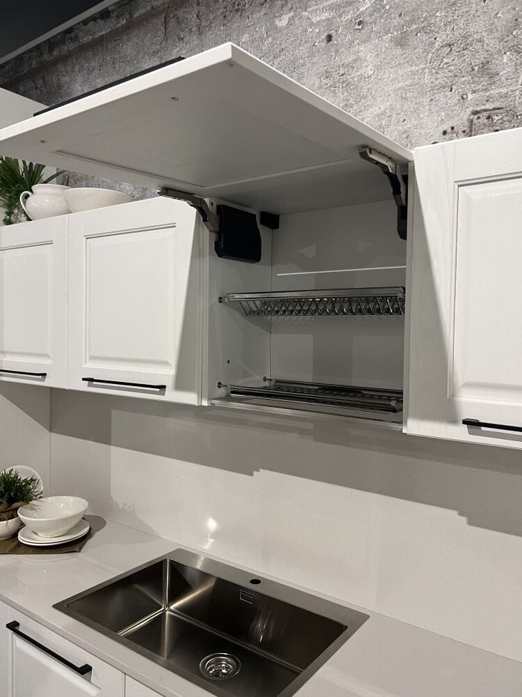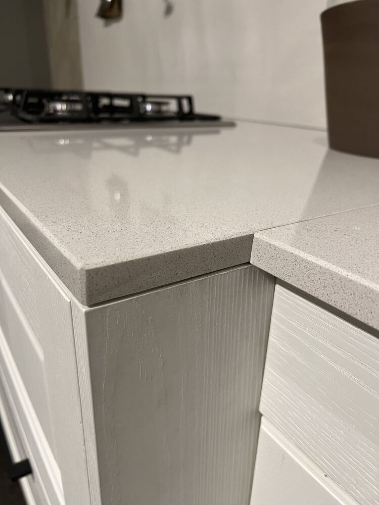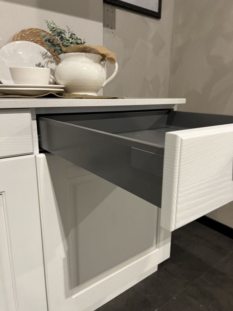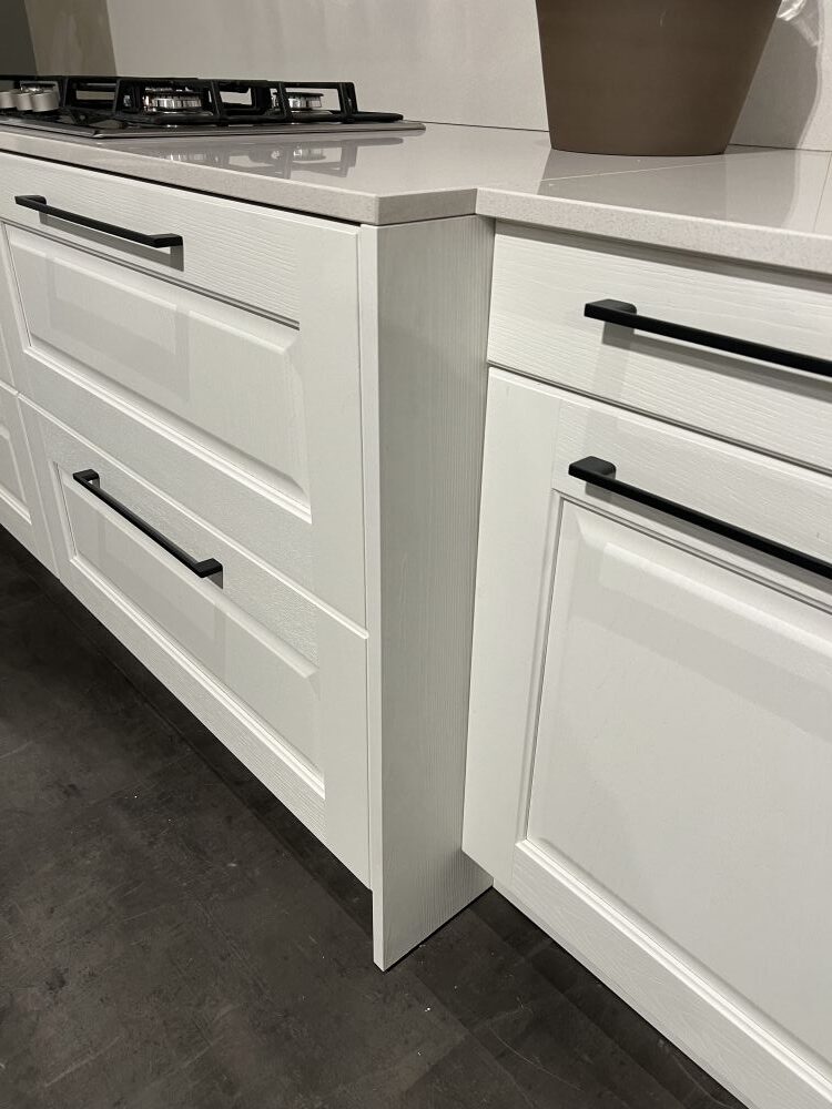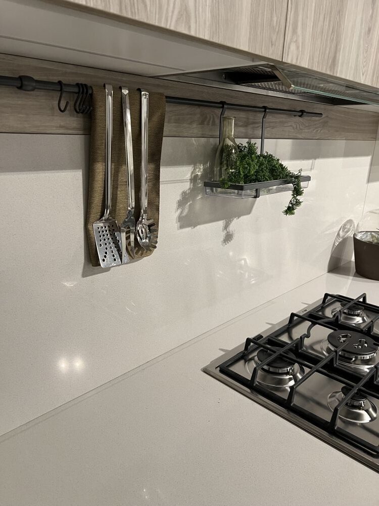 DETTAGLI E FINITURE: ante telaio in legno bianco candido con tre pensili rovere sabbia, piano top e schienale quarzo sp. 2 cm, led sotto pensile lato piano cottura, barra porta utensili. Maniglia colore antracite