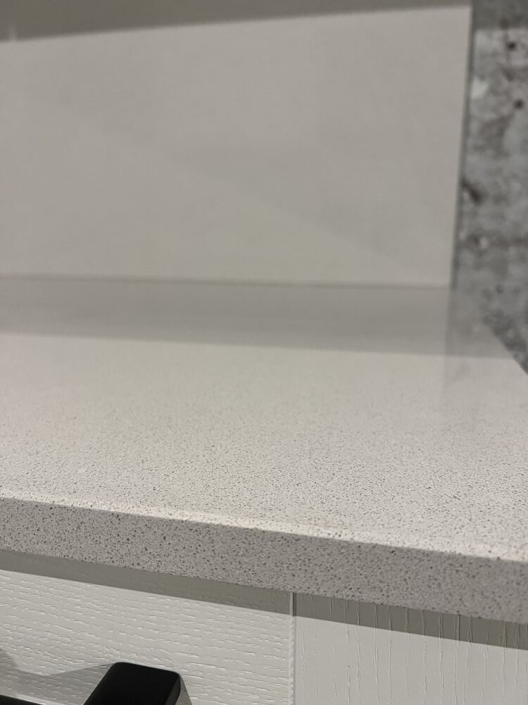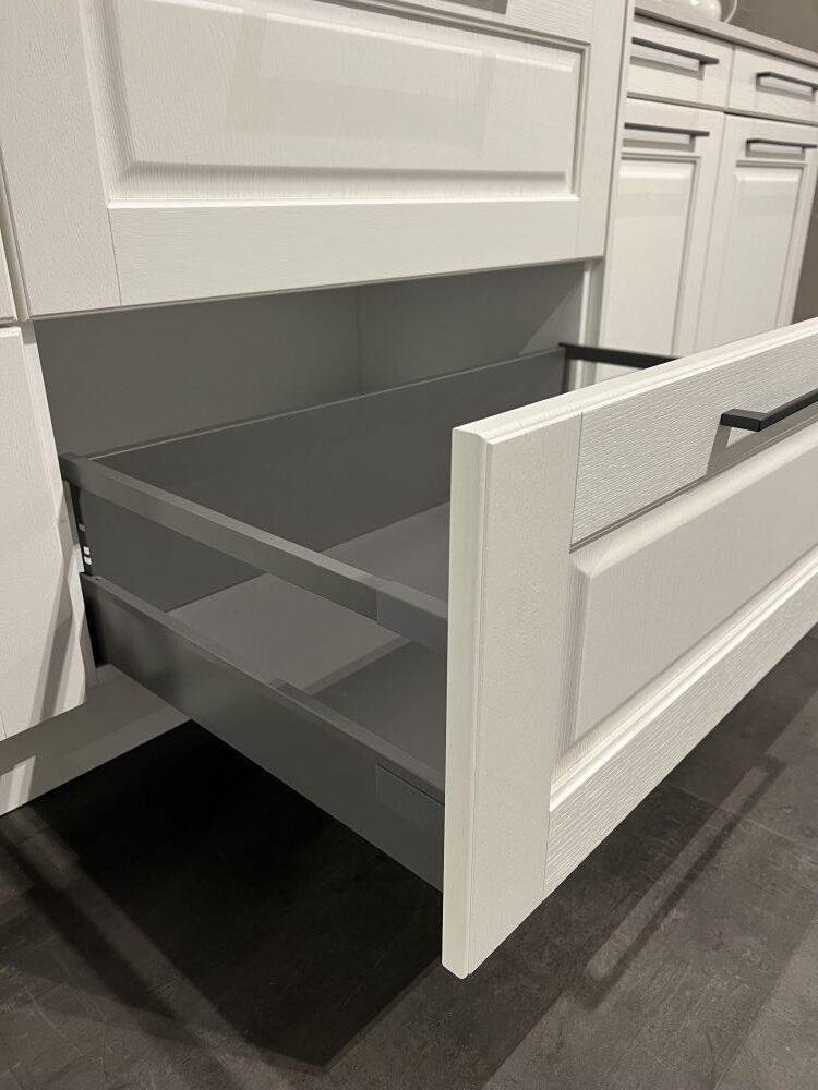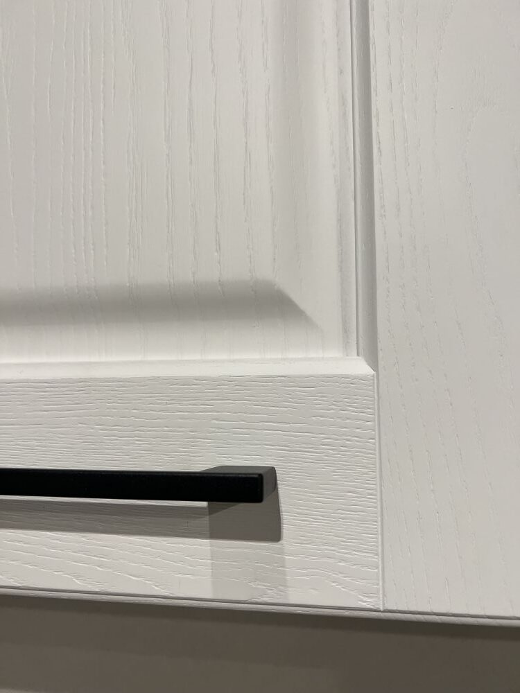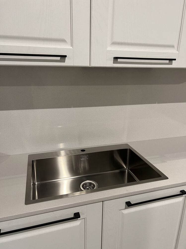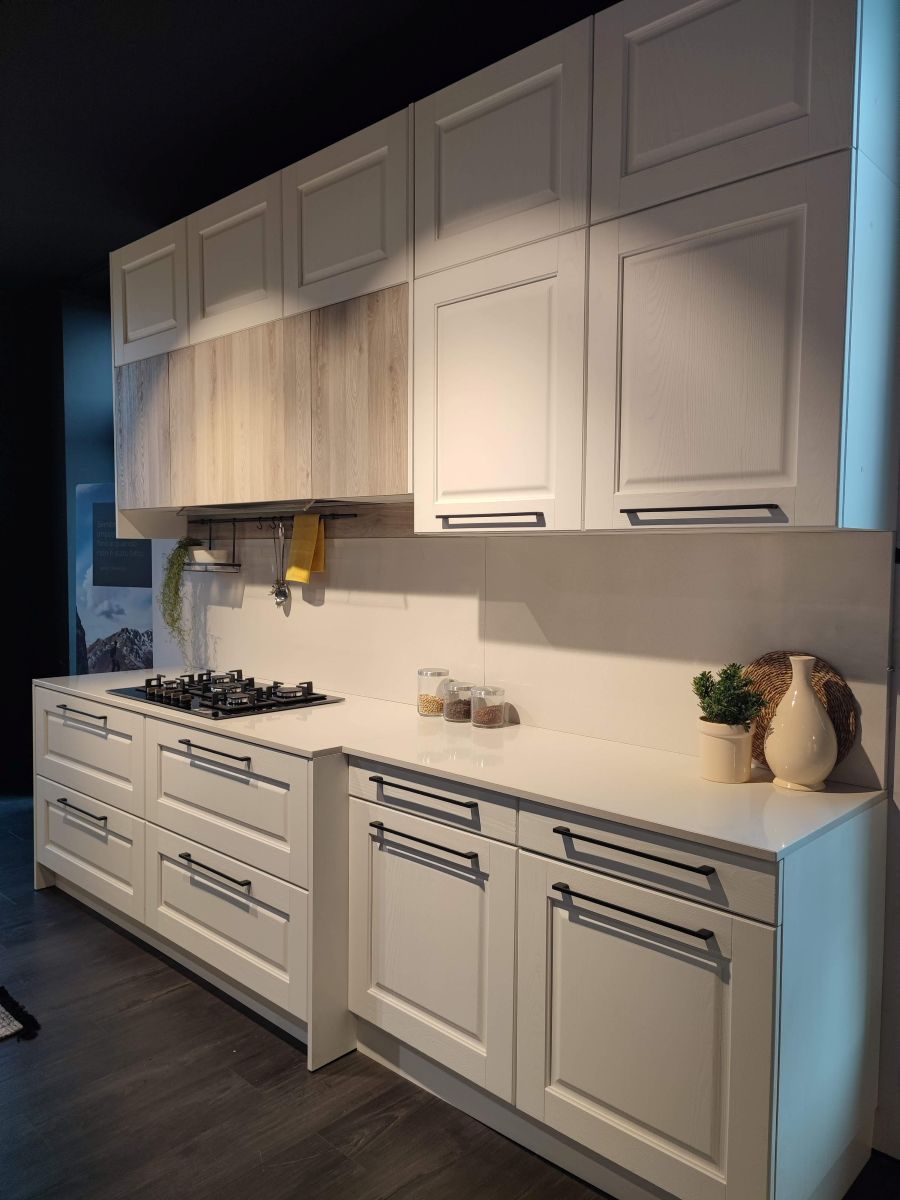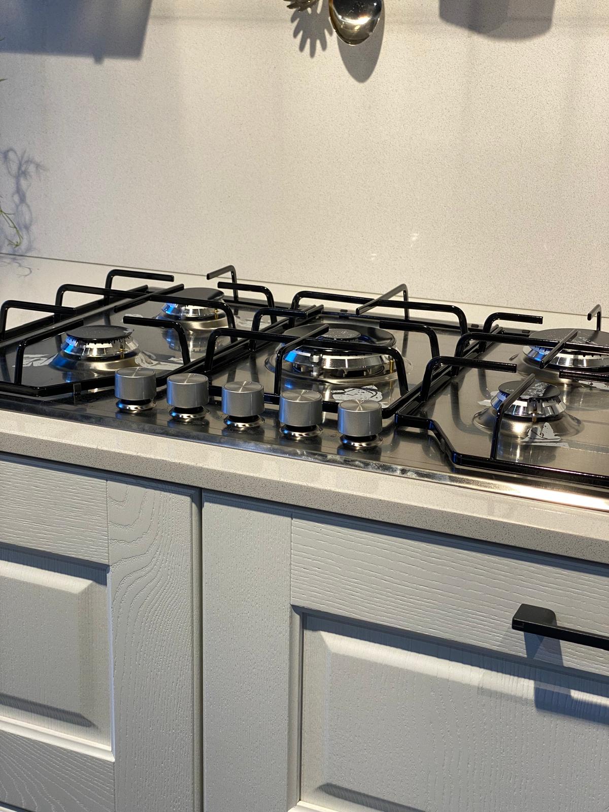 DETTAGLI E FINITURE: ante telaio in legno bianco candido con tre pensili rovere sabbia, piano top e schienale quarzo sp. 2 cm, led sotto pensile lato piano cottura, barra porta utensili. Maniglia colore antracite