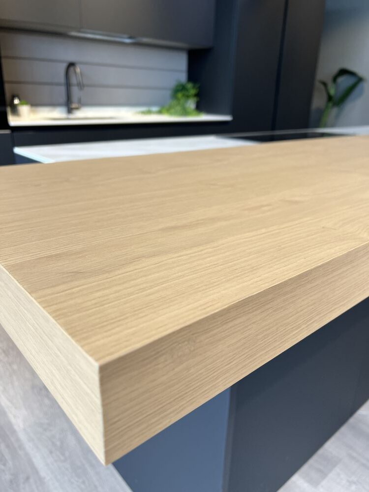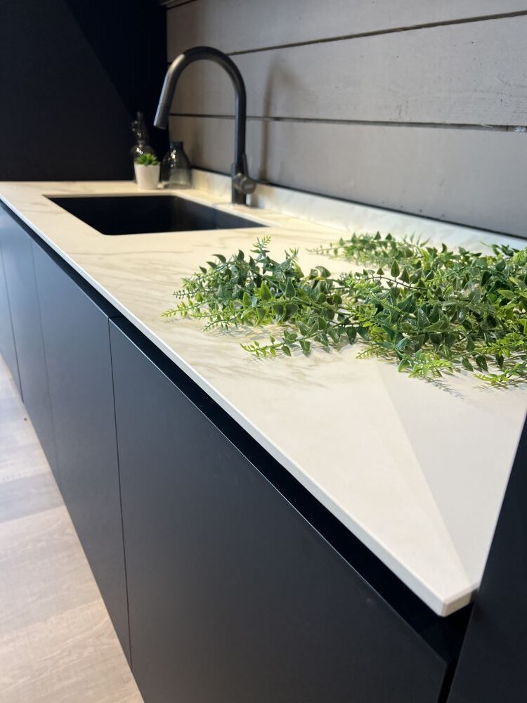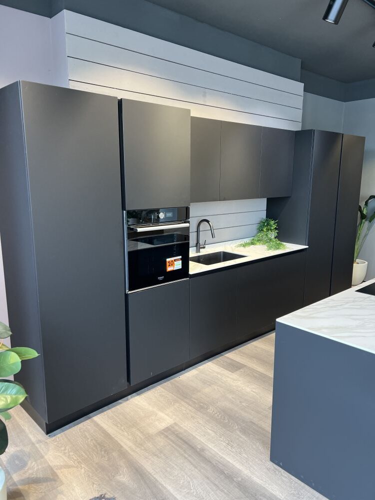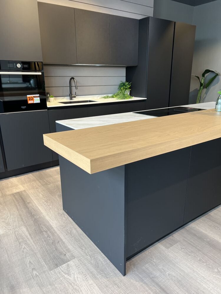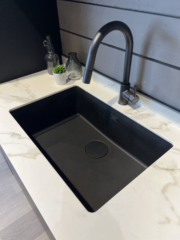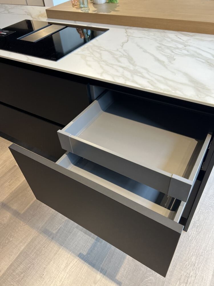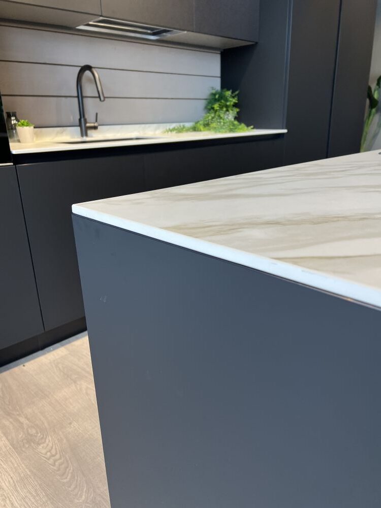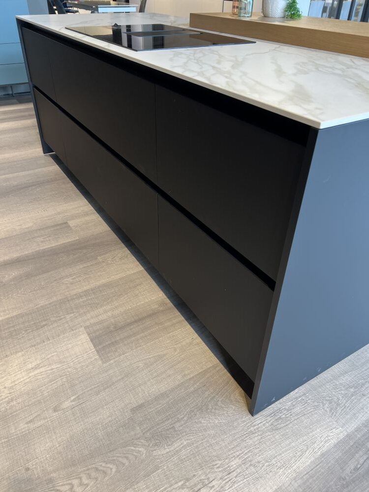 DETTAGLI E FINITURE: finitura nero matt, top sp. 1,2 cm in Gres Royal calacatta. Lavello Franke vasca unica sottotop con relativo miscelatore nero mod. Lina. Snack in finitura legno rovere L 180 x 50 x 6 cm (spostabile)