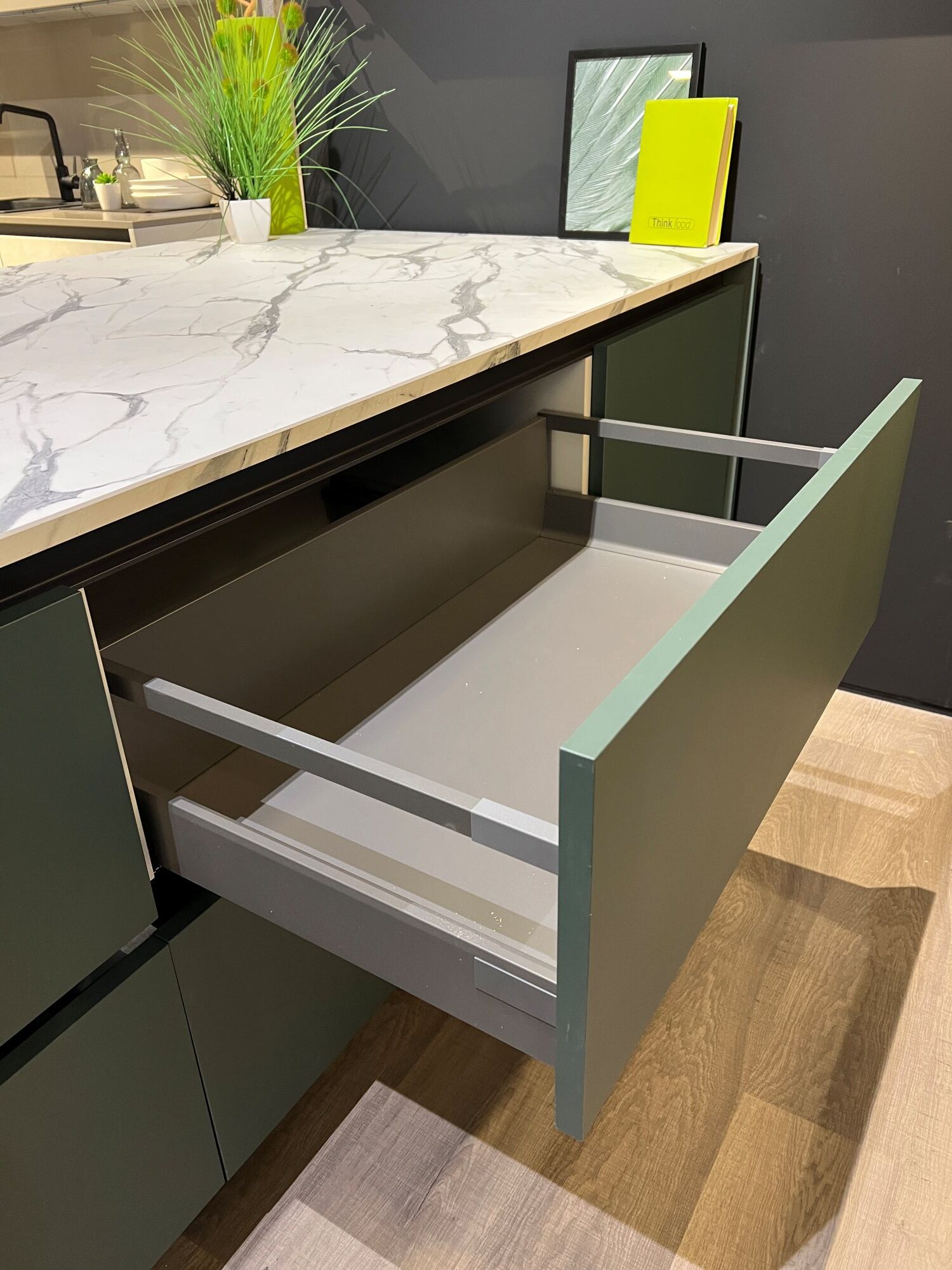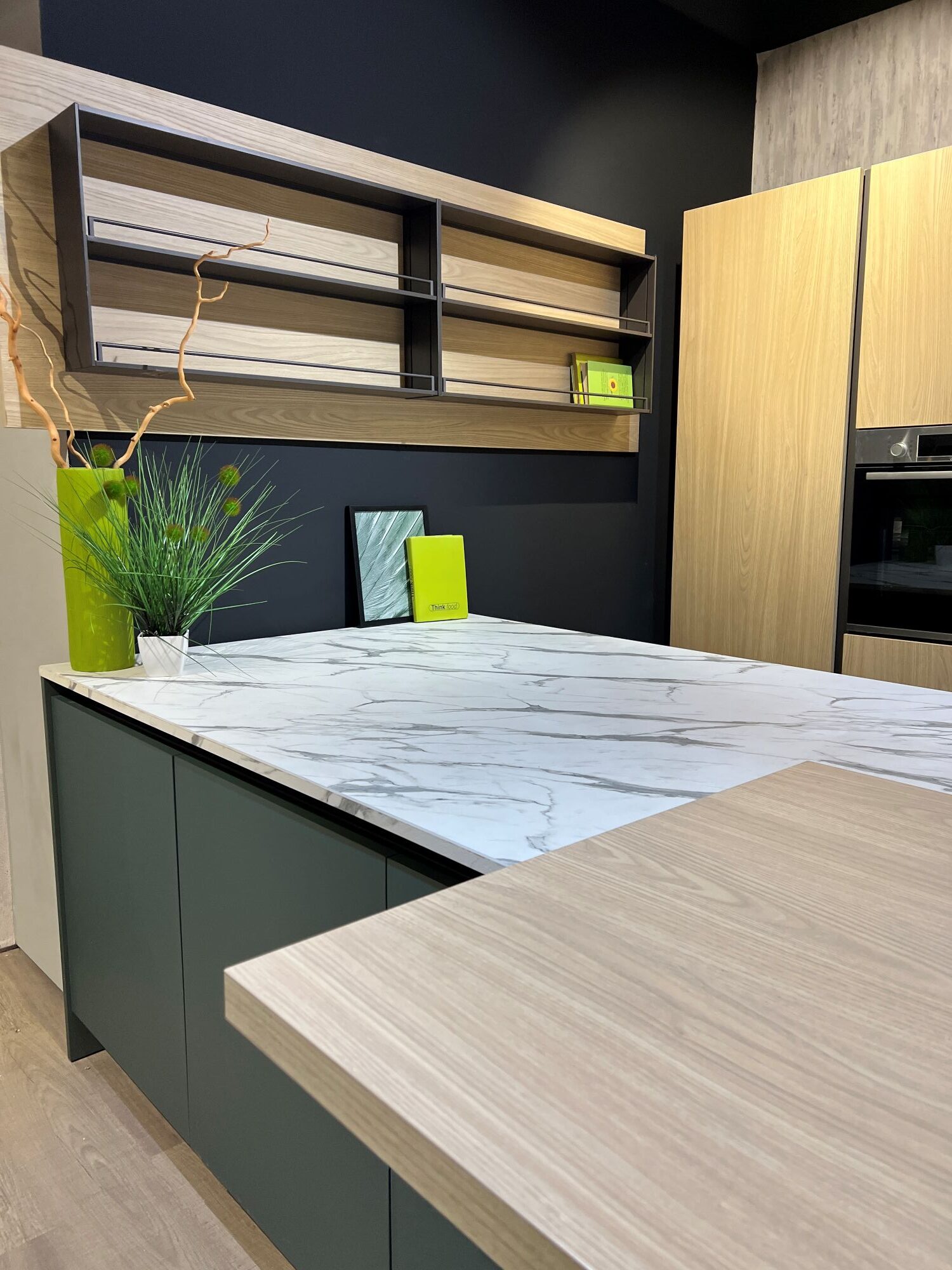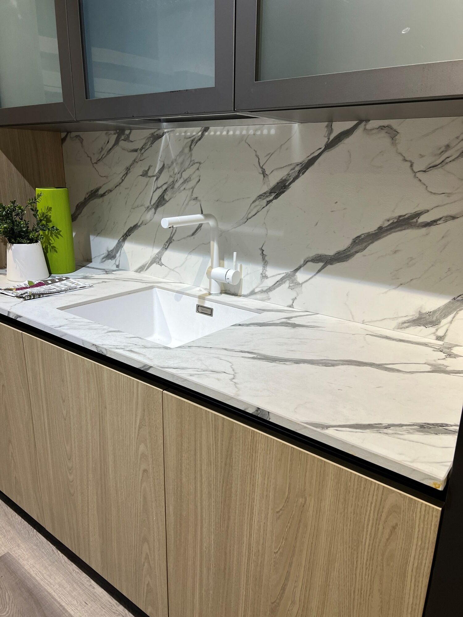 DETTAGLI E FINITURE: basi fin. verde lauro pet e colonne finitura rovere anice ,pensili in vetro, zoccolo h. 12 piombo, top sp 2 cm in Hpl Calacatta con lavello sottotop in fragranite bianco e miscelatore abbinato. Piano snack ESCLUSO.