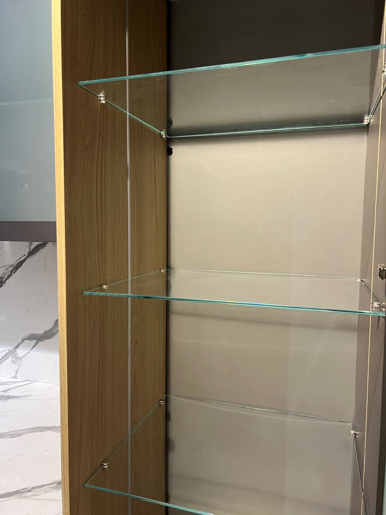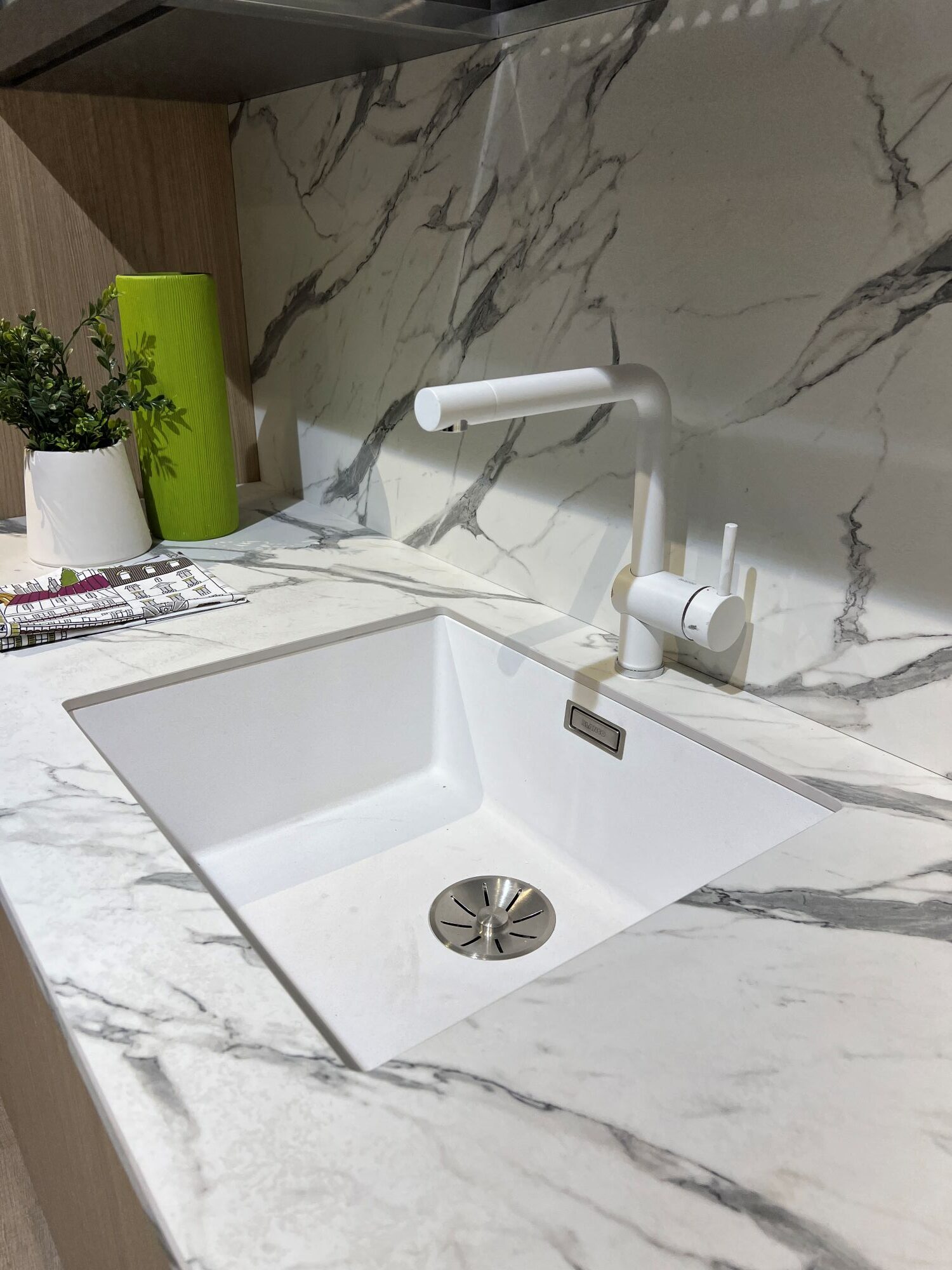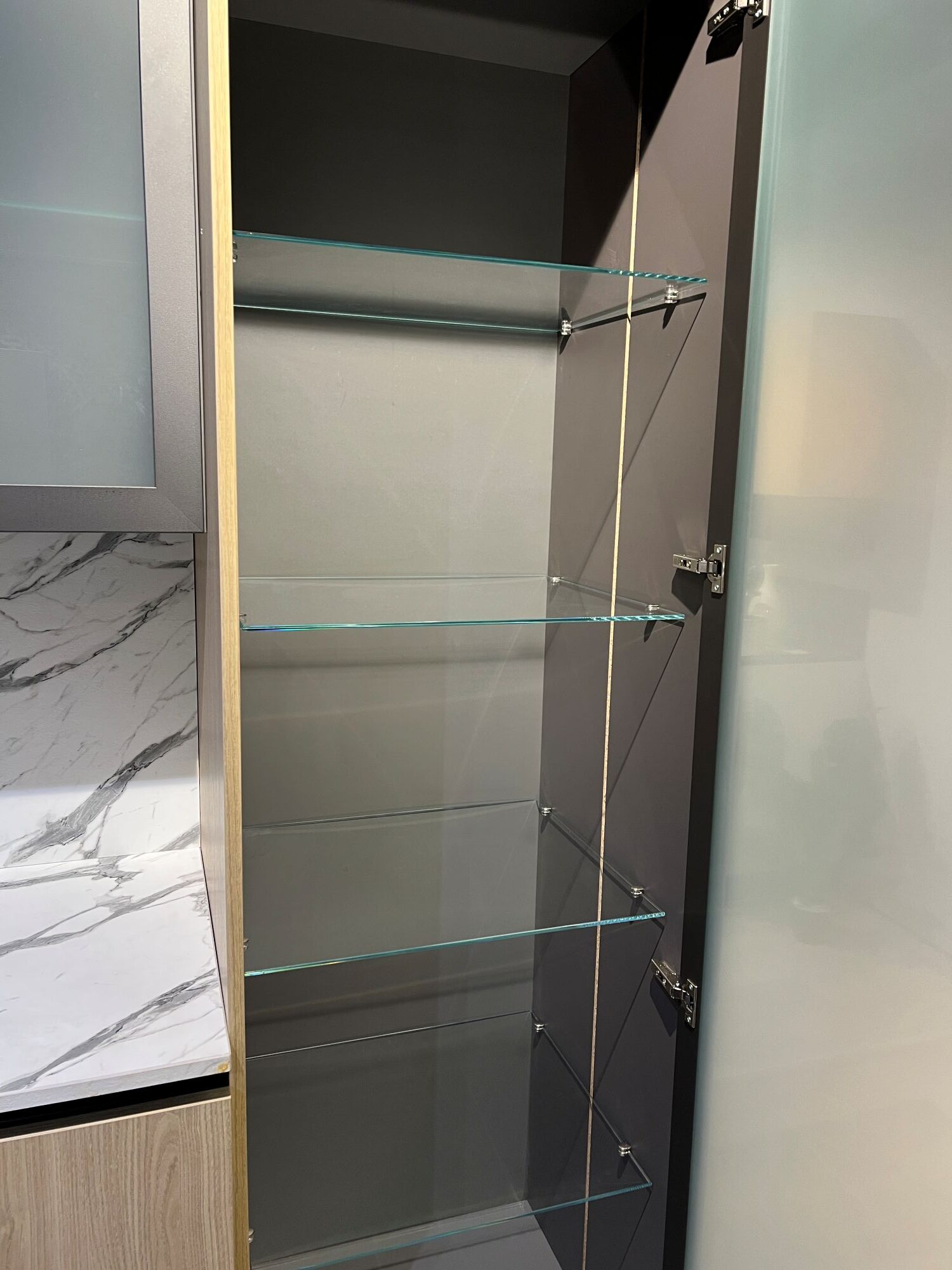 DETTAGLI E FINITURE: basi fin. verde lauro pet e colonne finitura rovere anice ,pensili in vetro, zoccolo h. 12 piombo, top sp 2 cm in Hpl Calacatta con lavello sottotop in fragranite bianco e miscelatore abbinato. Piano snack ESCLUSO.