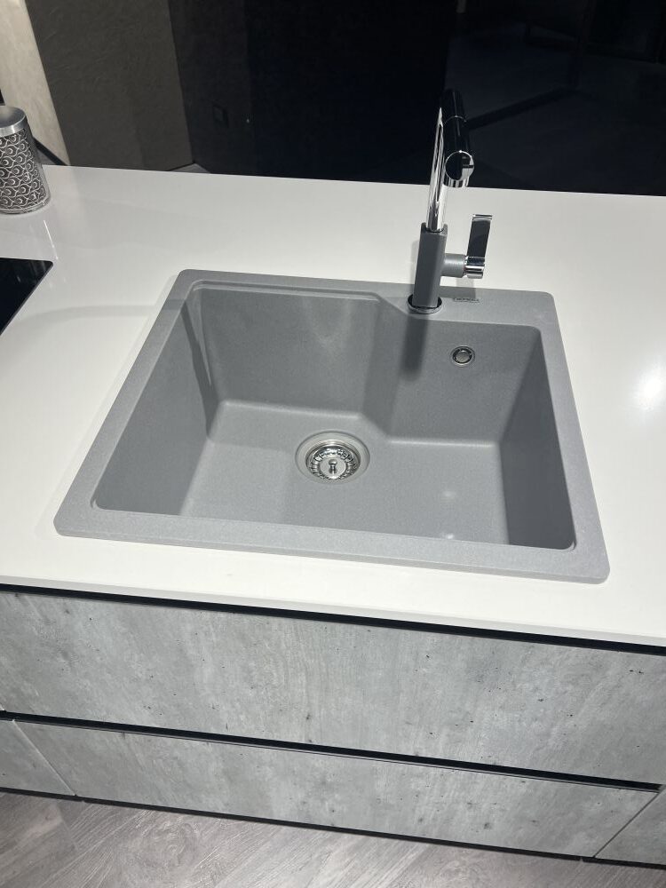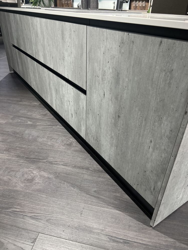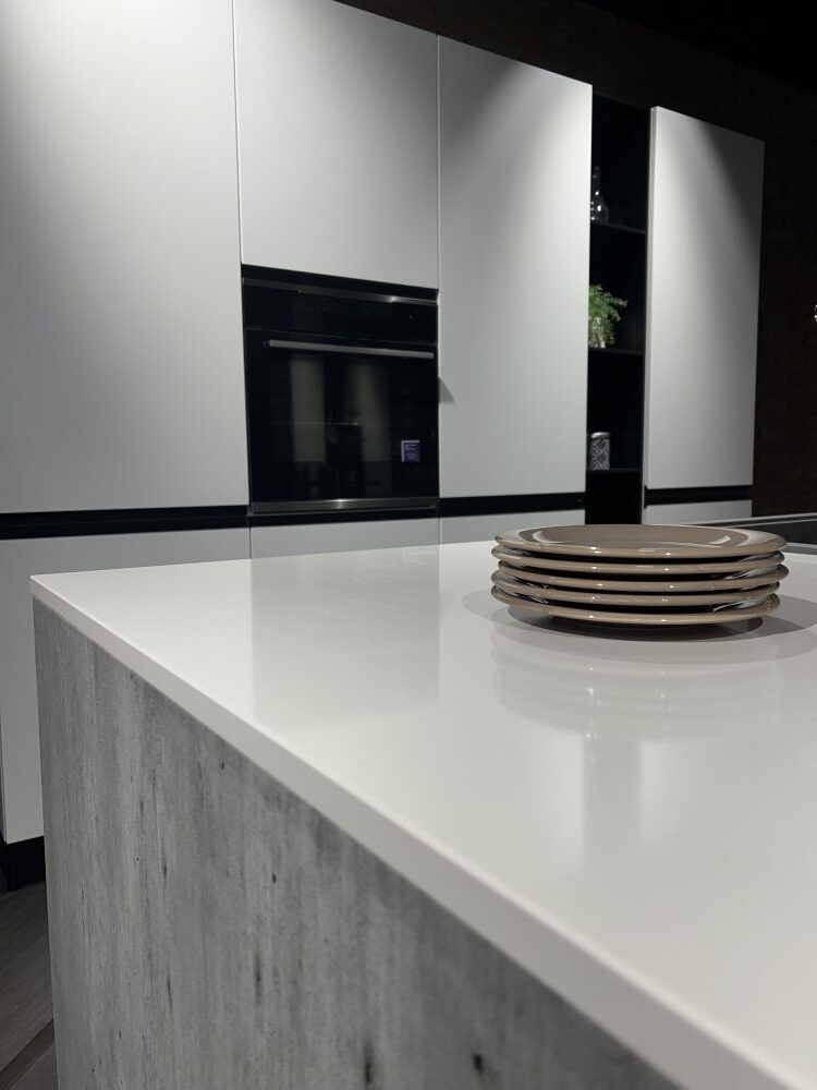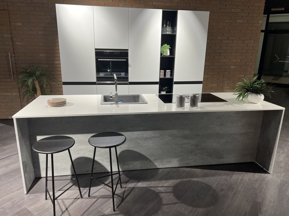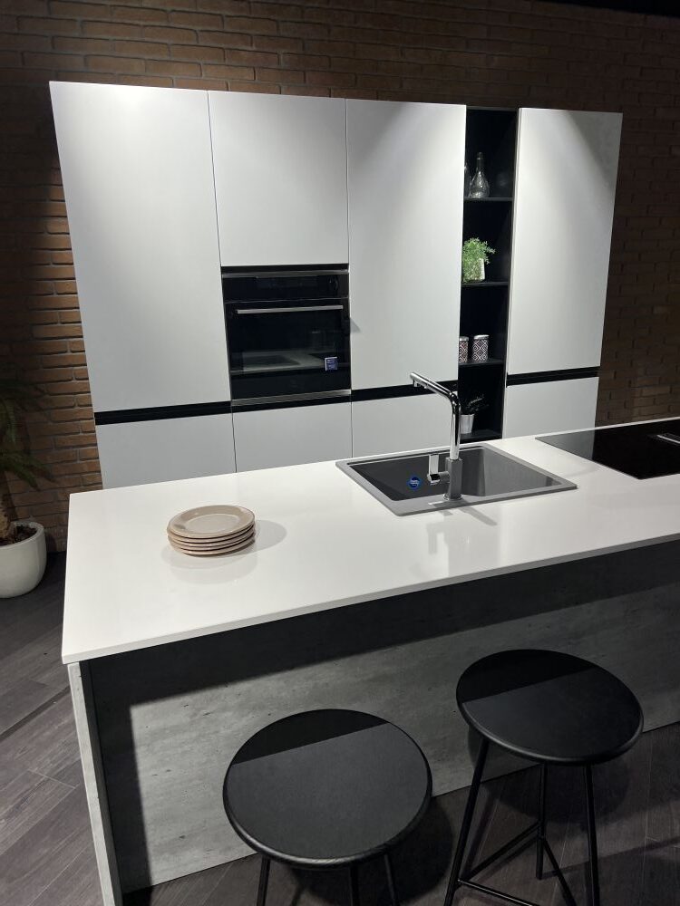 DETTAGLI E FINITURE: struttura bianco, frontali colonne bianco opaco, maniglia integrata hera nero, isola finitura cemento, zoccolo H 12 cm nero, piano top quarzo sp. 2 cm bianco. Lavello Franke 1 vasca mon. urban stone grey, miscelatore Franke Maris doccia cromato / urban stone grey.