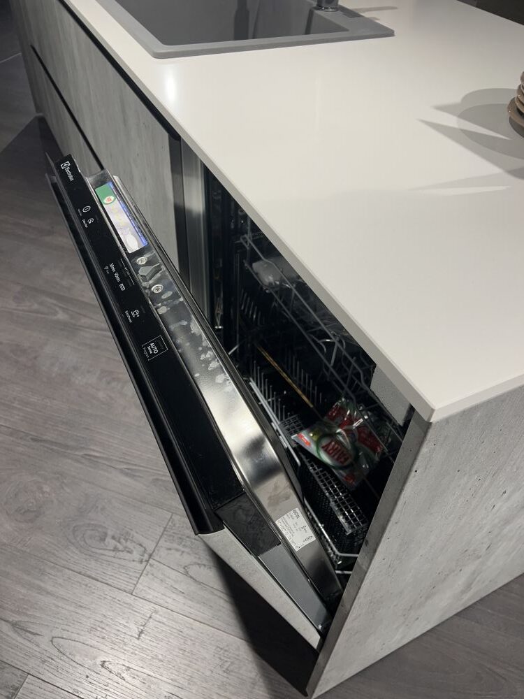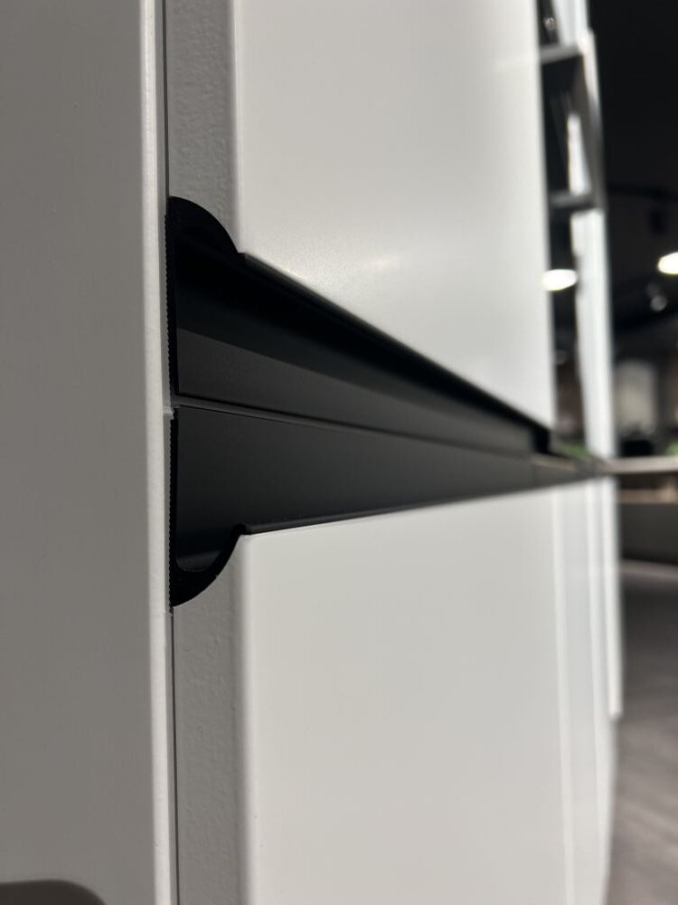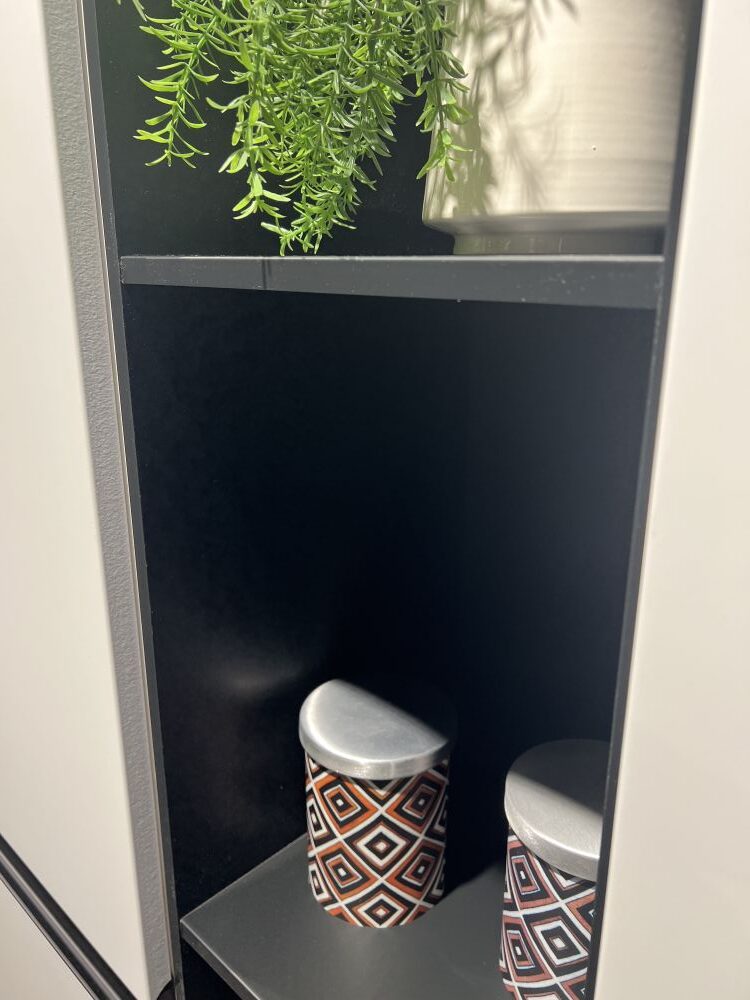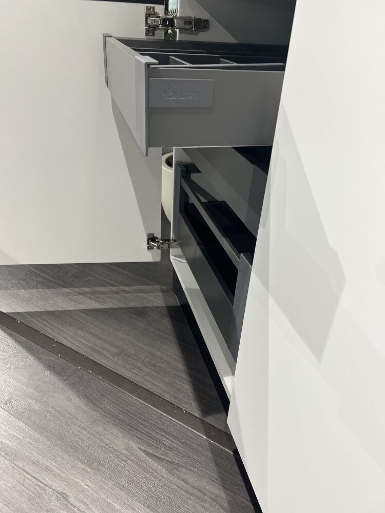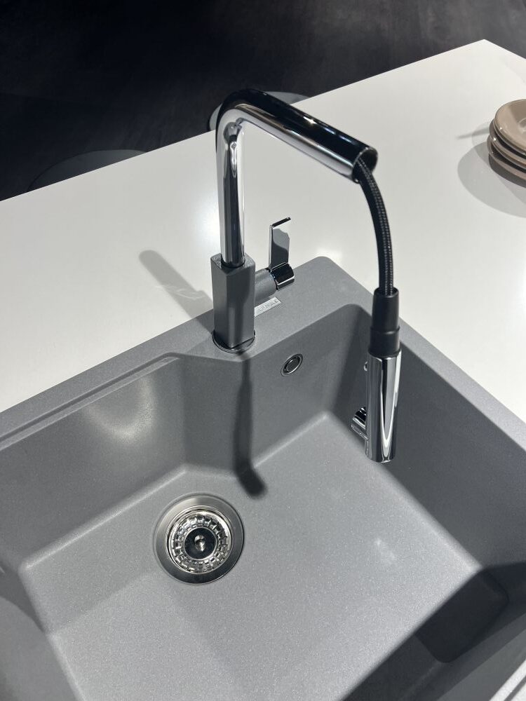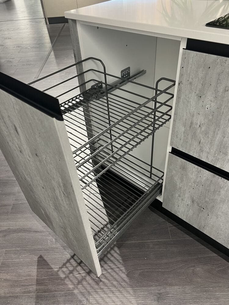 DETTAGLI E FINITURE: struttura bianco, frontali colonne bianco opaco, maniglia integrata hera nero, isola finitura cemento, zoccolo H 12 cm nero, piano top quarzo sp. 2 cm bianco. Lavello Franke 1 vasca mon. urban stone grey, miscelatore Franke Maris doccia cromato / urban stone grey.