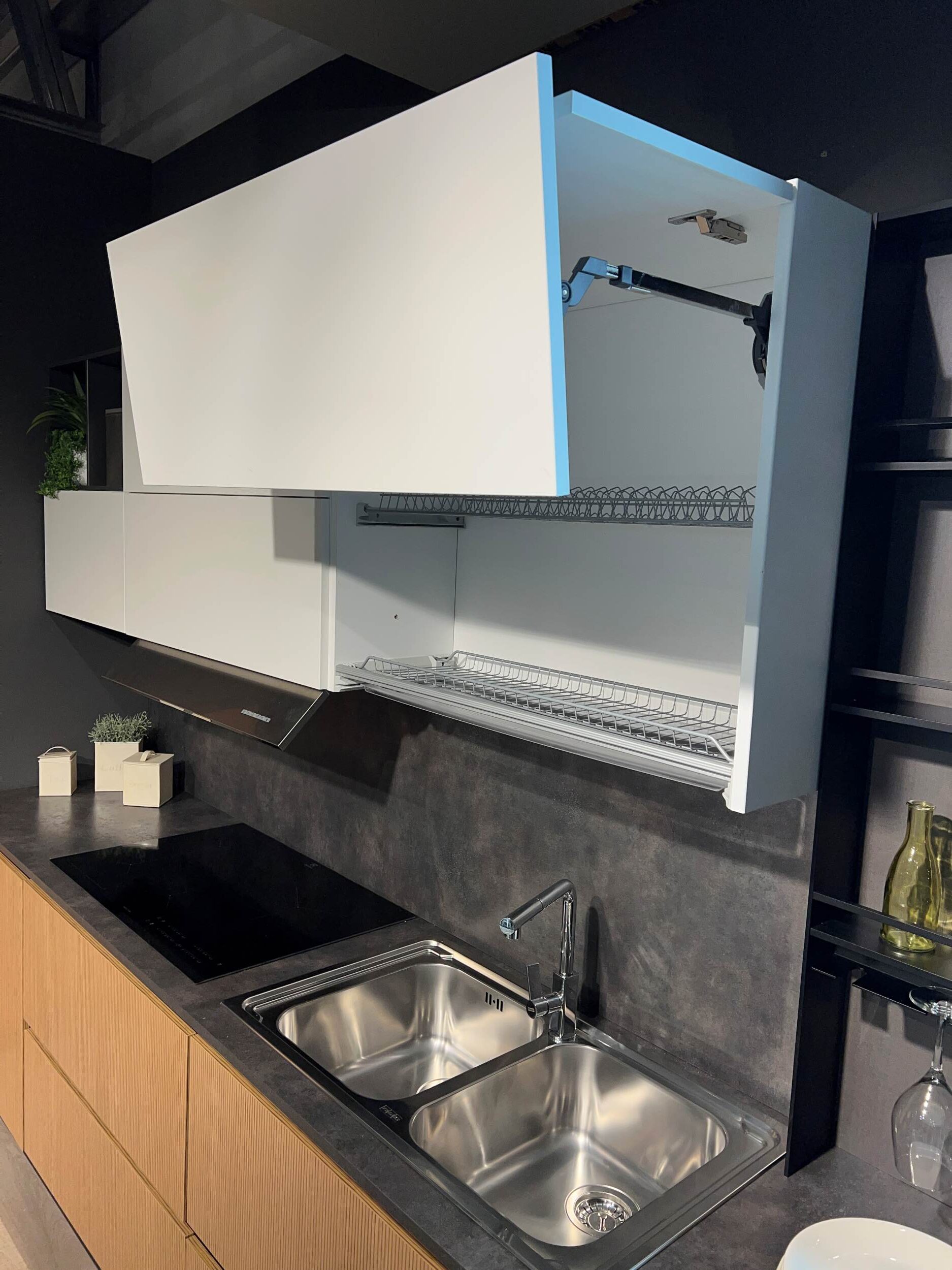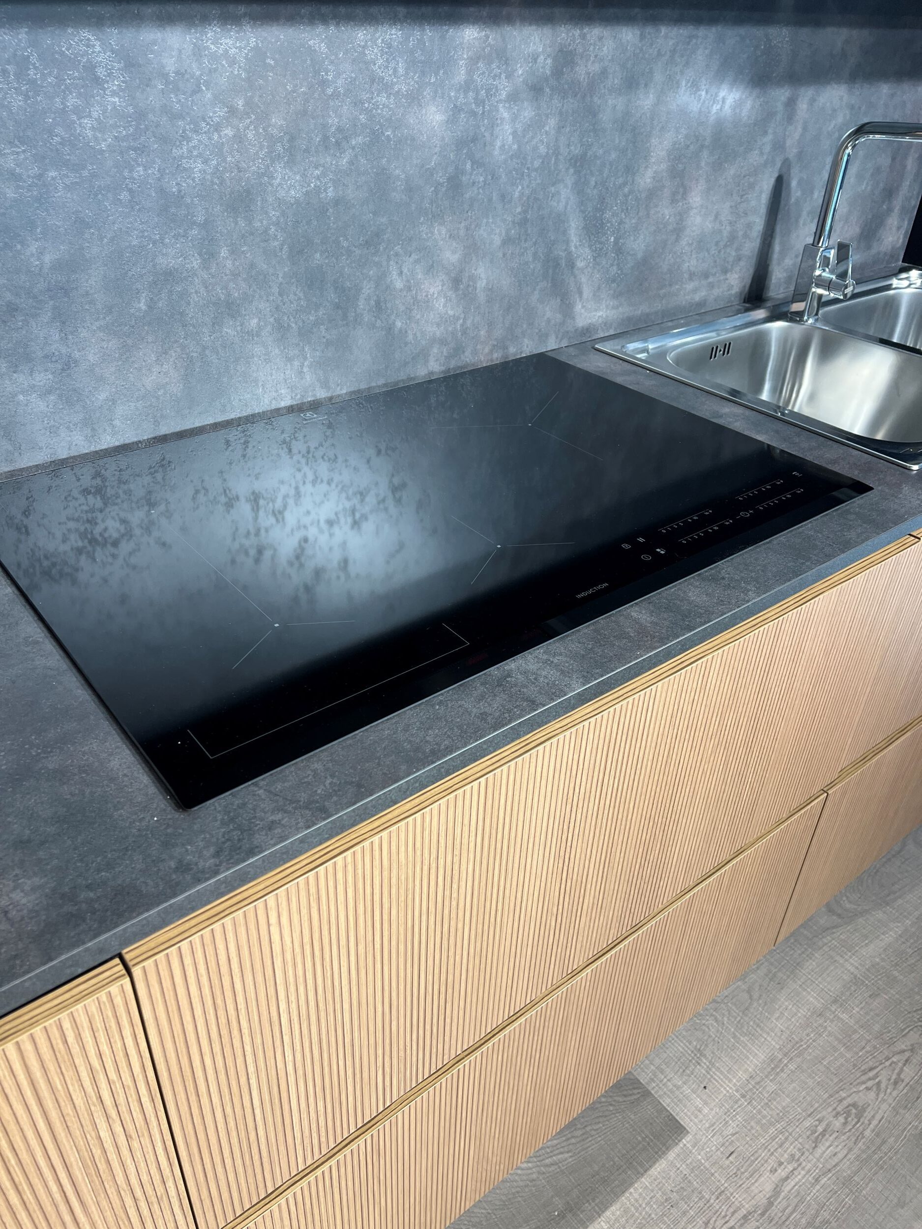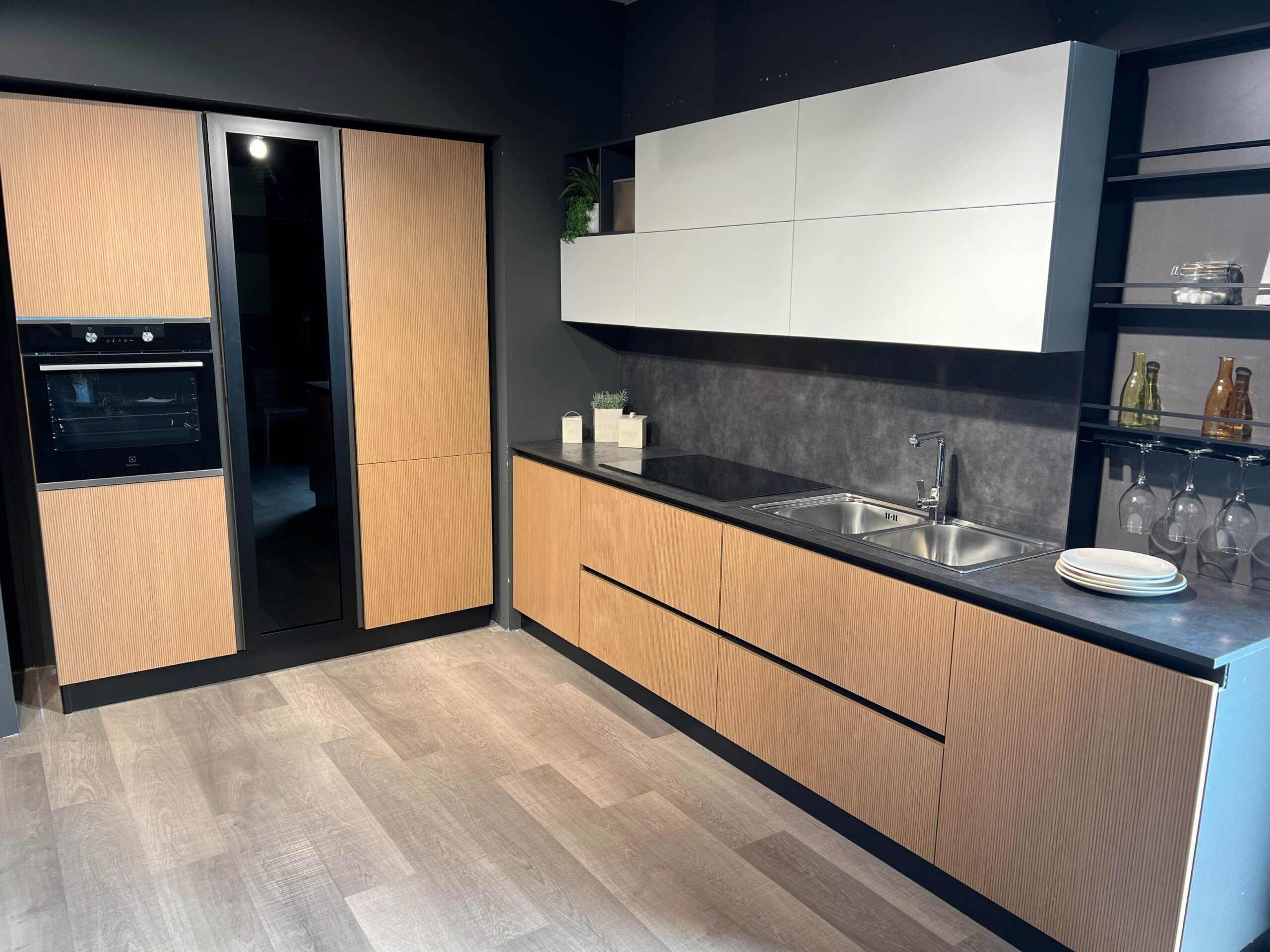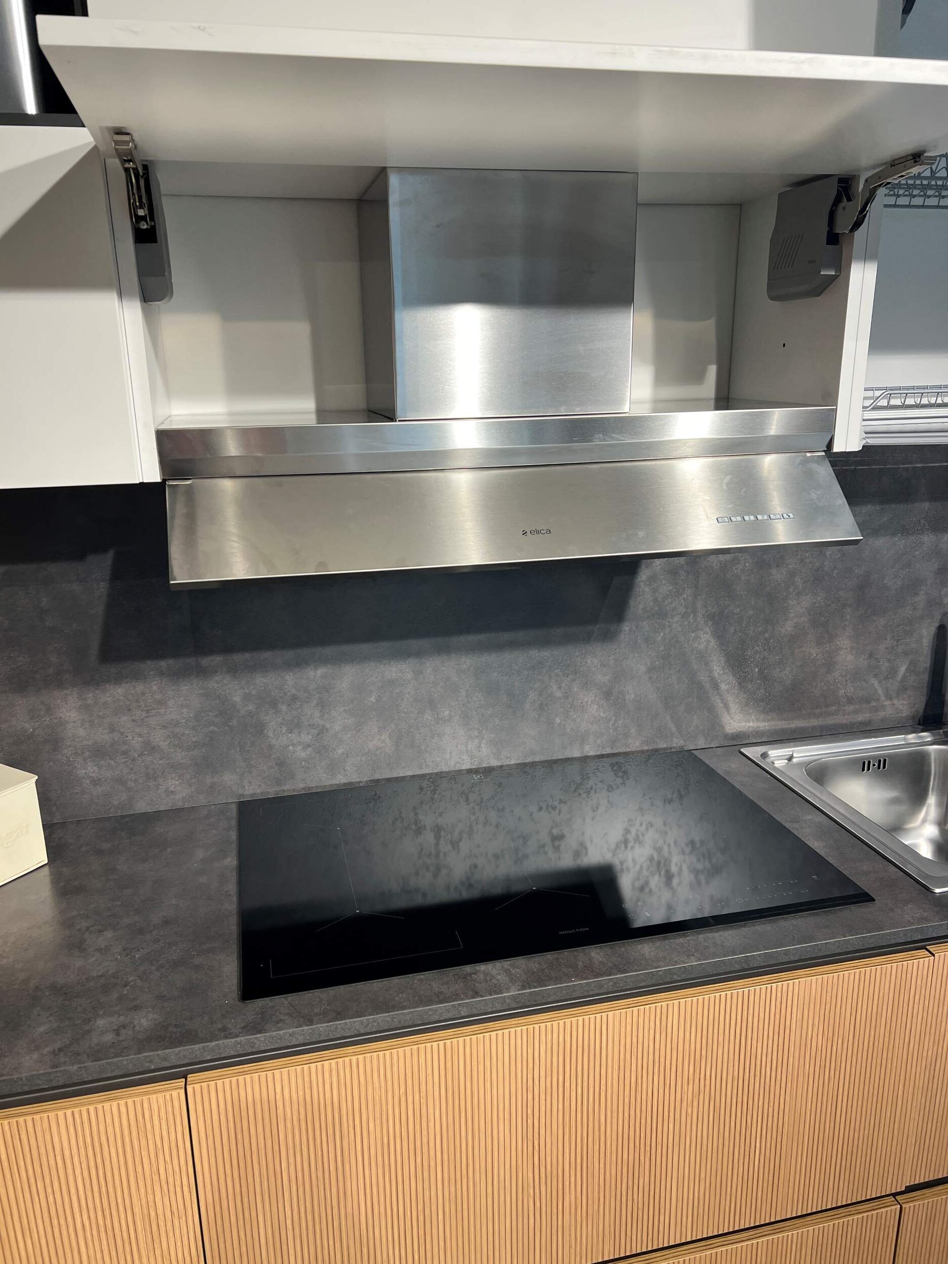 DETTAGLI E FINITURE: basi e colonne finitura miele rigato, pensili bianco, piano top laminato Vulcanic sp. 2 cm con relativo schienale. Lavello inox e miscelatore inox Franke. Cappa Elica integrata al pensile. Colonna anta vetro fumè con led integrato
