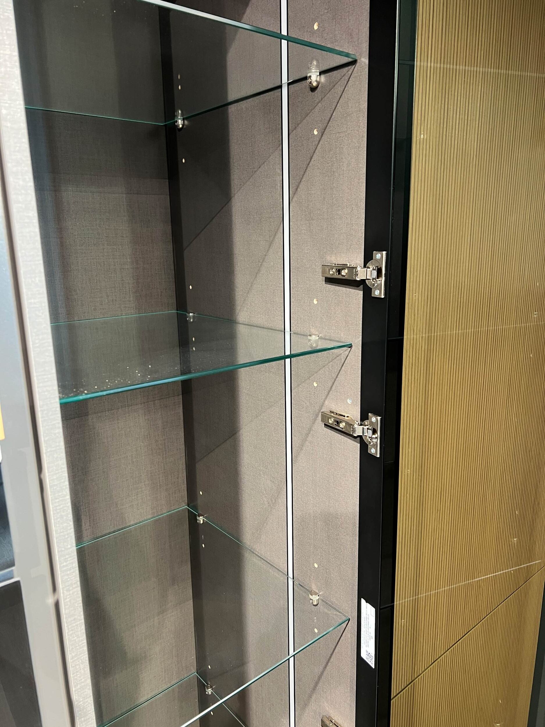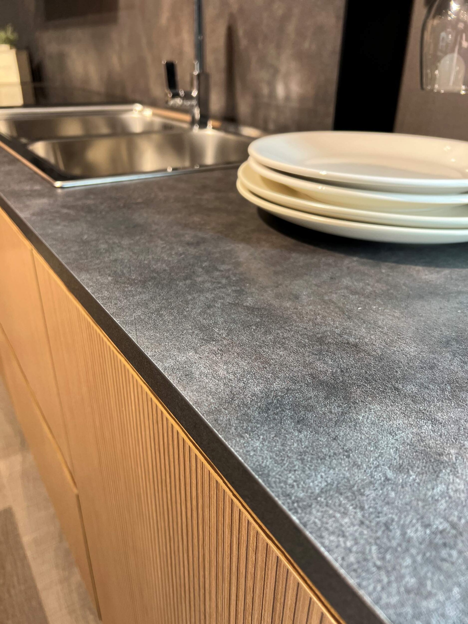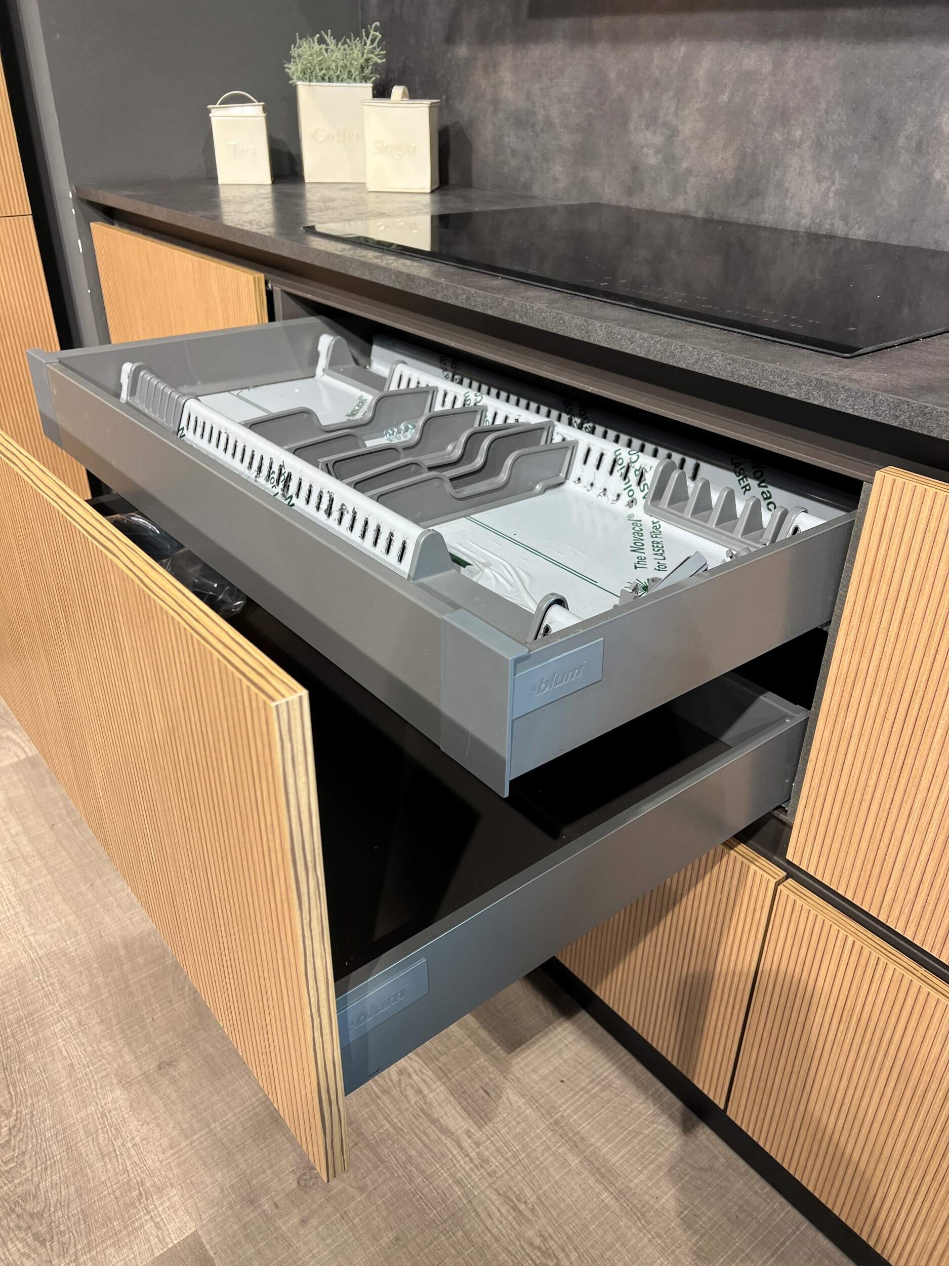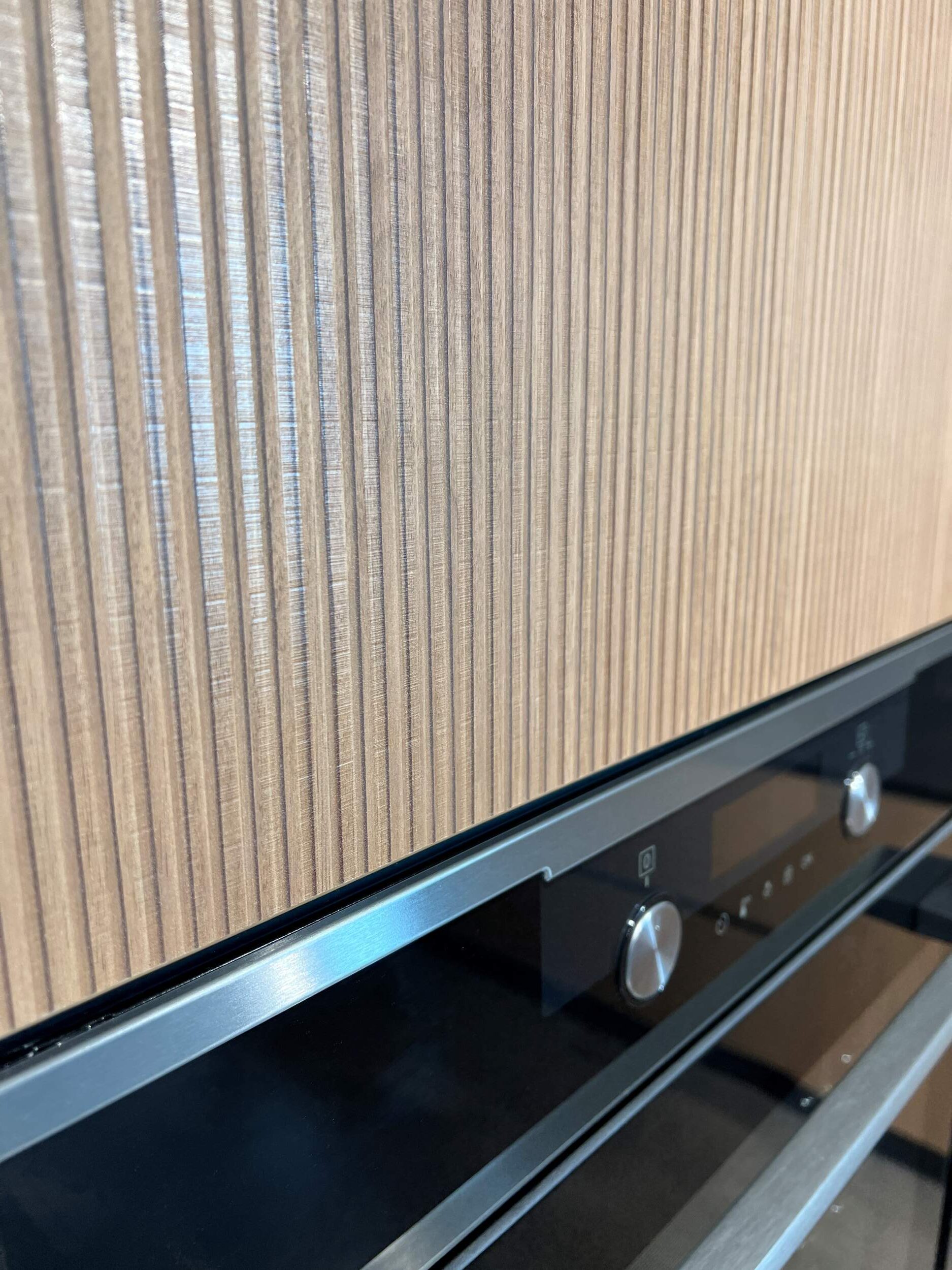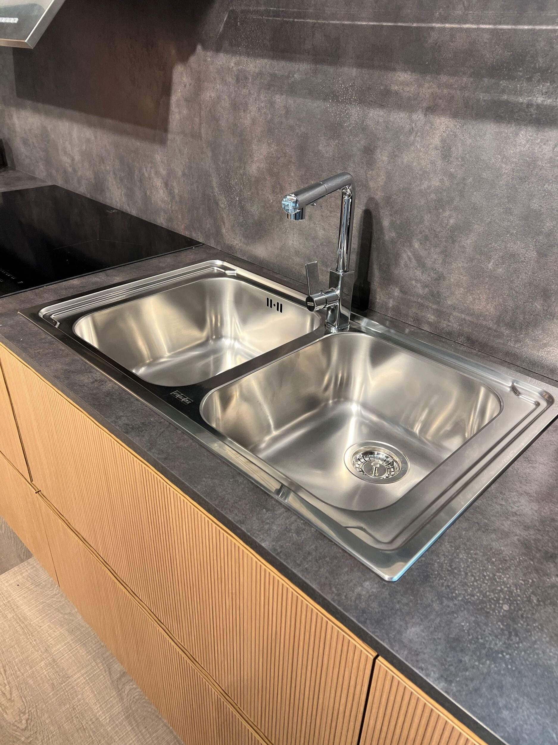 DETTAGLI E FINITURE: basi e colonne finitura miele rigato, pensili bianco, piano top laminato Vulcanic sp. 2 cm con relativo schienale. Lavello inox e miscelatore inox Franke. Cappa Elica integrata al pensile. Colonna anta vetro fumè con led integrato