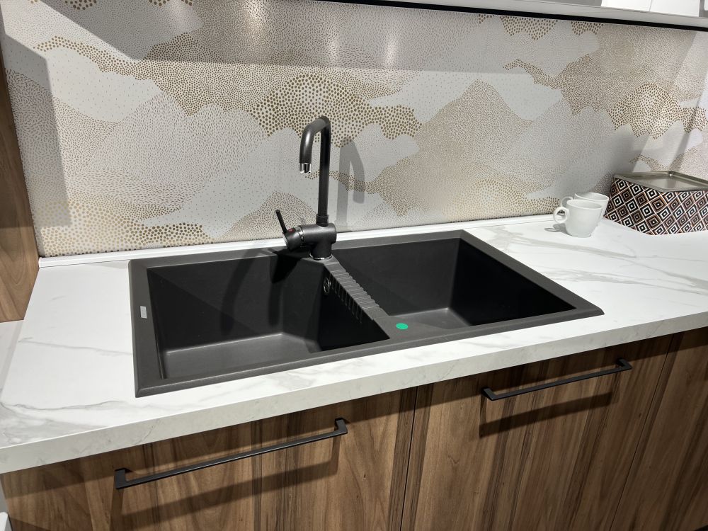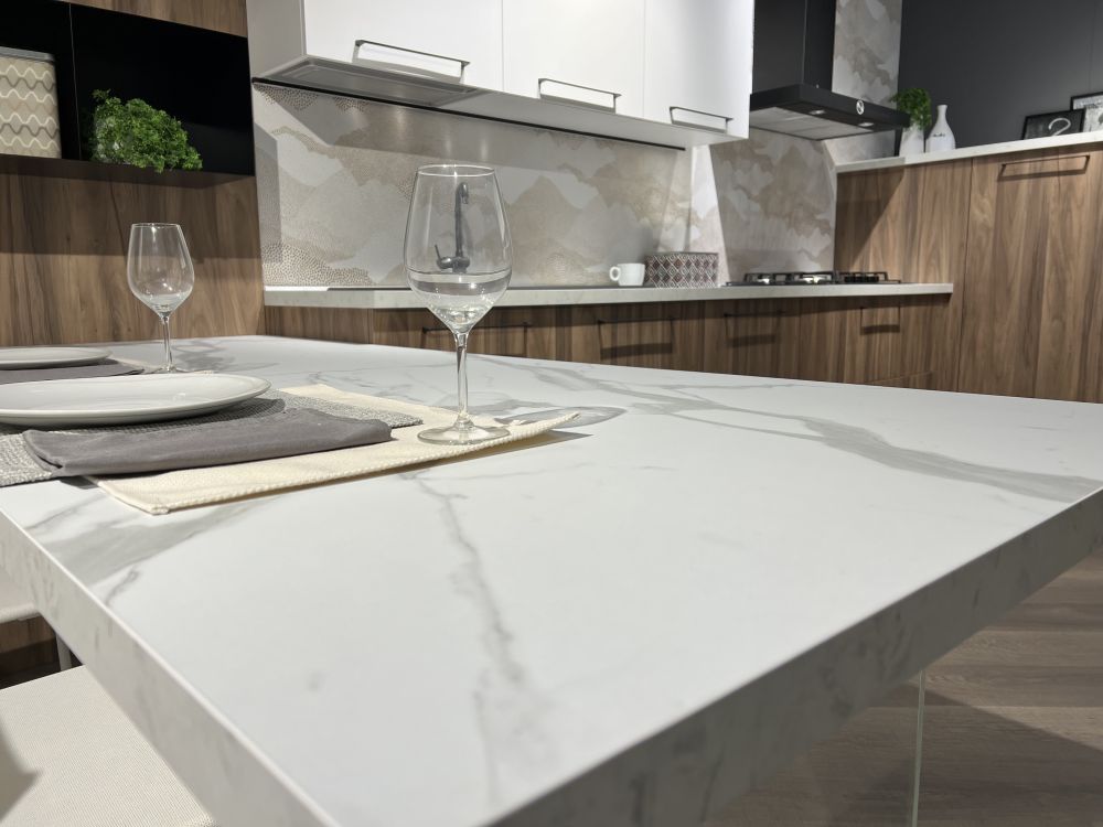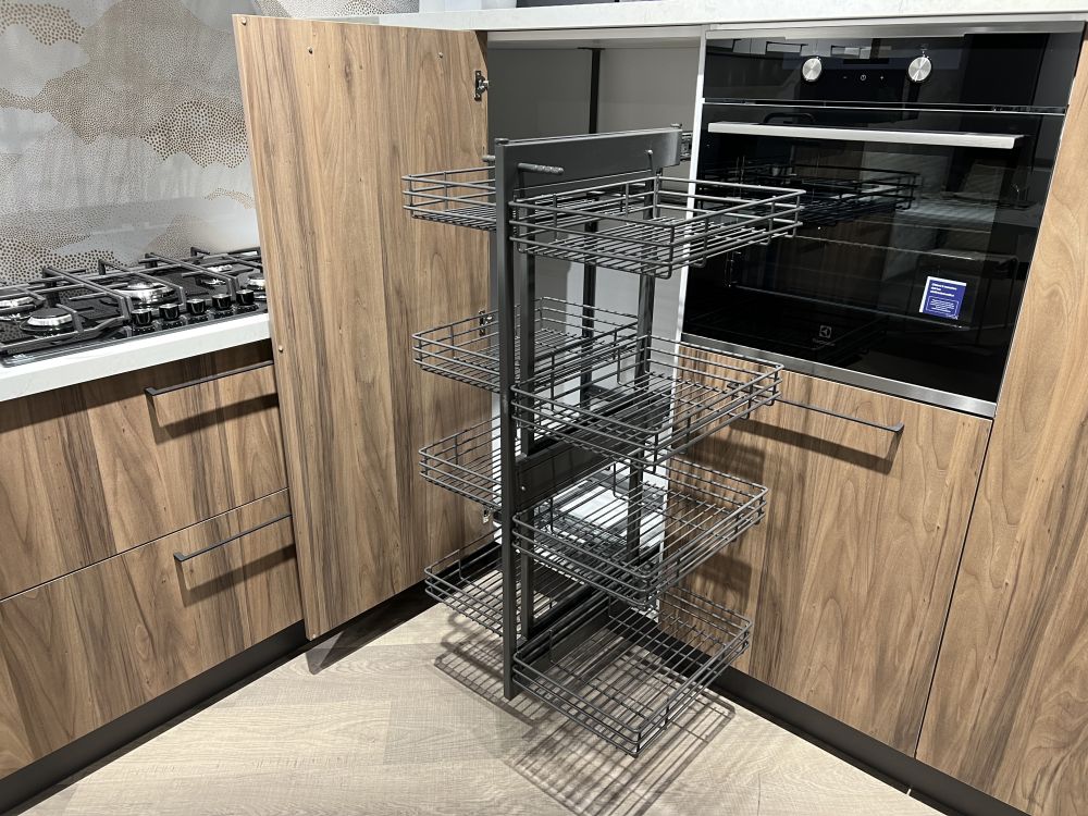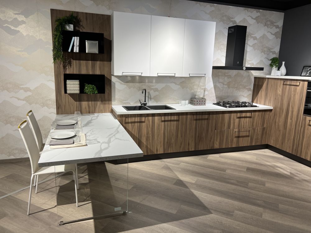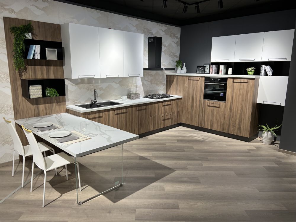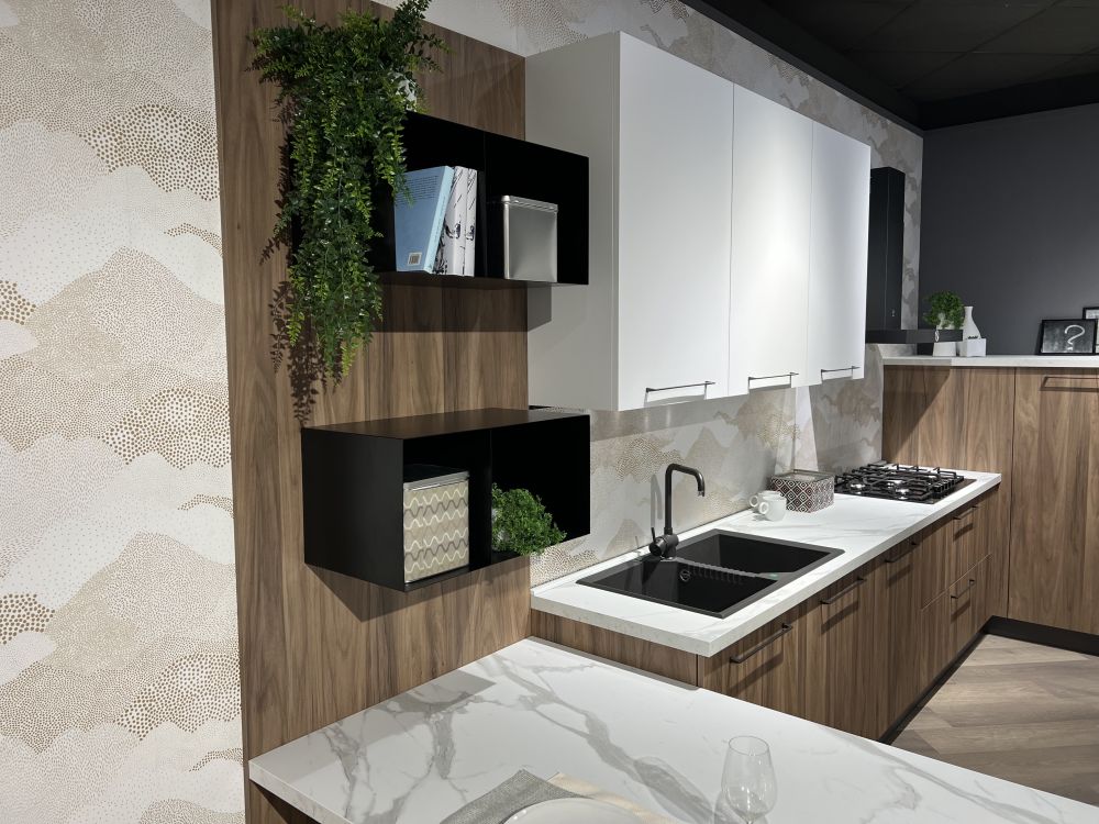 DETTAGLI E FINITURE: Finiture Noce Italiano e Bianco opaco, Top in laminato sp 4 cm fin. Marmo Bianco, maniglie metallo brunito, Zoccolo h 12 cm antracite, Cappa Elica LOL 90, Lavello 2 vasche Elleci Tekno Antracite, miscelatore Elleci Senna Antracite. Elementi a giorno in metallo Antracite, meccanismo estraibile inserito nella colonna ad angolo. Supporto per penisola in vetro, meccanismi Blum