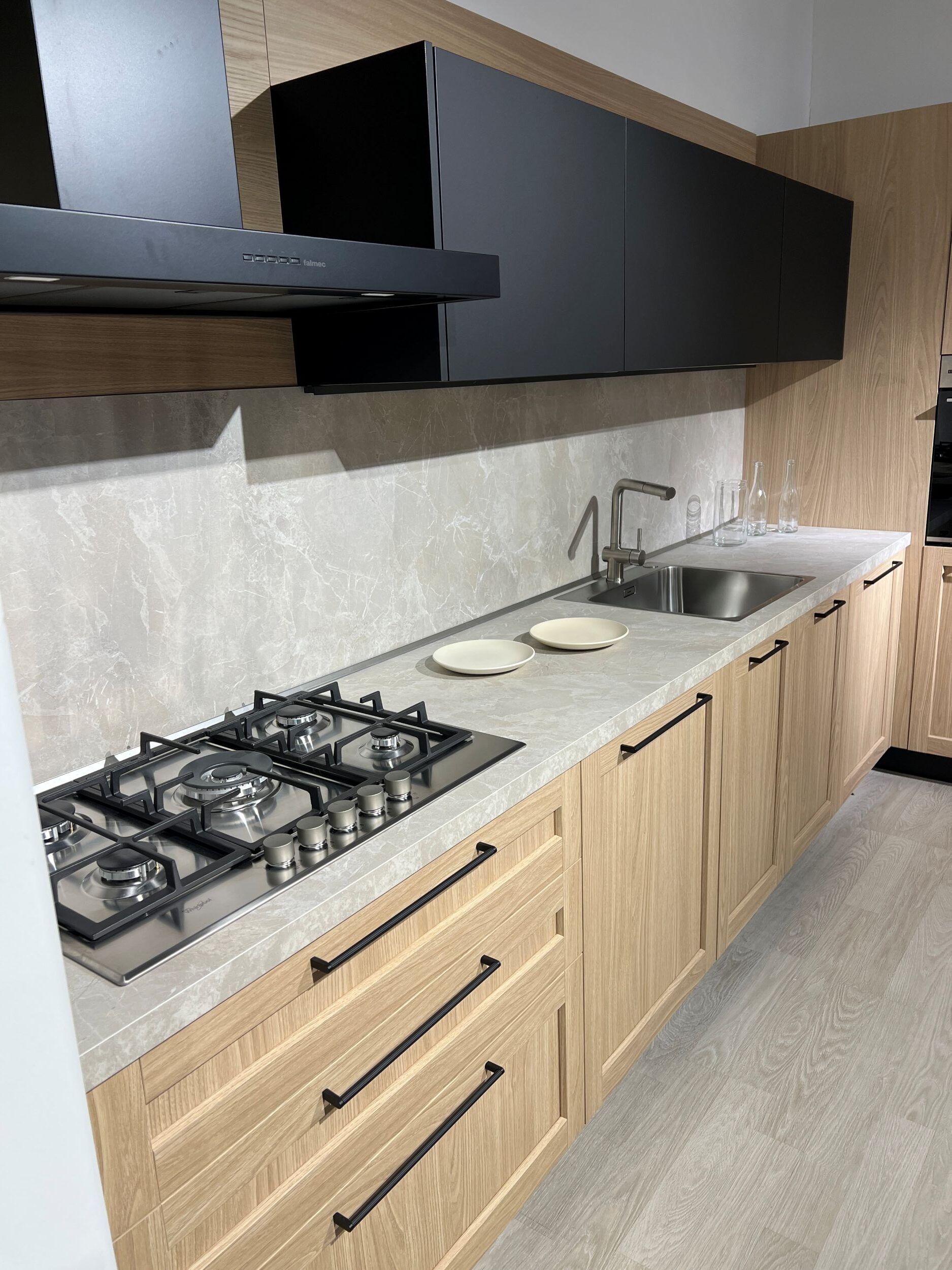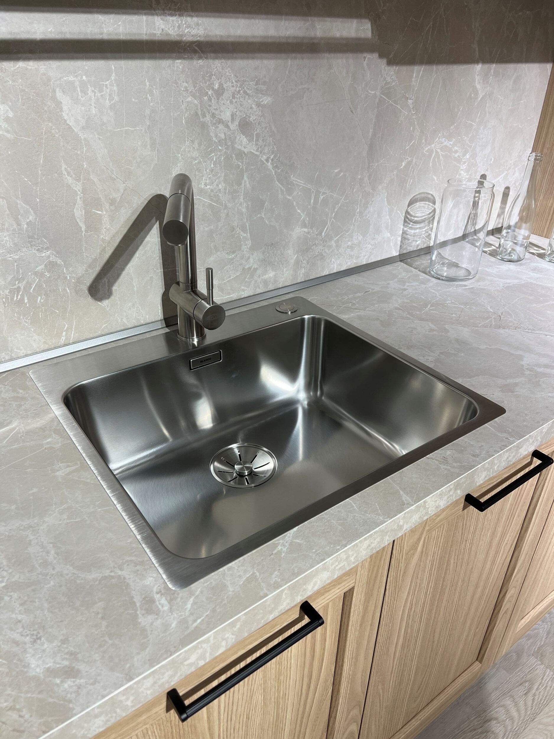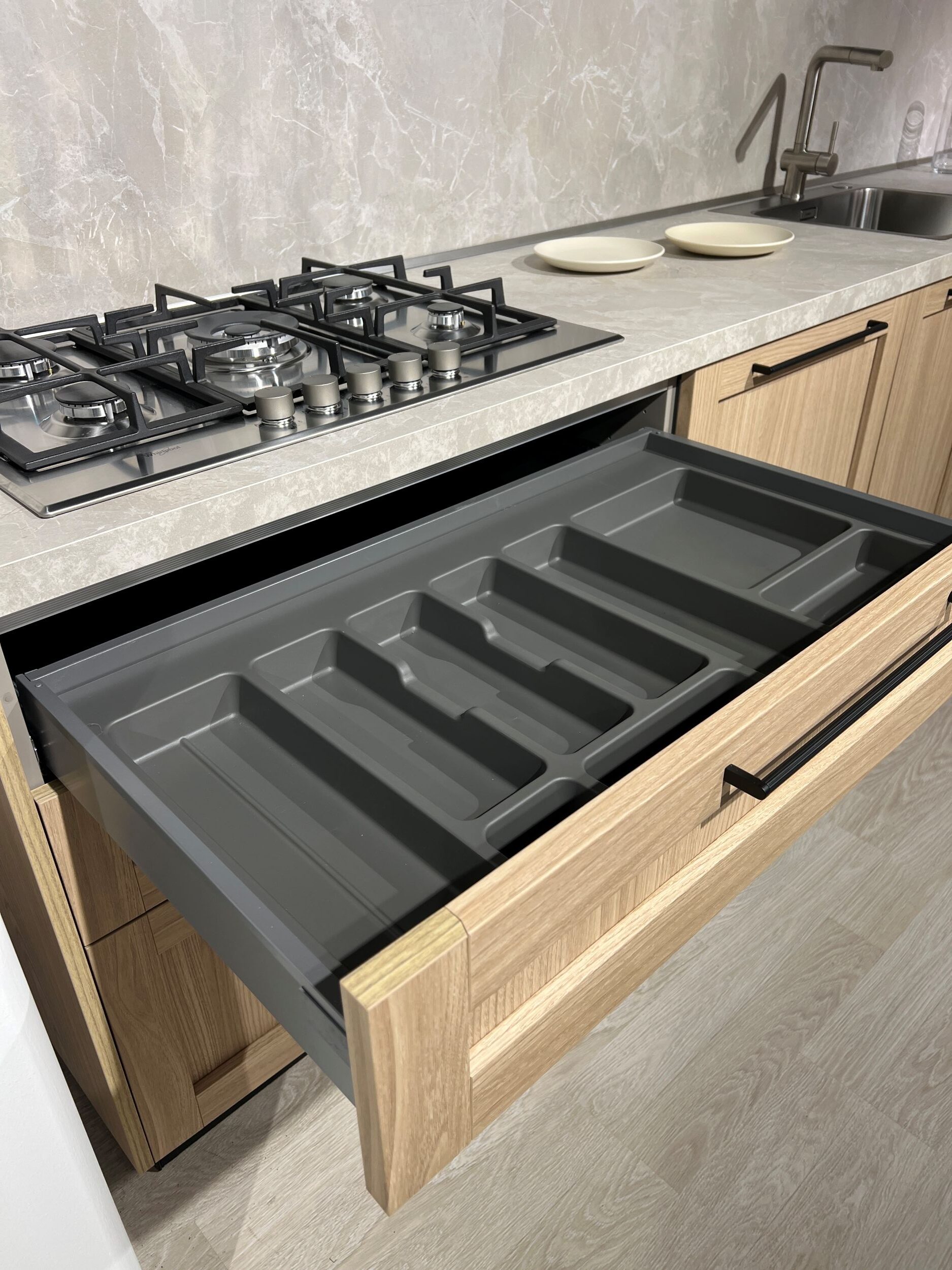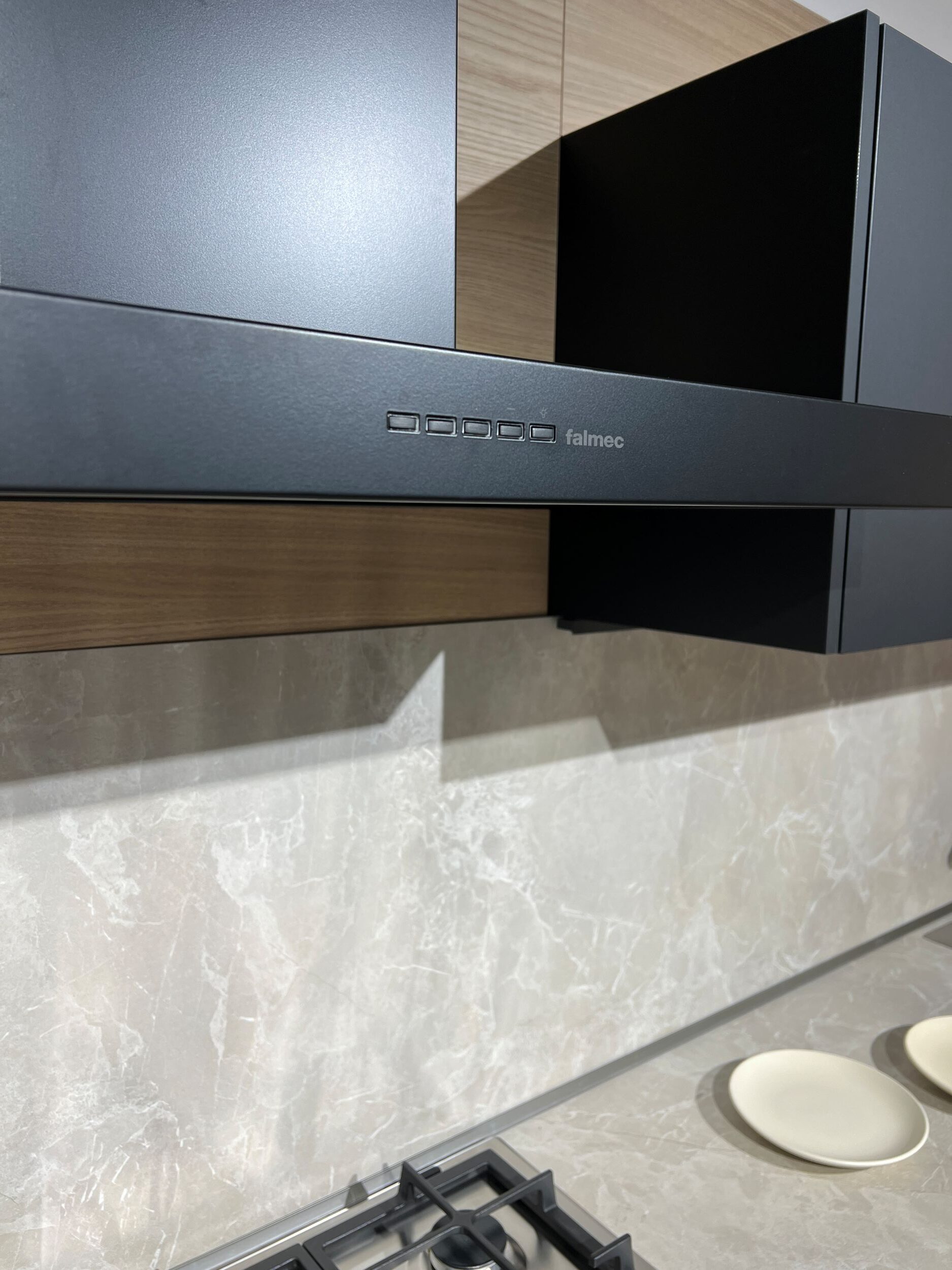DETTAGLI E FINITURE: ante a telaio per basi e colonne in fin. Rovere Anice, pensili in Pet fin. Liquirizia, piano top in laminato sp. 4 cm. fin. Silvermine completo di schienale, lavello Blanco semifilo top mod. Solis completo di miscelatore con doccetta estraibile, illuminazione led sottopensile