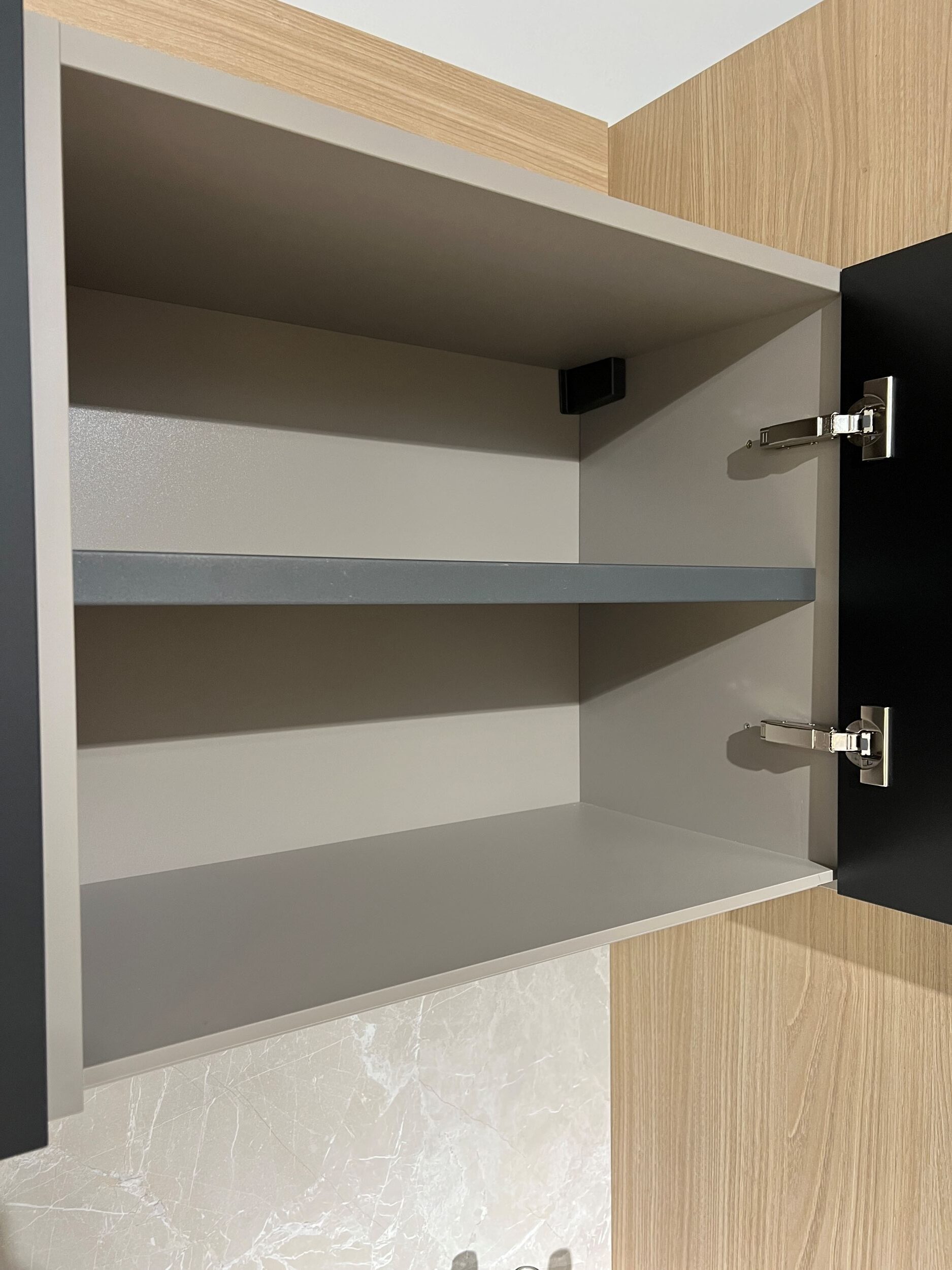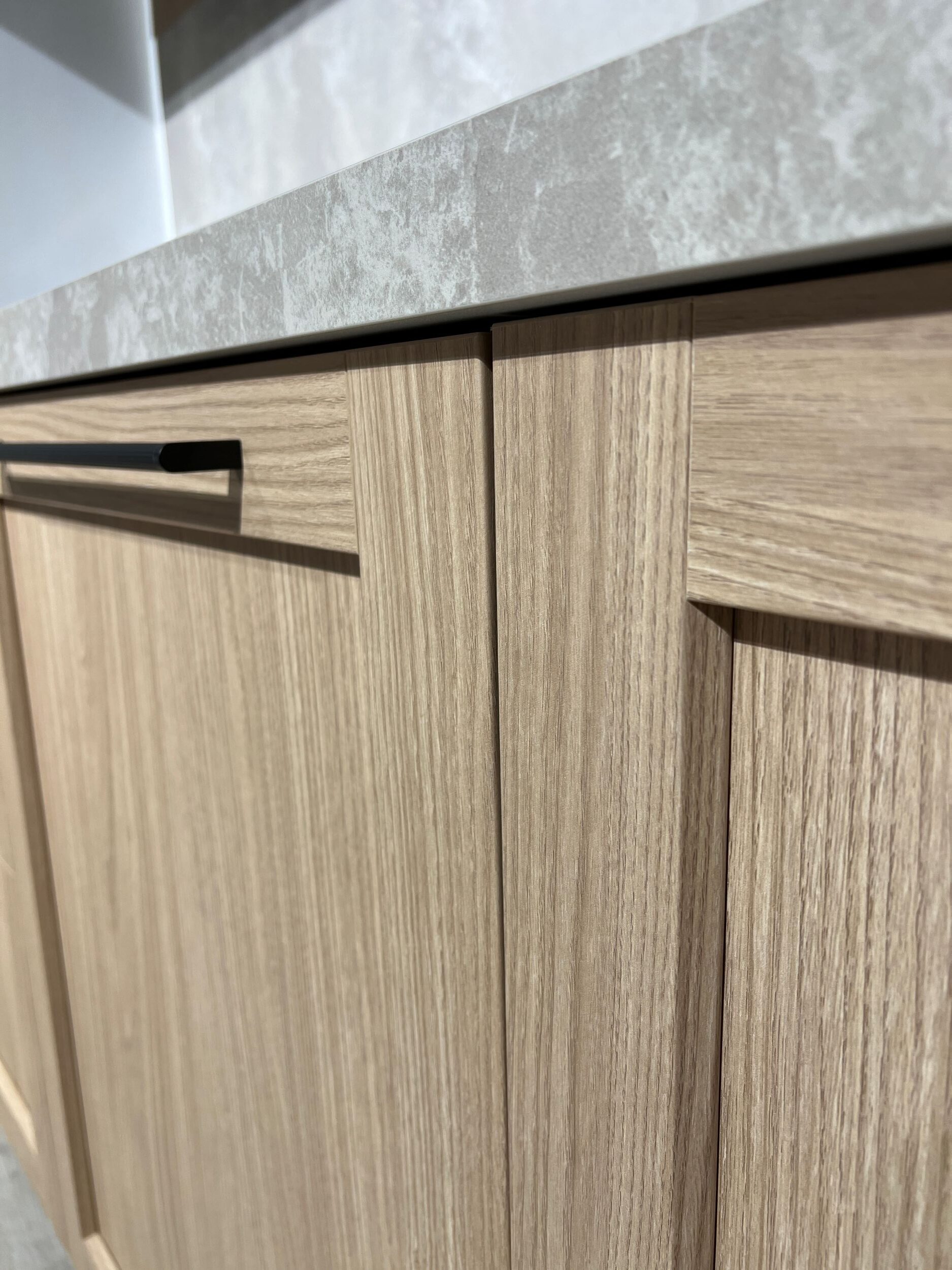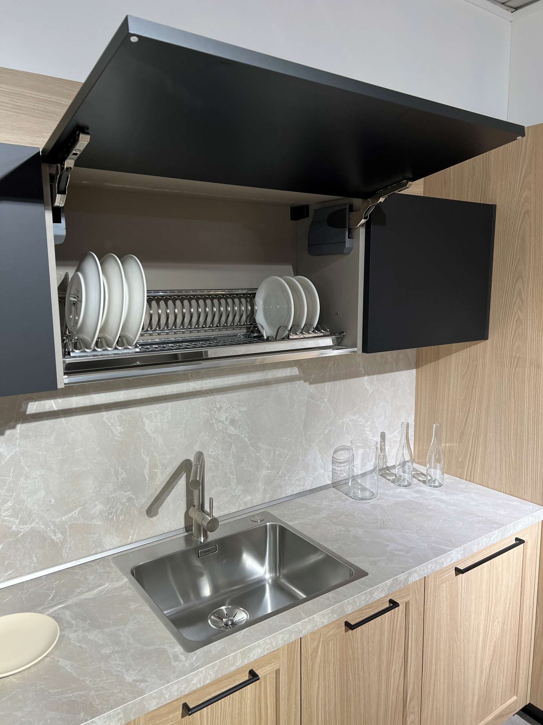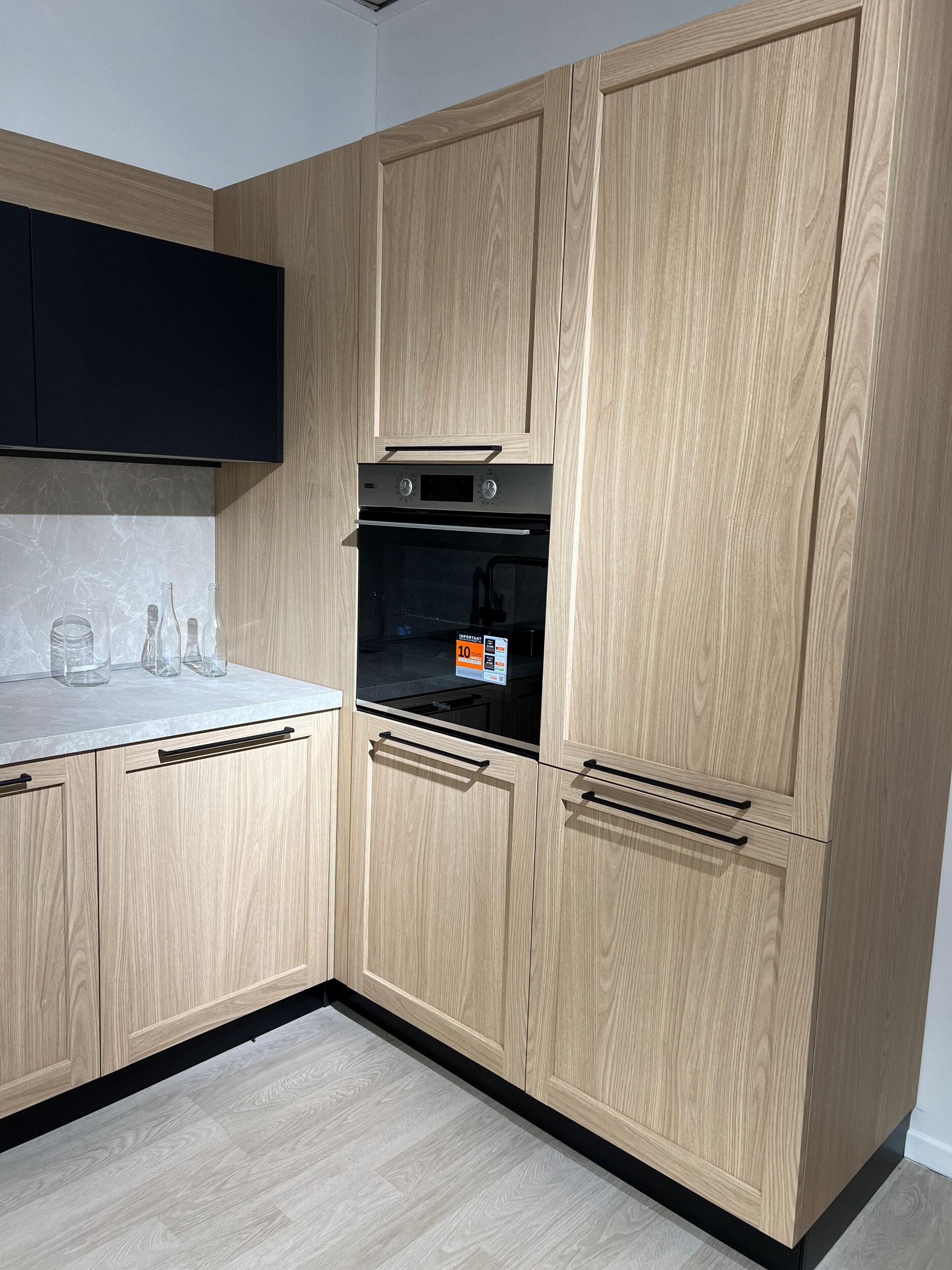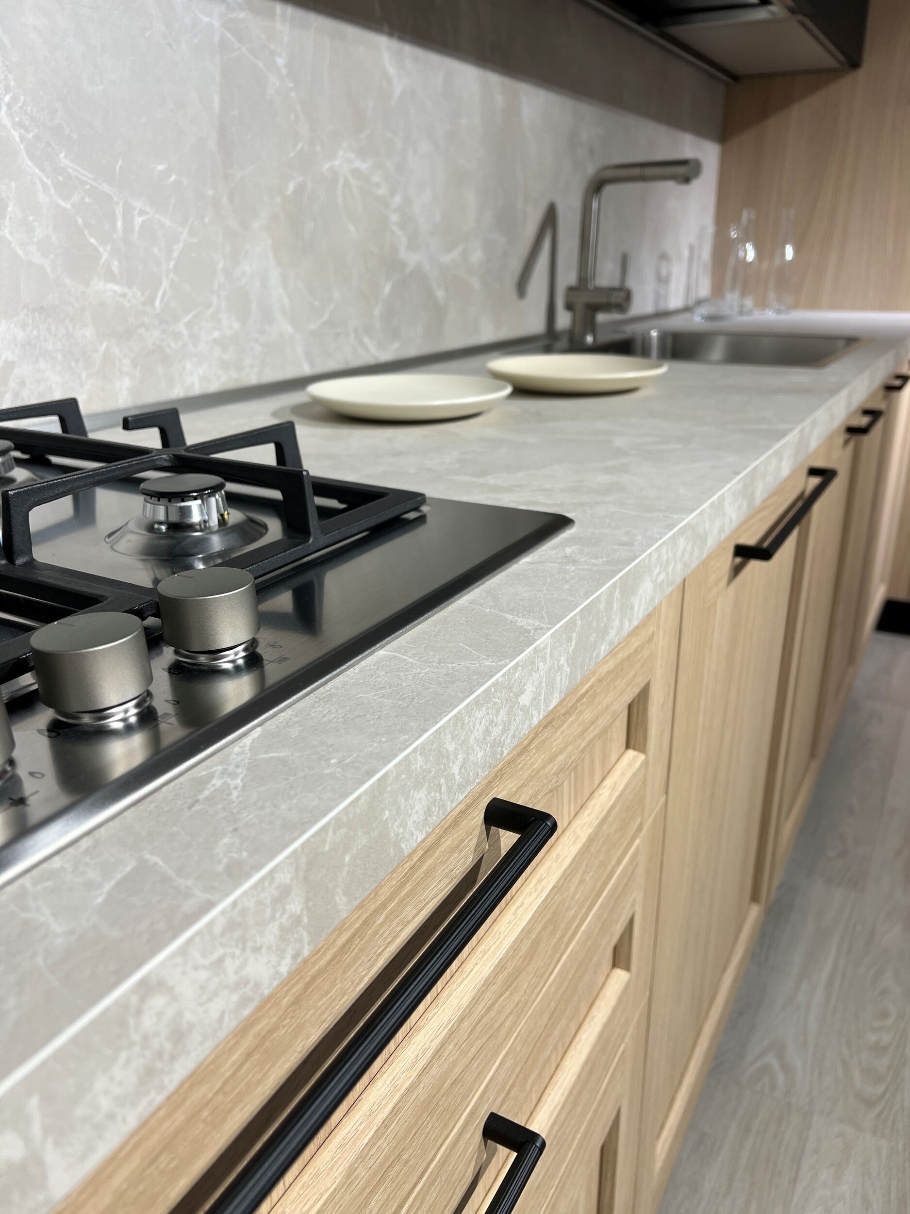 DETTAGLI E FINITURE: ante a telaio per basi e colonne in fin. Rovere Anice, pensili in Pet fin. Liquirizia, piano top in laminato sp. 4 cm. fin. Silvermine completo di schienale, lavello Blanco semifilo top mod. Solis completo di miscelatore con doccetta estraibile, illuminazione led sottopensile