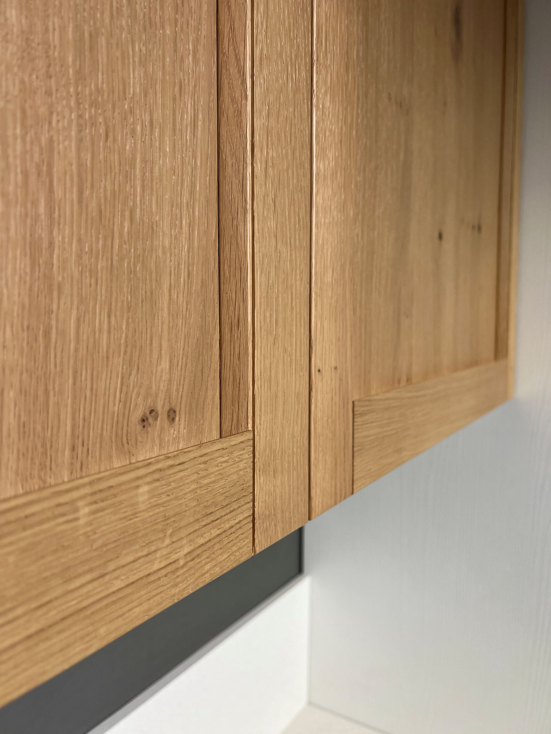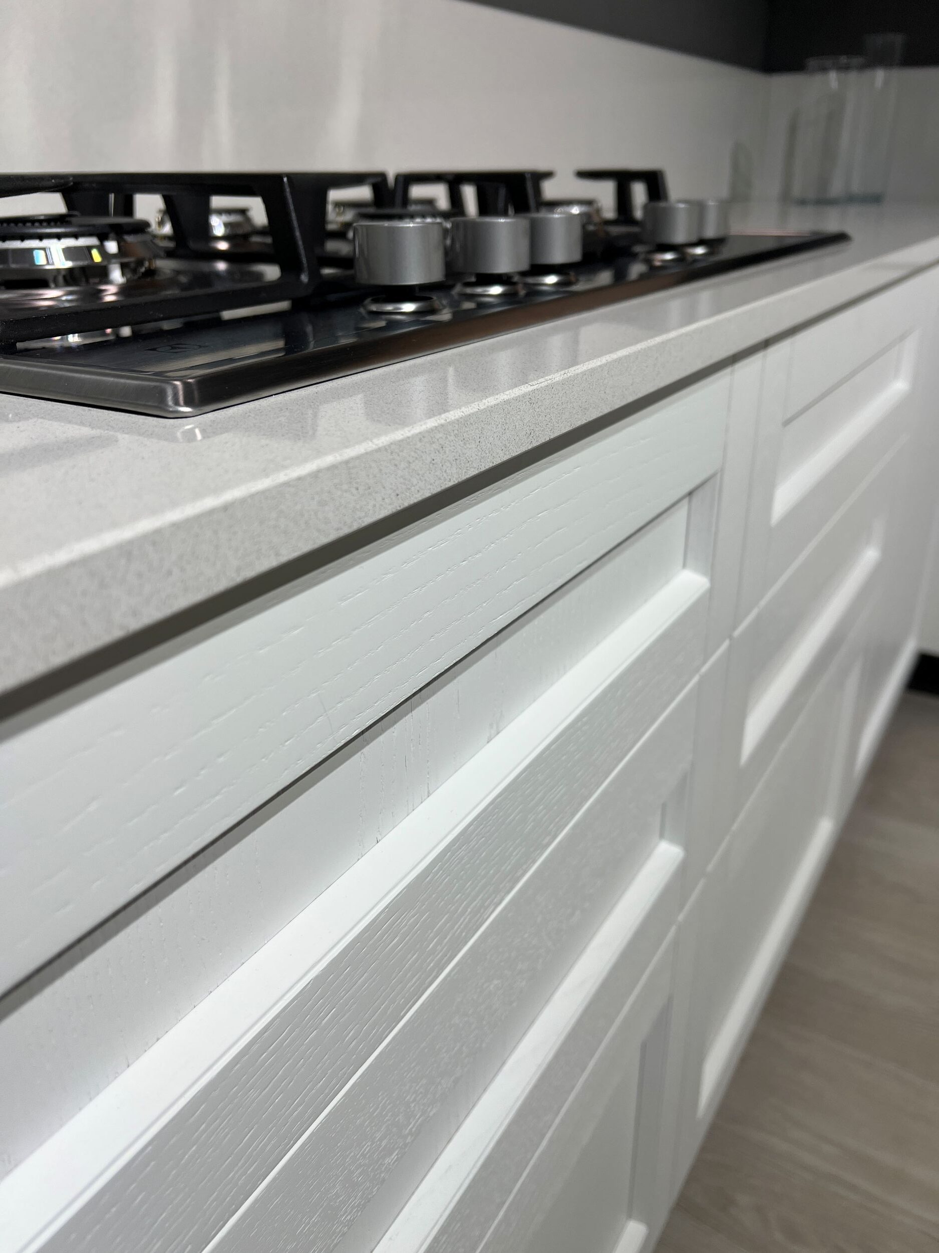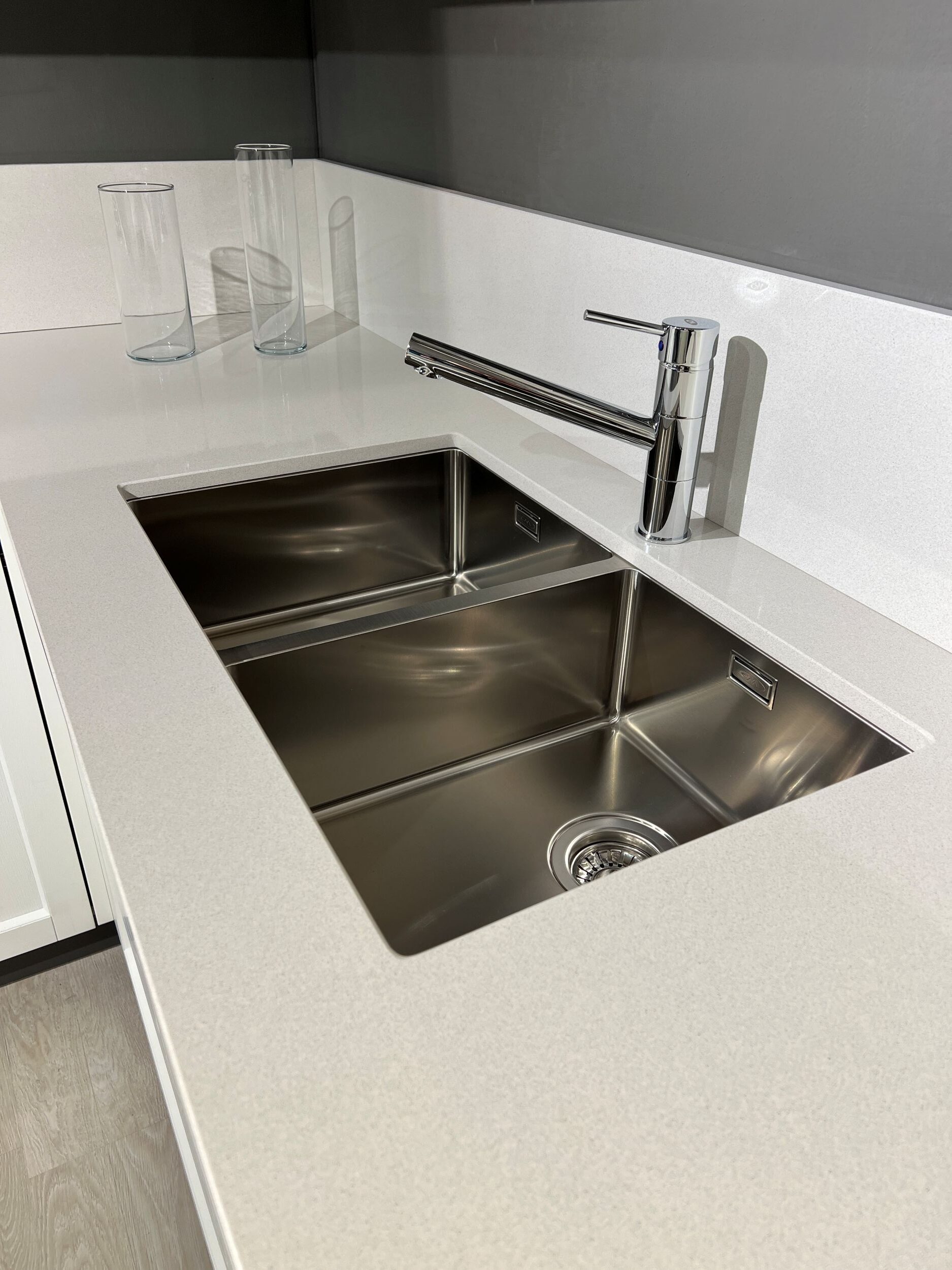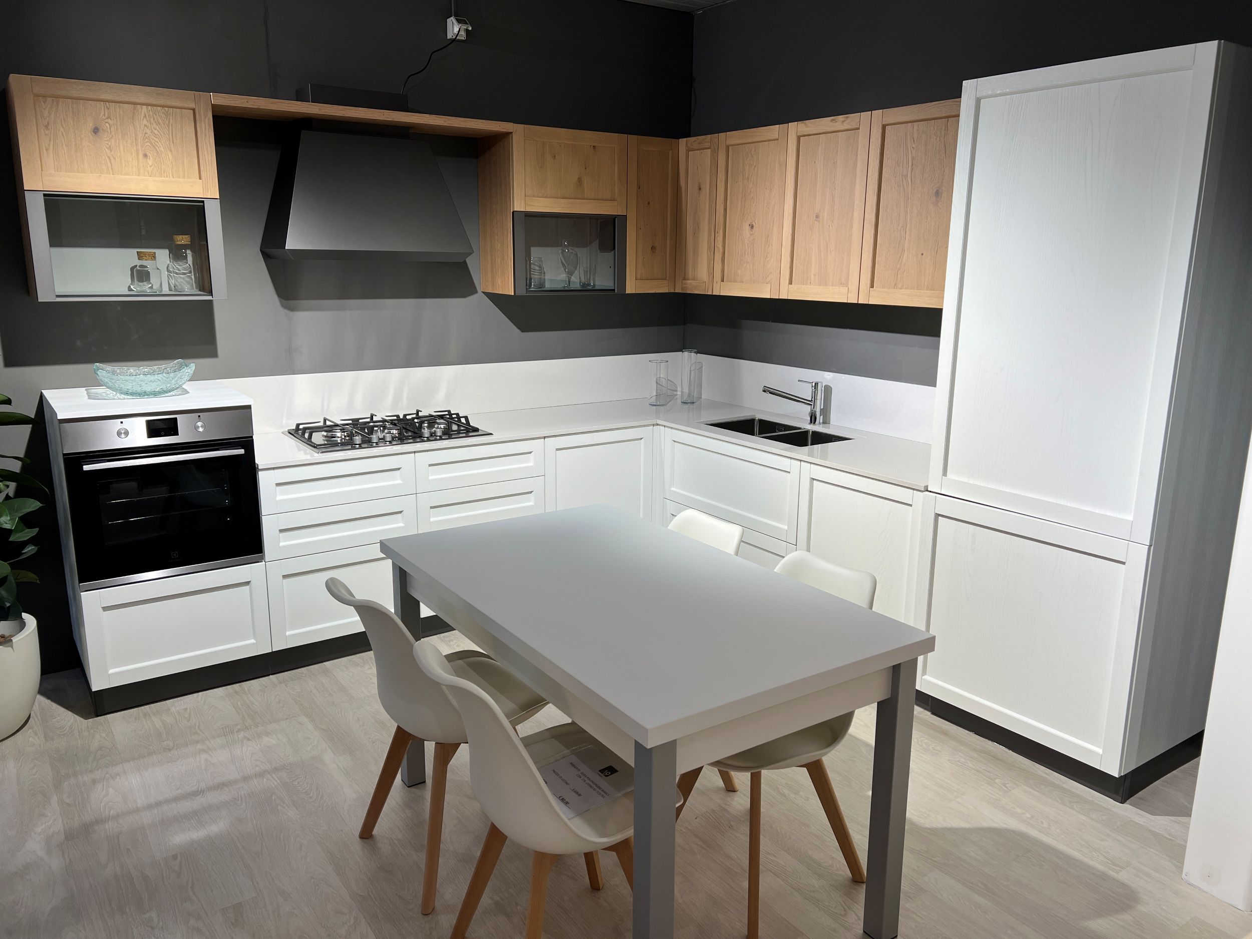 DETTAGLI E FINITURE: ante basi in laccato poro aperto opaco Bianco candido e ante pensili in Rovere naturale con maniglia integrata, piano top in quarzo fin.Perla completo di schienale h. 24 cm., miscelatore e lavello CM sottotop acciaio mod. Luce con 2 vasche. Illuminazione led sottopensile