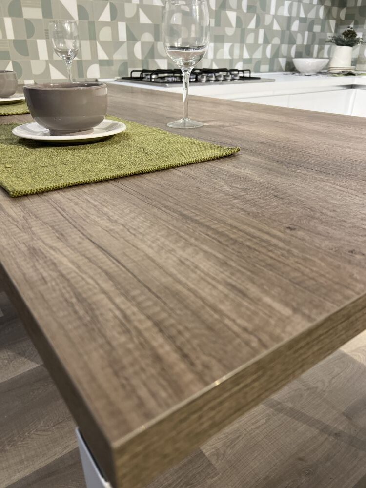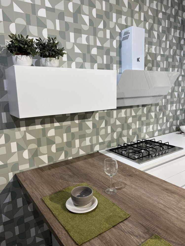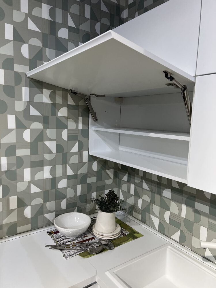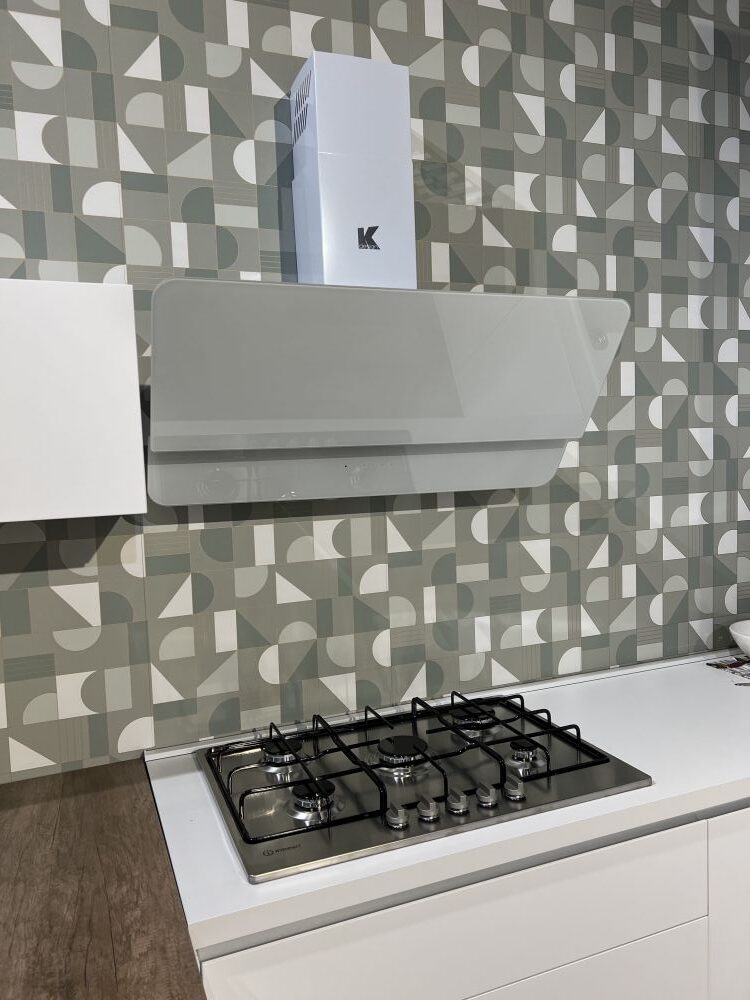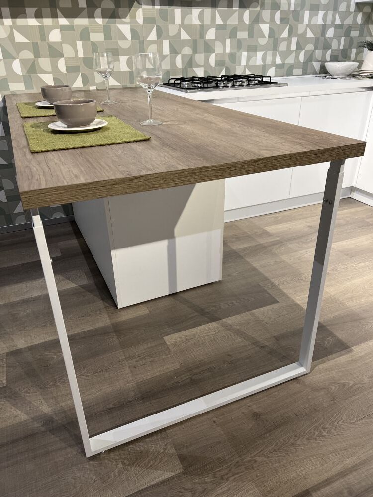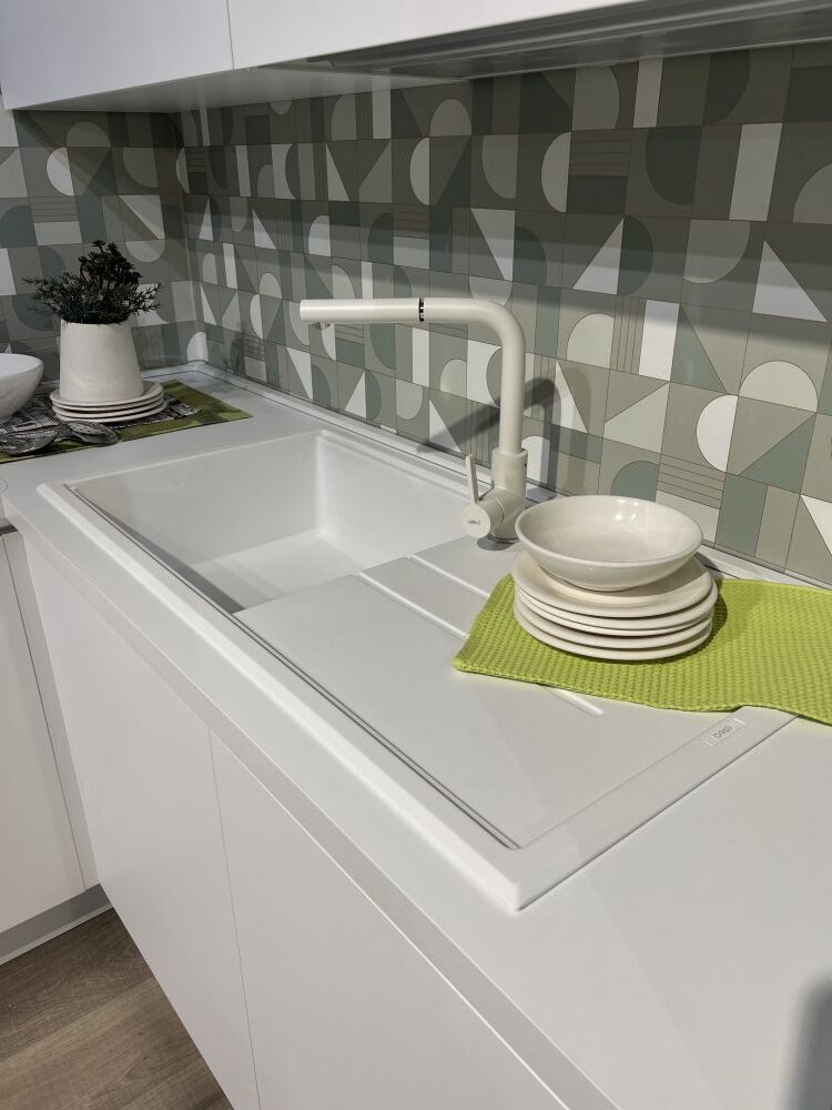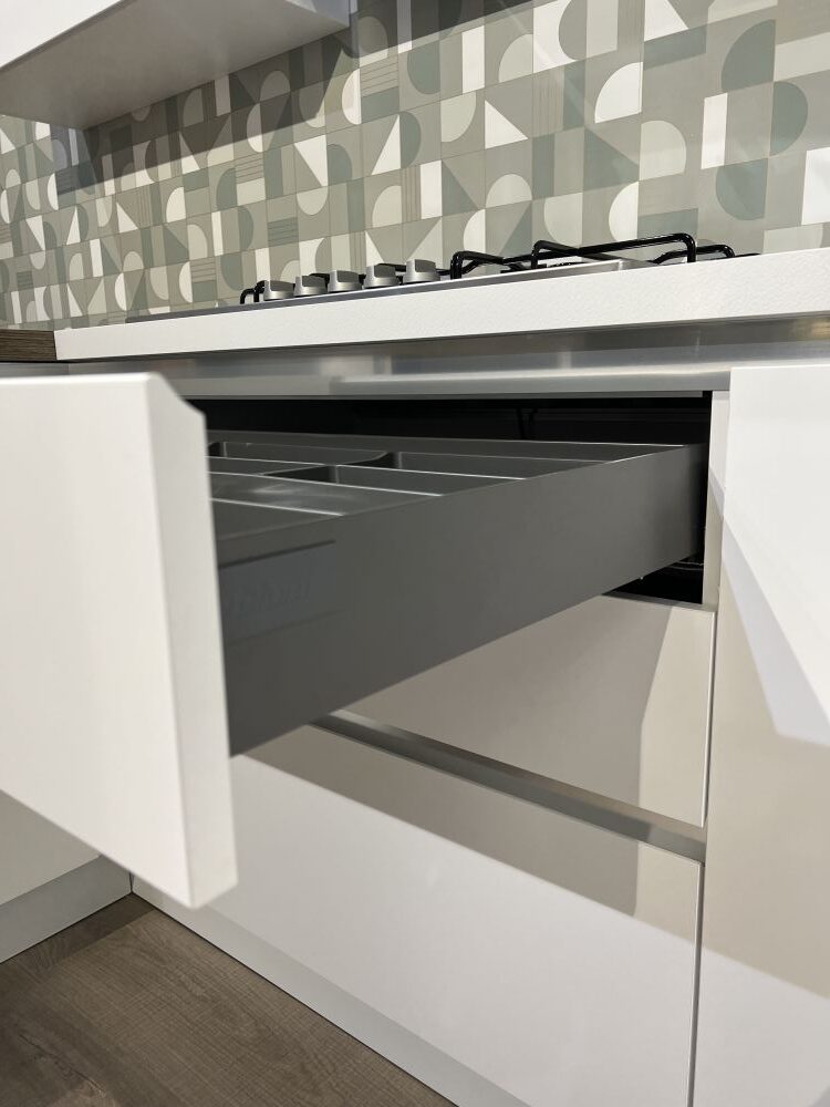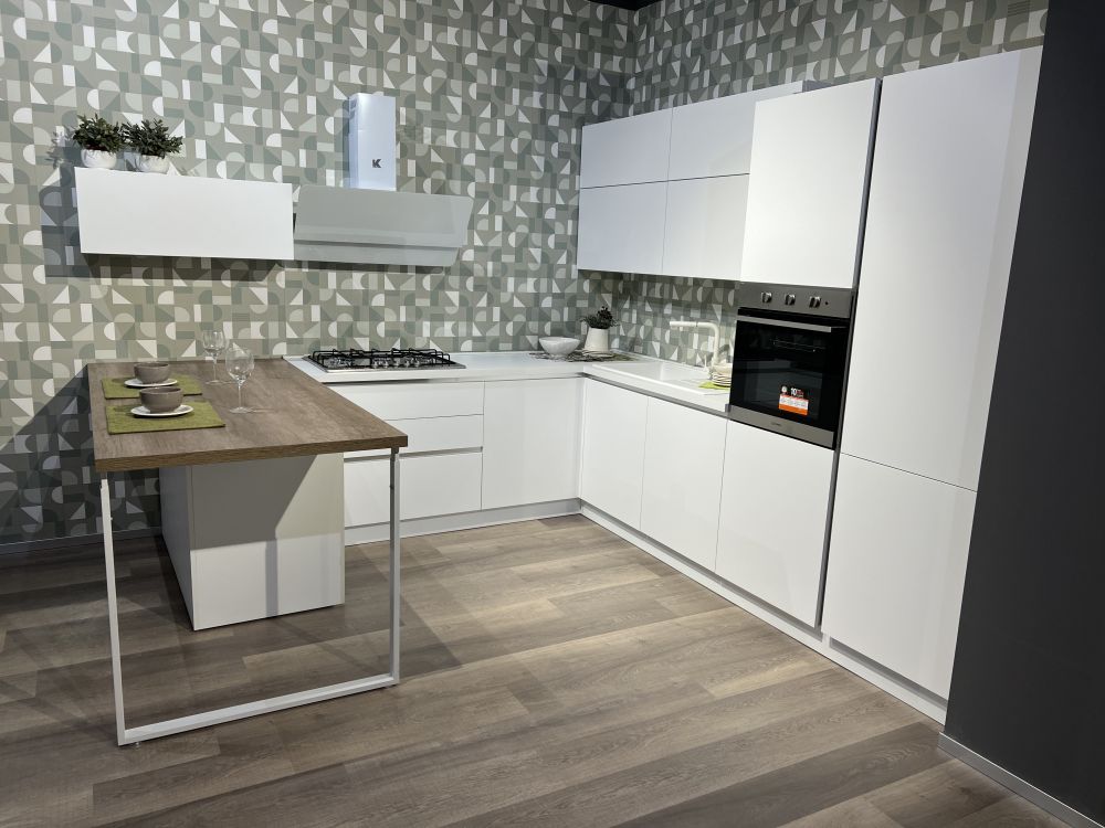 DETTAGLI E FINITURE: ante in finitura bianco opaco con gole e zoccoli bianco opaco. Piano Top sp 4 Cm in laminato fin. Bianco ghiaccio opaco e penisola in laminato fin. rovere canyon. Cappa aspirante K Design mod. Farfalla a parete in vetro. Lavello in fragranite bianco Ellecci con miscelatore abbinato. Meccanismi Blum