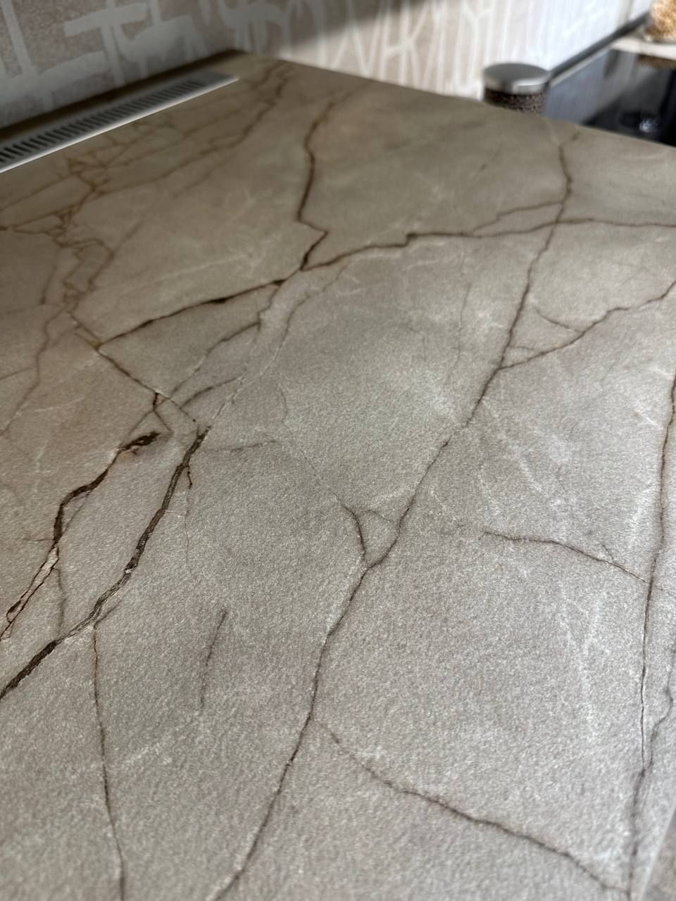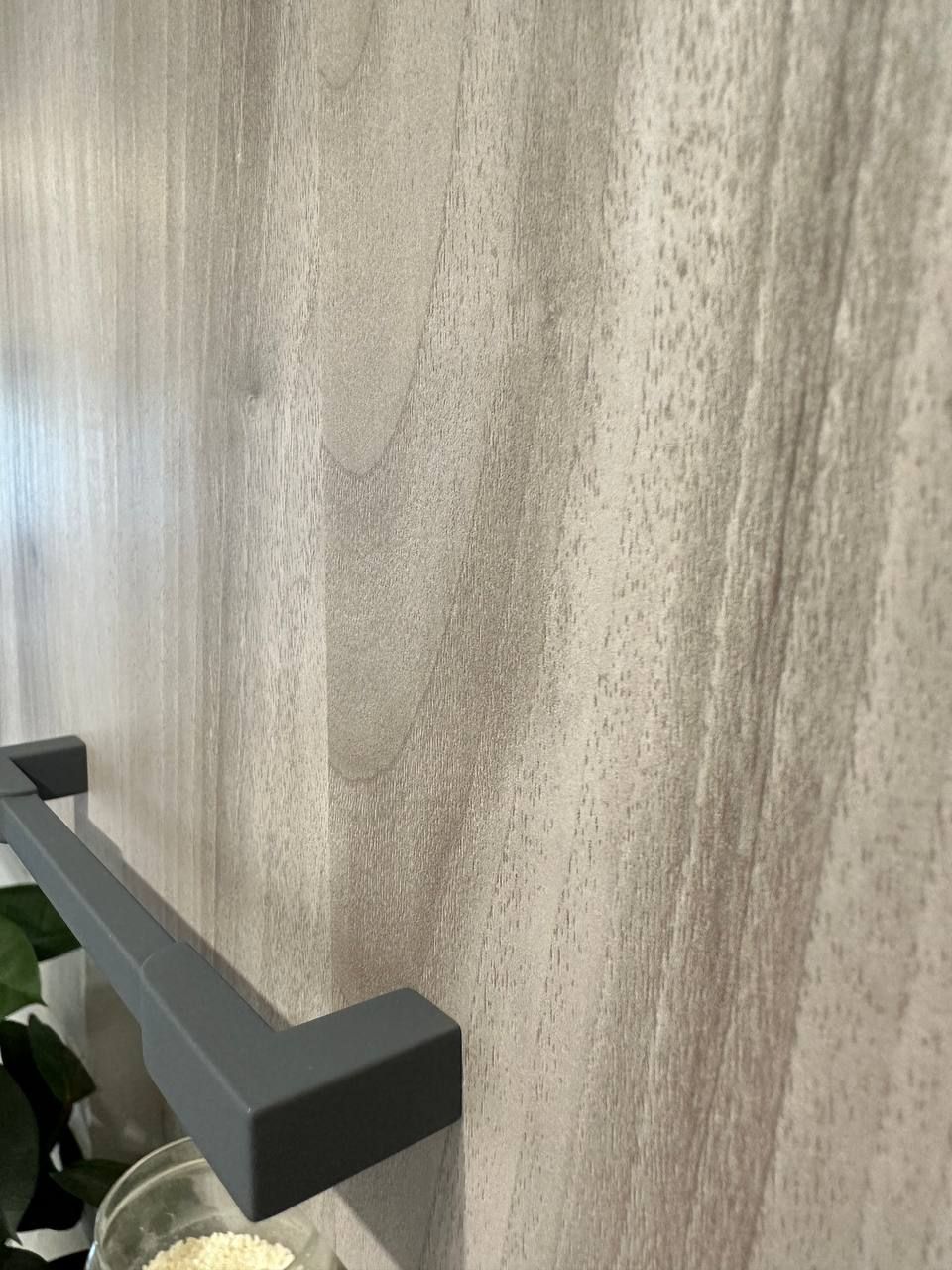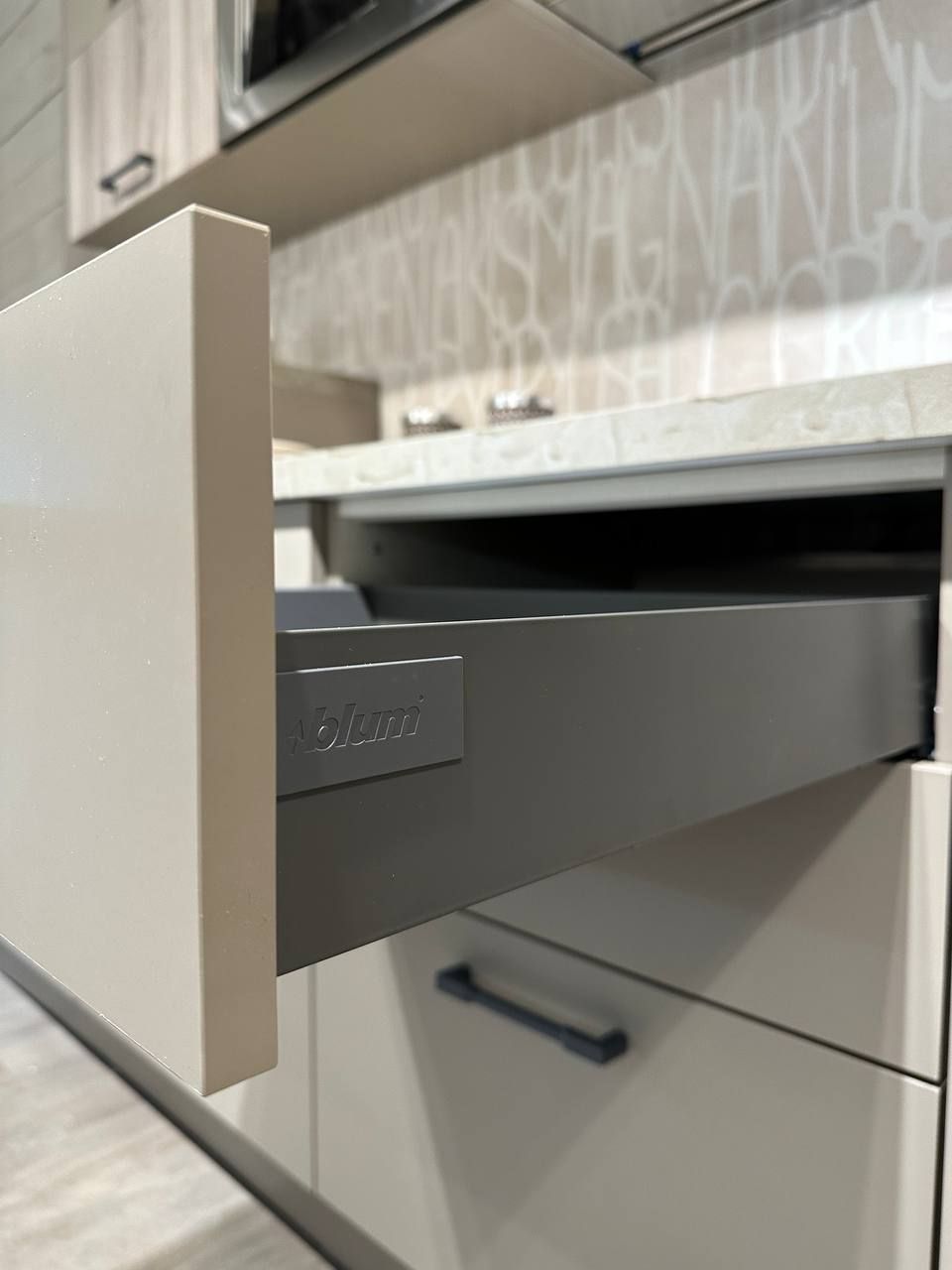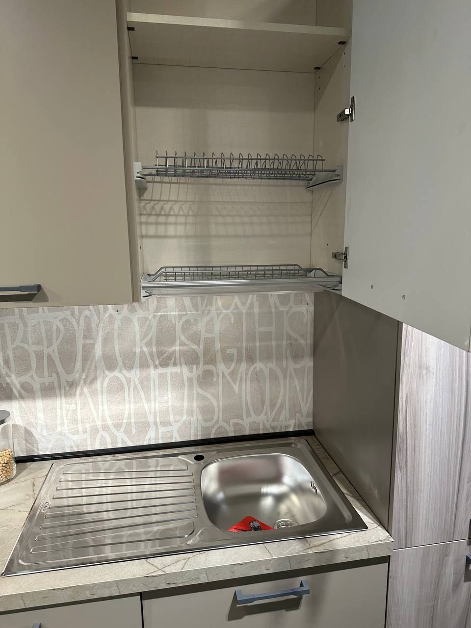 DETTAGLI E FINITURE: struttura magnolia, frontali noce artico e fango opaco, top laminato sp4 fin. Brown yule. Lavello cm 1 vasca + sgc, cappa da in casso Elica Box In, meccanismi Blum
