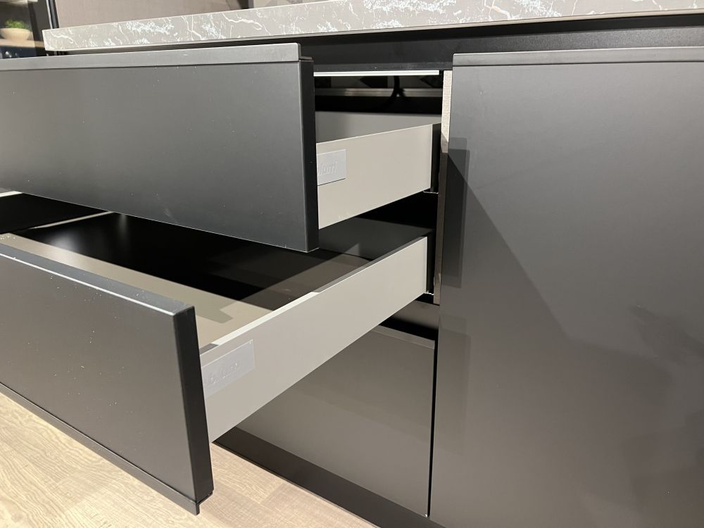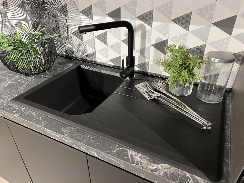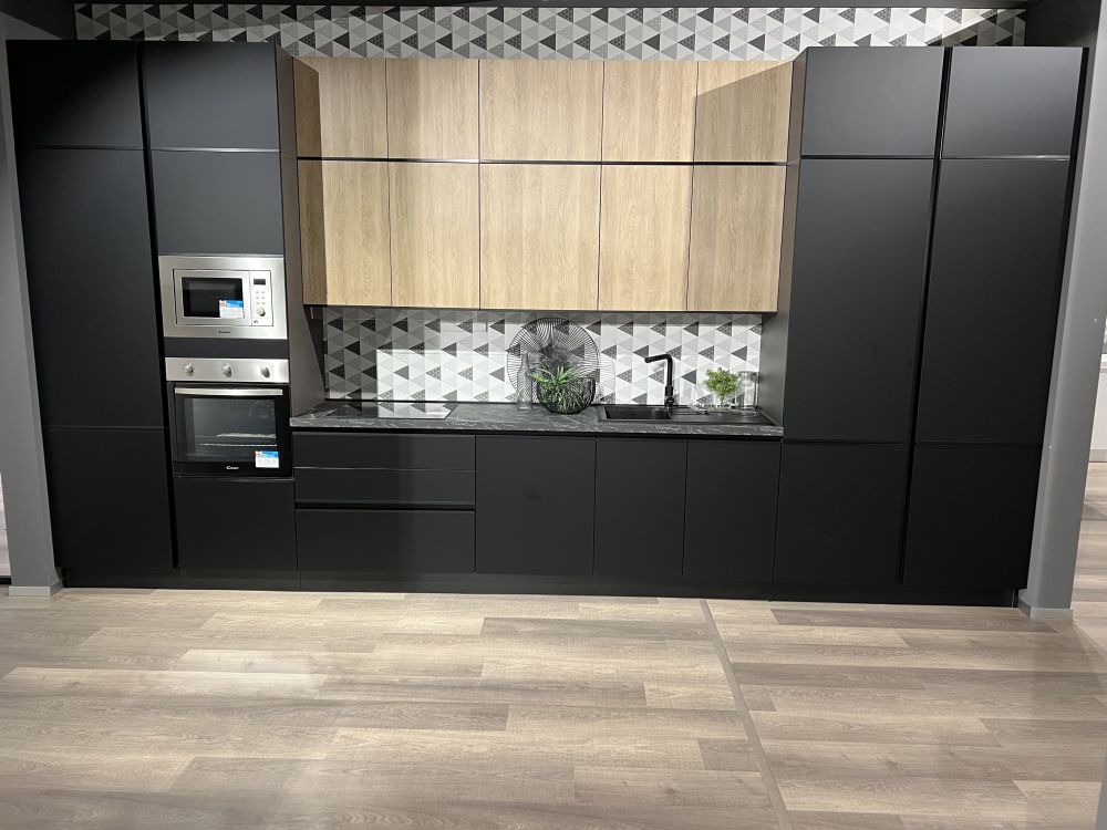 DETTAGLI E FINITURE: basi e colonne in finitura Nero Opaco, pensili in finitura Rovere Naturale, top in laminato sp 4 cm fin. Marmo Nero, zoccolo H 12 cm nero. Lavello 1 vasca unica nera Elleci, miscelatore incluso. Meccanismi Blum