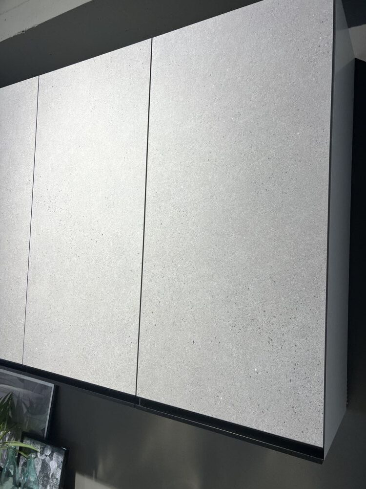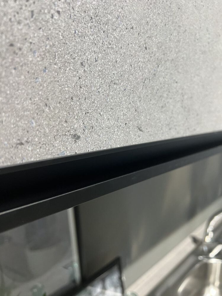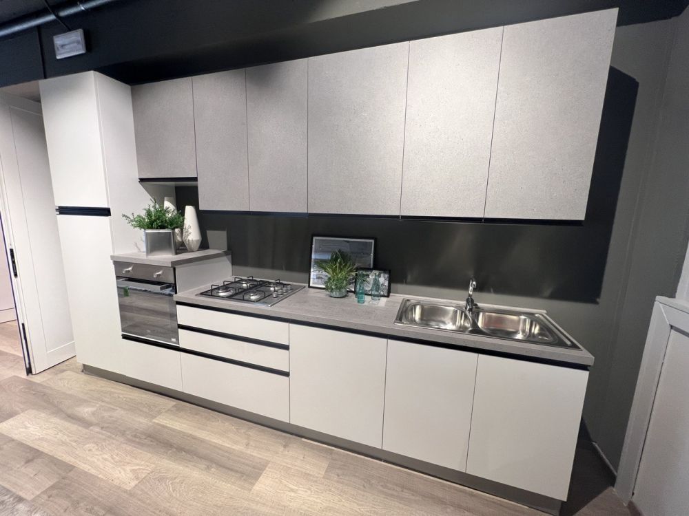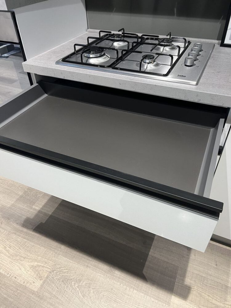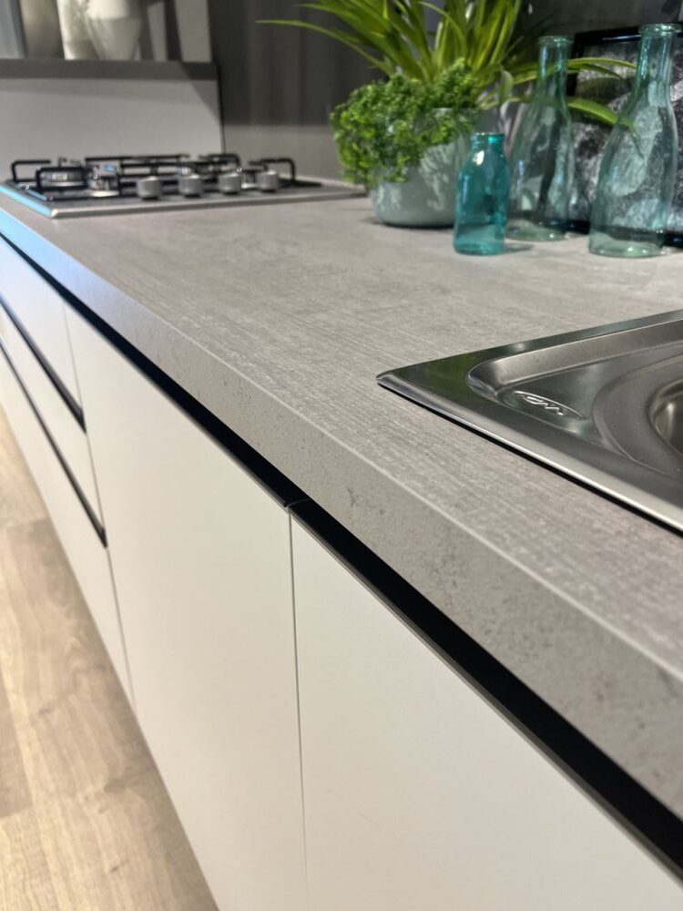 DETTAGLI E FINITURE: frontali colonne e basi bianco opaco, frontali pensili pietra grafite, struttura bianco, maniglia integrata nero ossidato, zoccolo H 12 color alluminio. Top laminato H4 finitura grigio cemento P 60