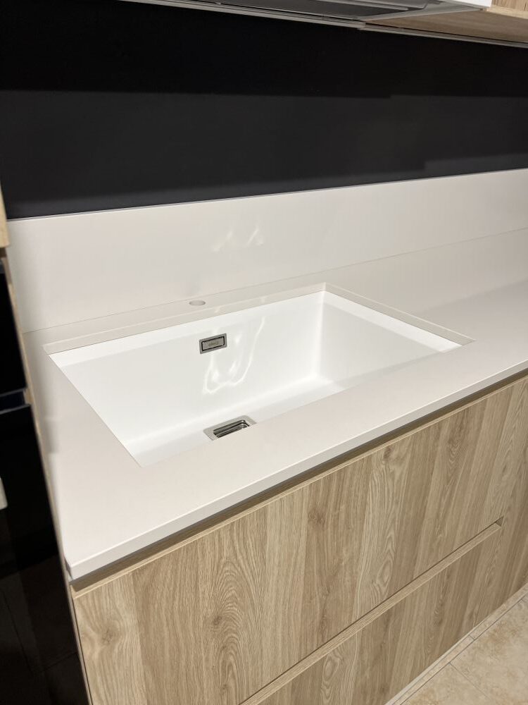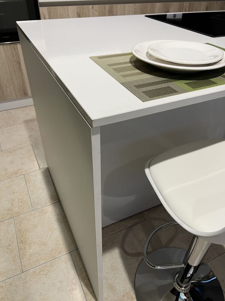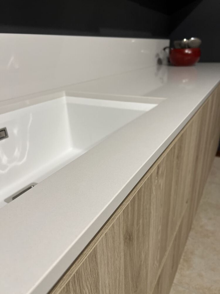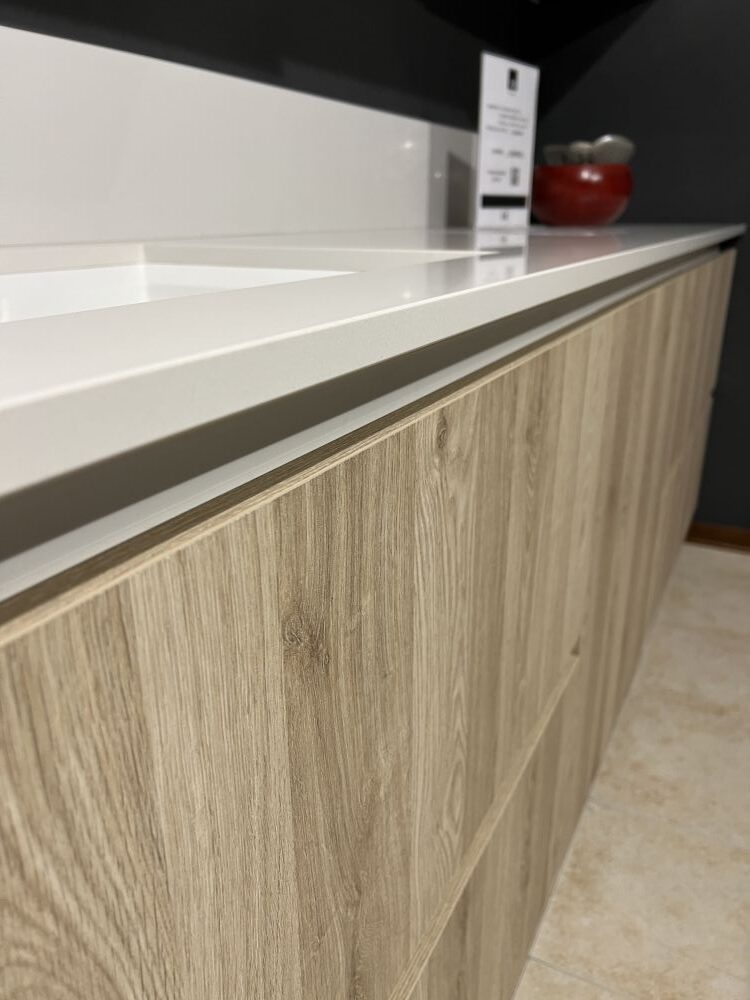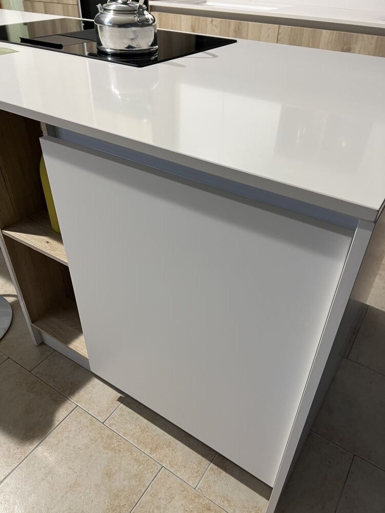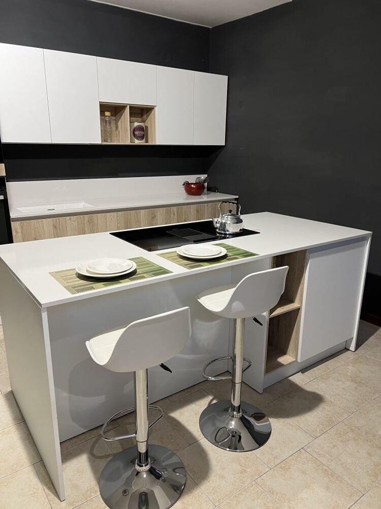 DETTAGLI E FINITURE: ante basi e colonne in tinta rovere corteccia, ante isola in laminato bianco, gola bianca e vani a giorno in tinta rovere corteccia. Piano top e alzatina in quarzo bianco sp. 2 cm, lavello Elleci vasca unica sotto top da 66 x 41 cm