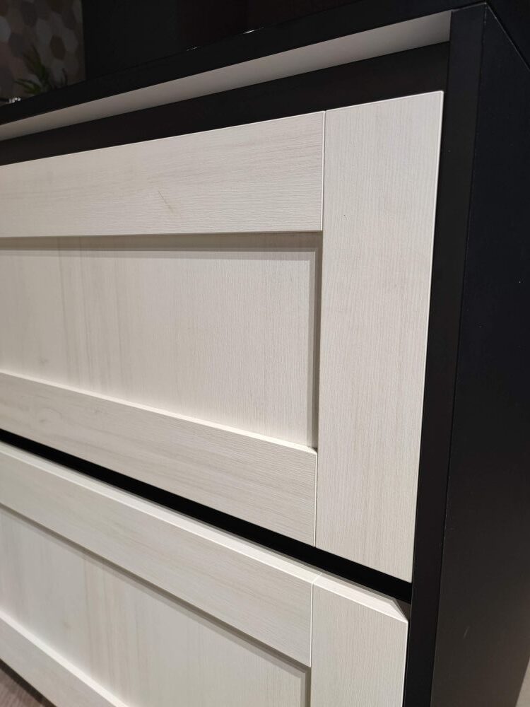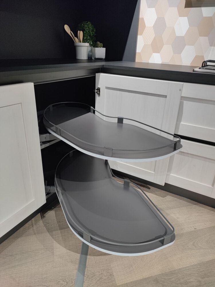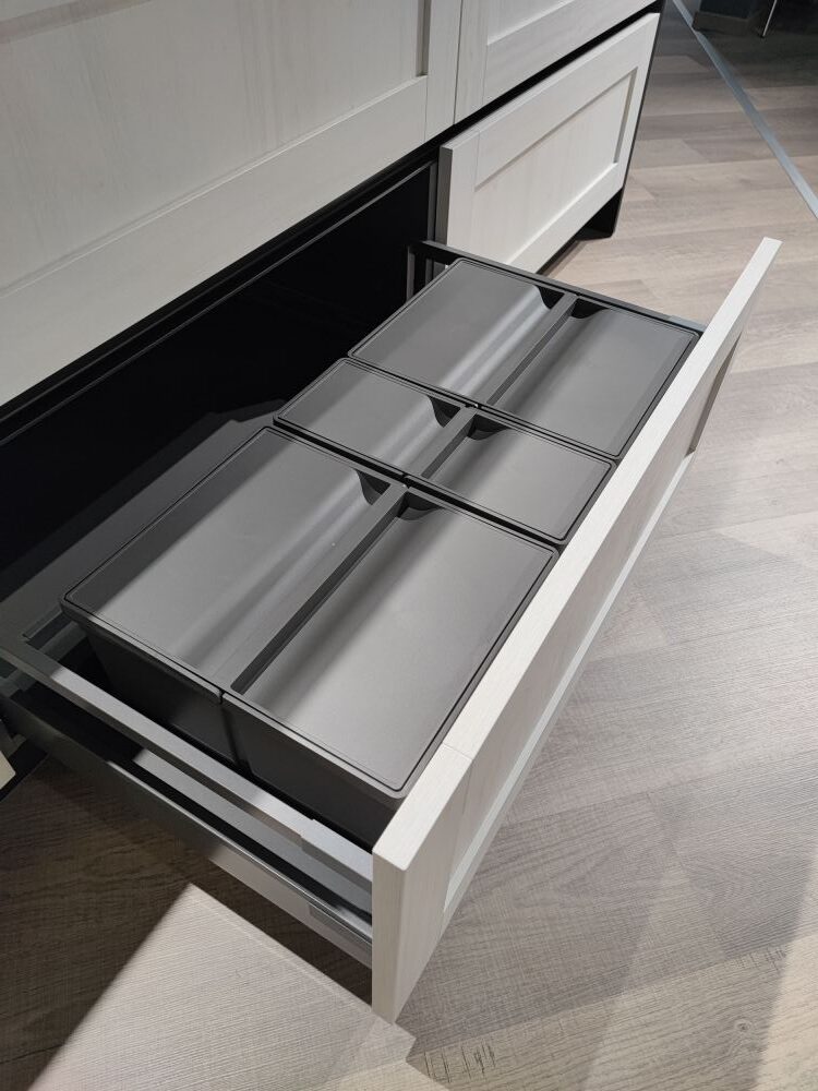 DETTAGLI E FINITURE: finitura basi e colonne in larice, finitura pensili e snack Rovere Scott, top sp. 2 cm e schienali in Fenix nero. Cappa Falmec mod. Verso, lavello Franke in acciaio inox L 73 x 51 cm, miscelatore Franke, barra porta utensili in acciaio, angolo con cestoni estraibili, pattumiere incluse