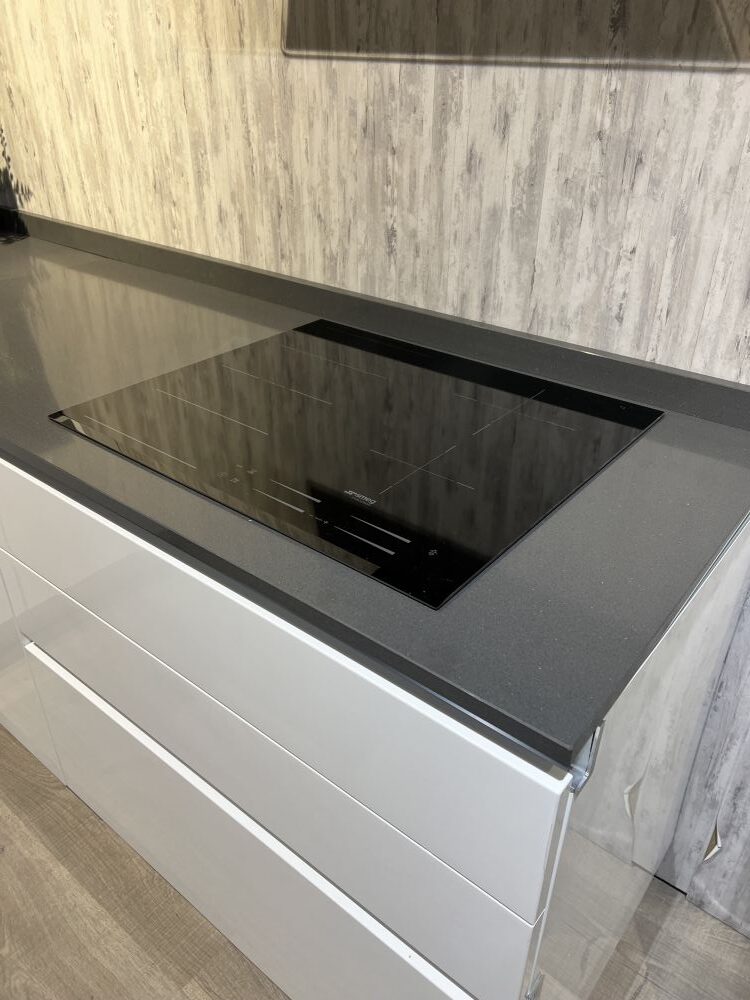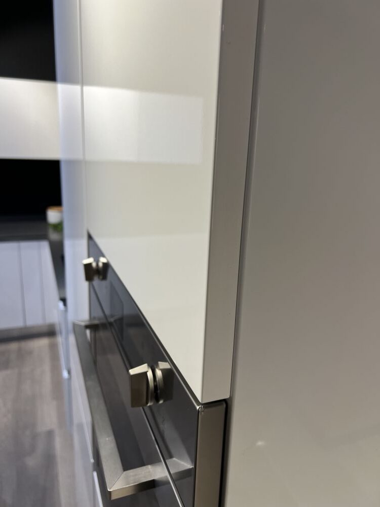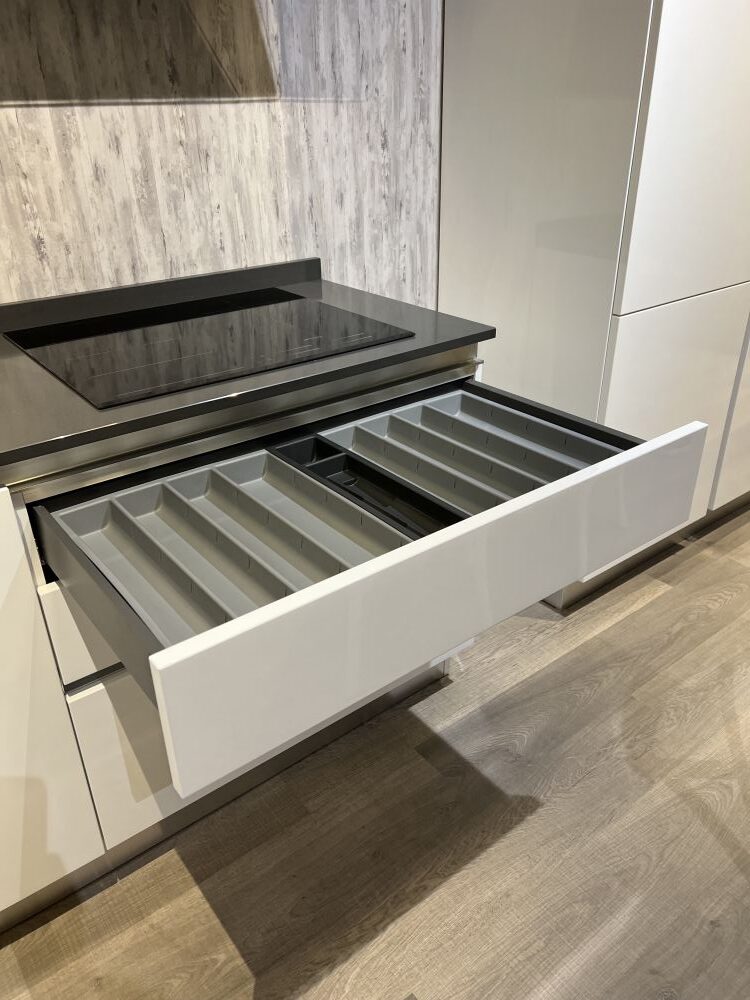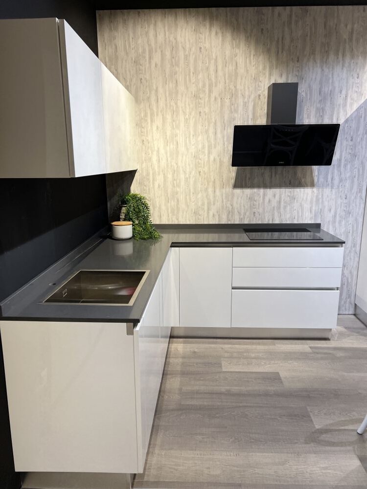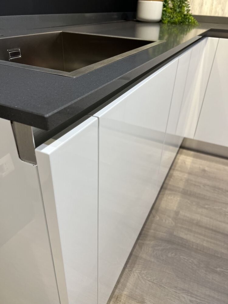 DETTAGLI E FINITURE: finitura laccato bianco lucido, gole e zoccoli inox, top quarzo grigio