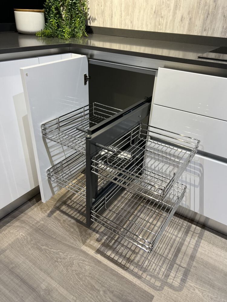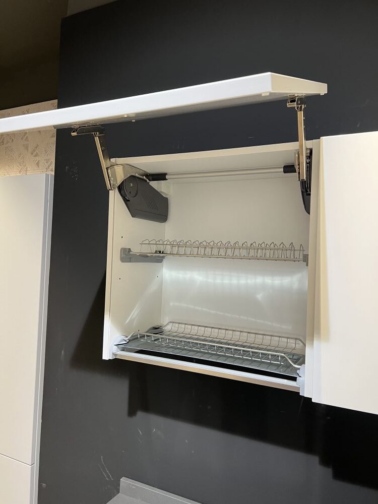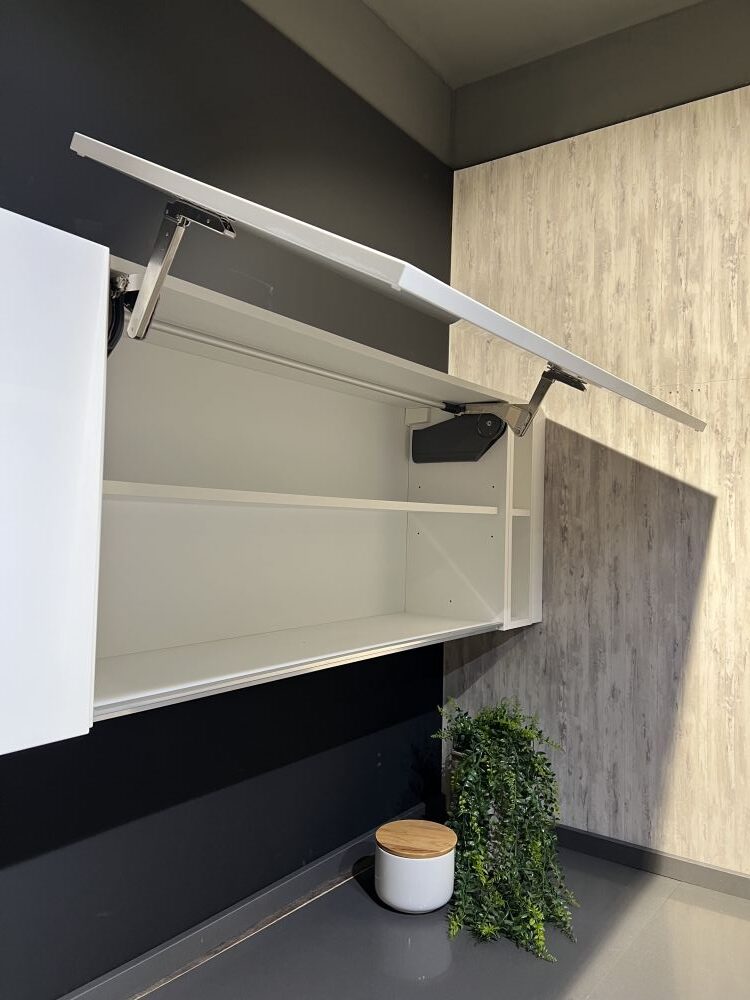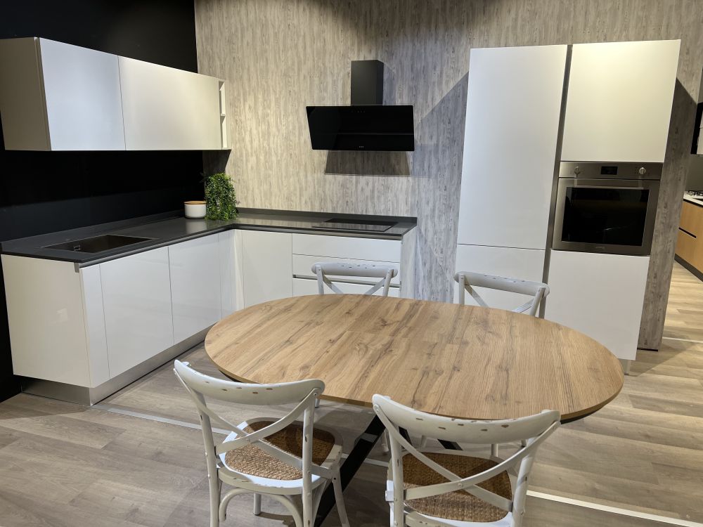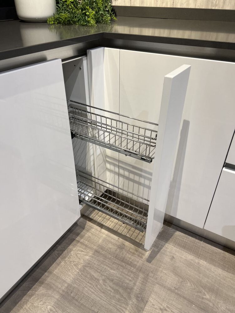 DETTAGLI E FINITURE: finitura laccato bianco lucido, gole e zoccoli inox, top quarzo grigio