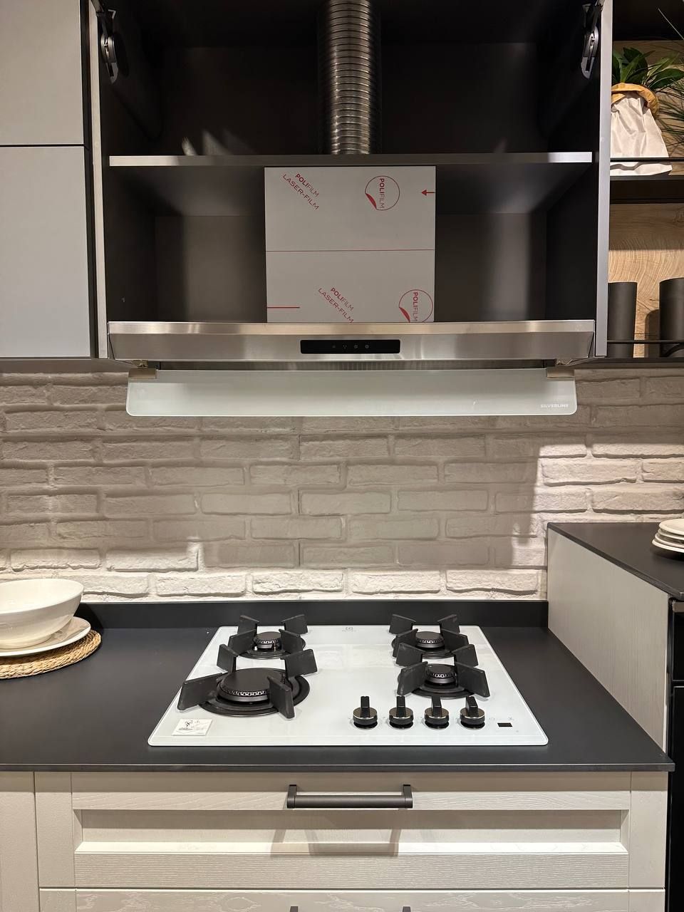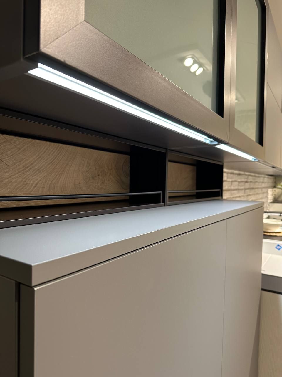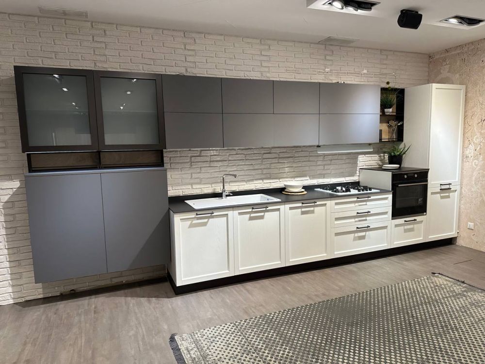 DETTAGLI E FINITURE: ante colonne e basi in legno frassino bianco candido, pensili in finitura grigio opaco, elemento a giorno con fondo rovere nodato. Piano top gres sp. 1,2 cm finitura notturno naturale. Lavello Franke in fragranite bianco con miscelatore cromato. Cappa Silverline.