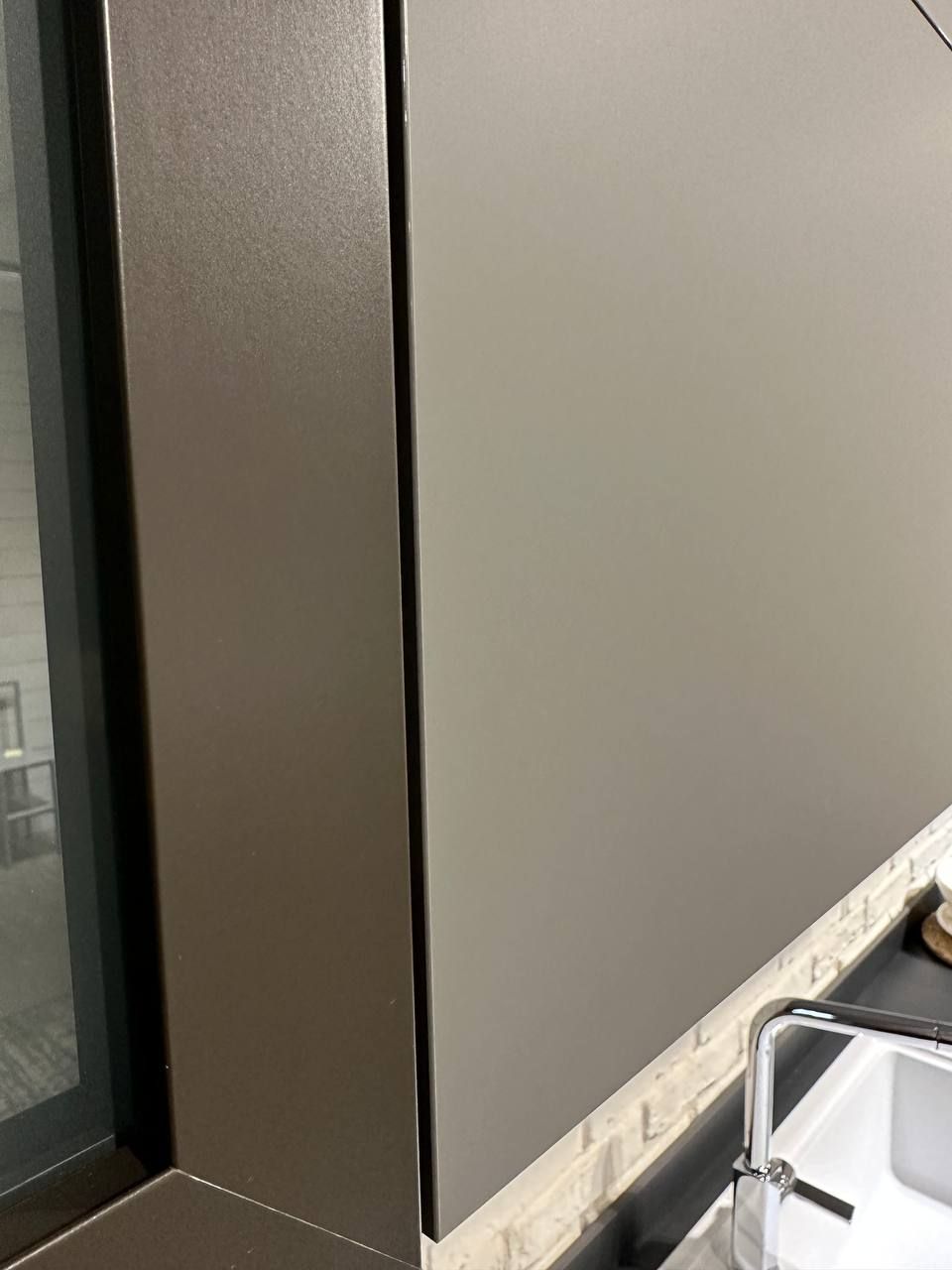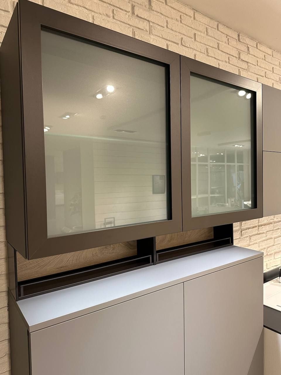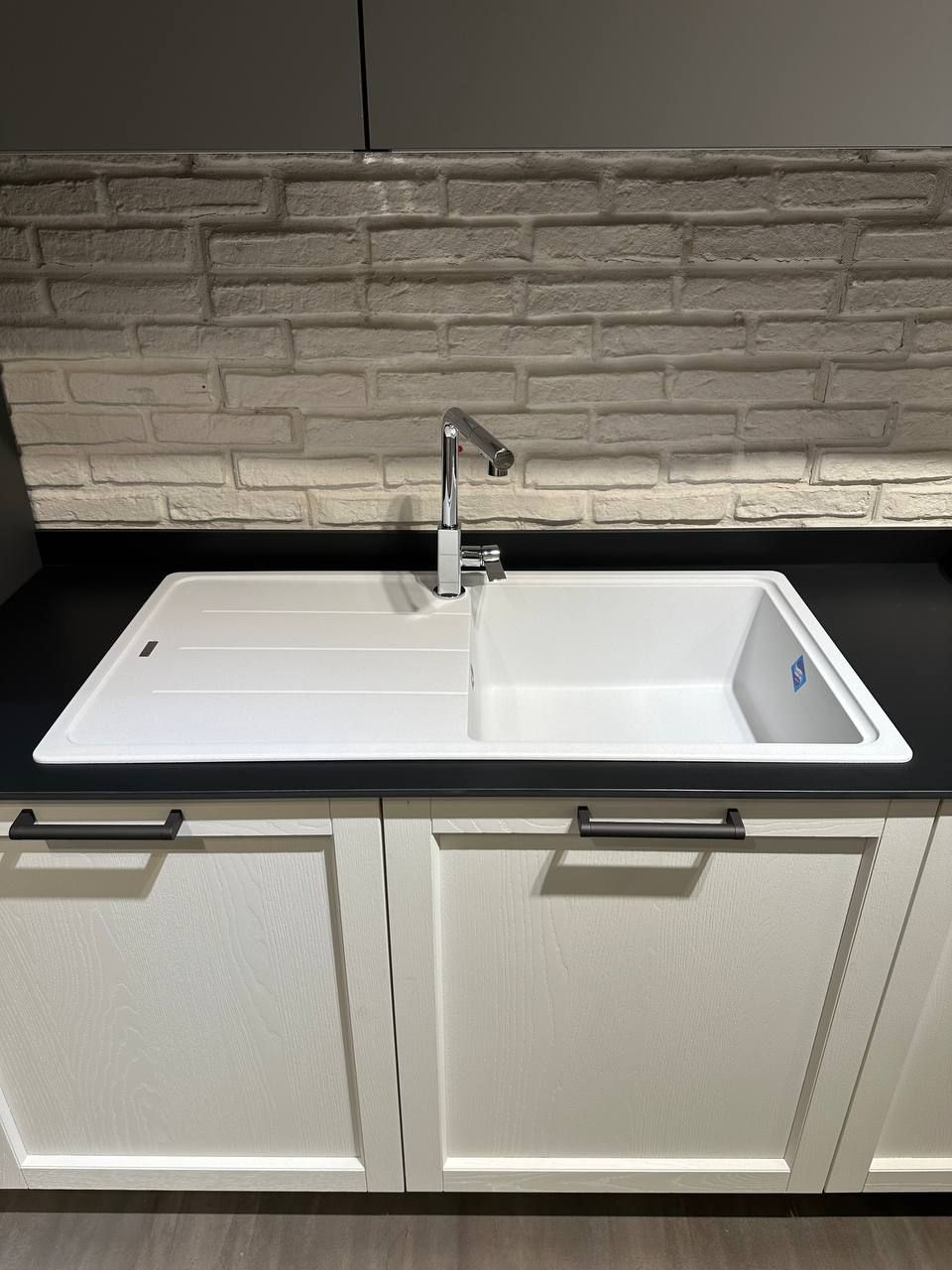 DETTAGLI E FINITURE: ante colonne e basi in legno frassino bianco candido, pensili in finitura grigio opaco, elemento a giorno con fondo rovere nodato. Piano top gres sp. 1,2 cm finitura notturno naturale. Lavello Franke in fragranite bianco con miscelatore cromato. Cappa Silverline.