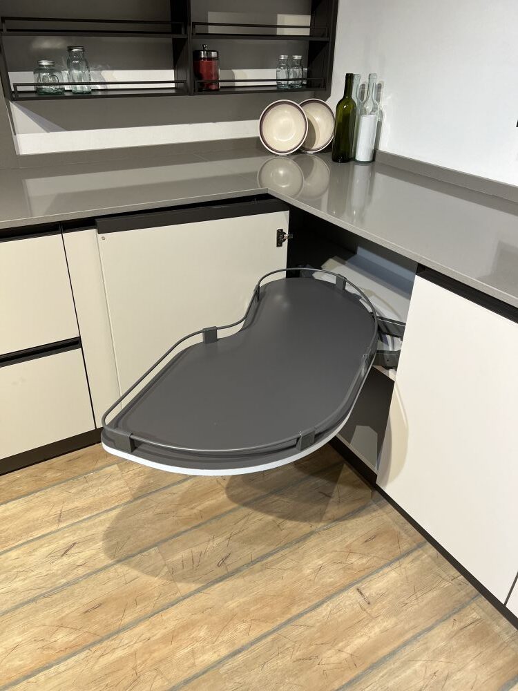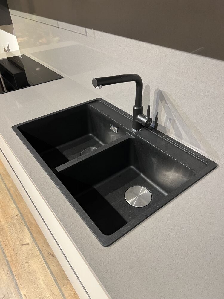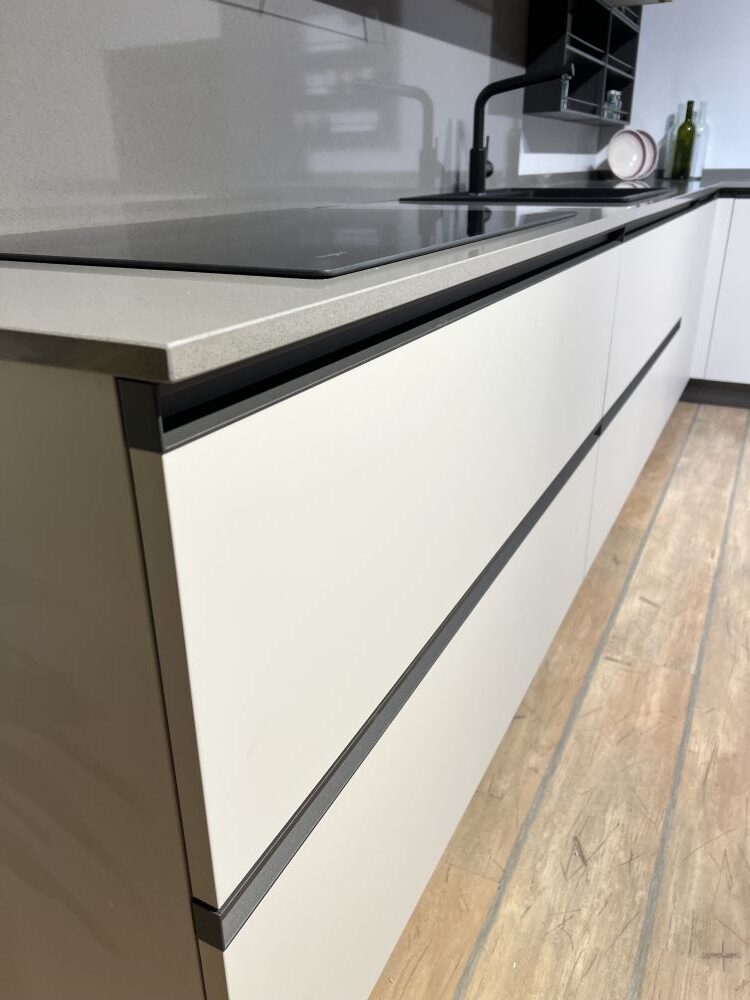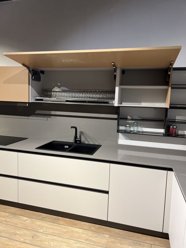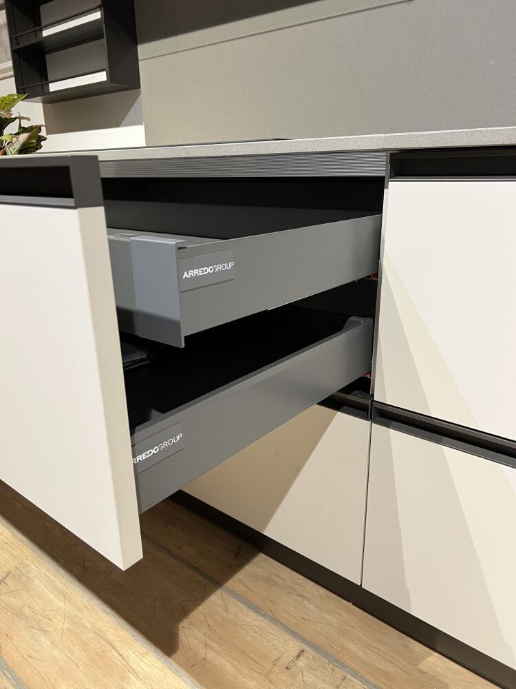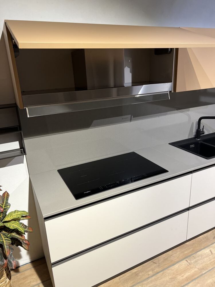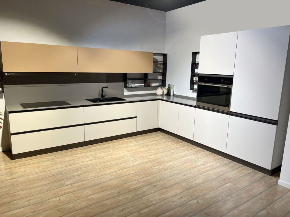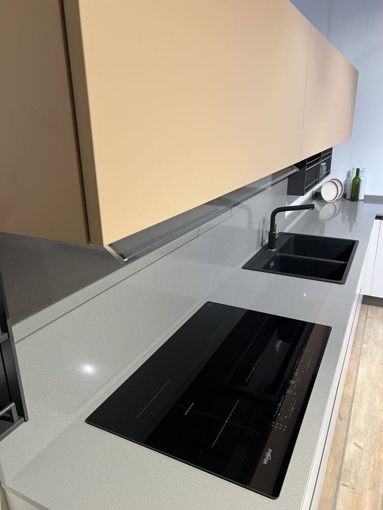 DETTAGLI E FINITURE: basi e colonne finitura deserto e pensili finitura pesca, top quarzo sp. 2 cm grigio 12, cappa ad incasso Faber da 120 cm, lavello 2 vasche Franke in fragranite nero con miscelatore Franke con doccia nero
