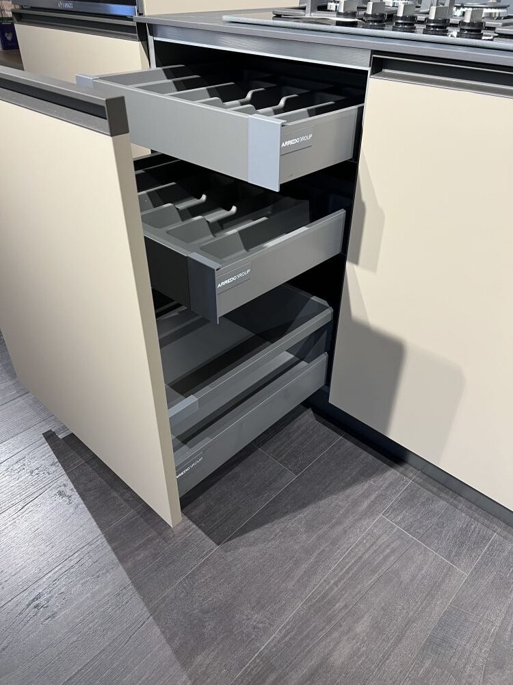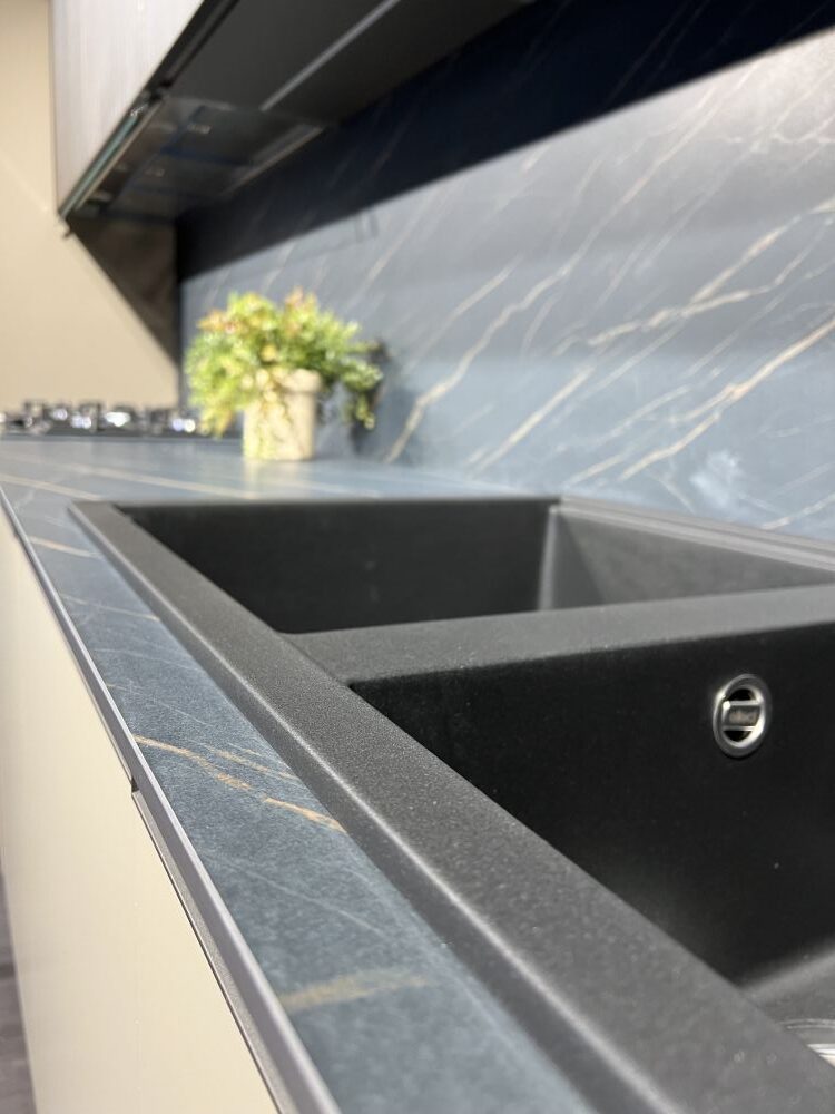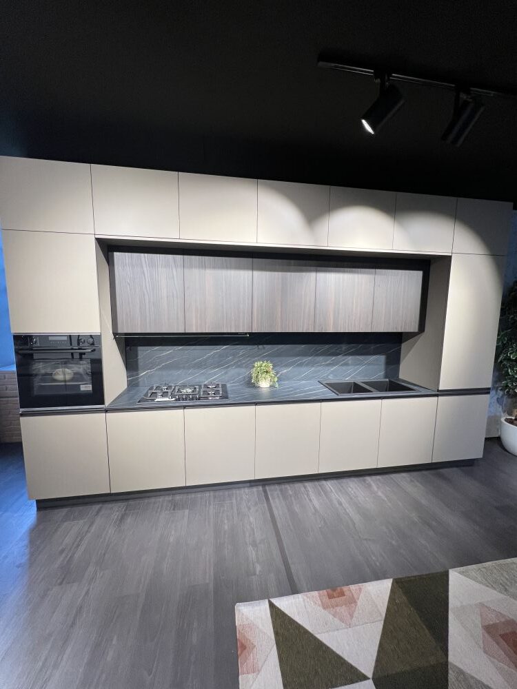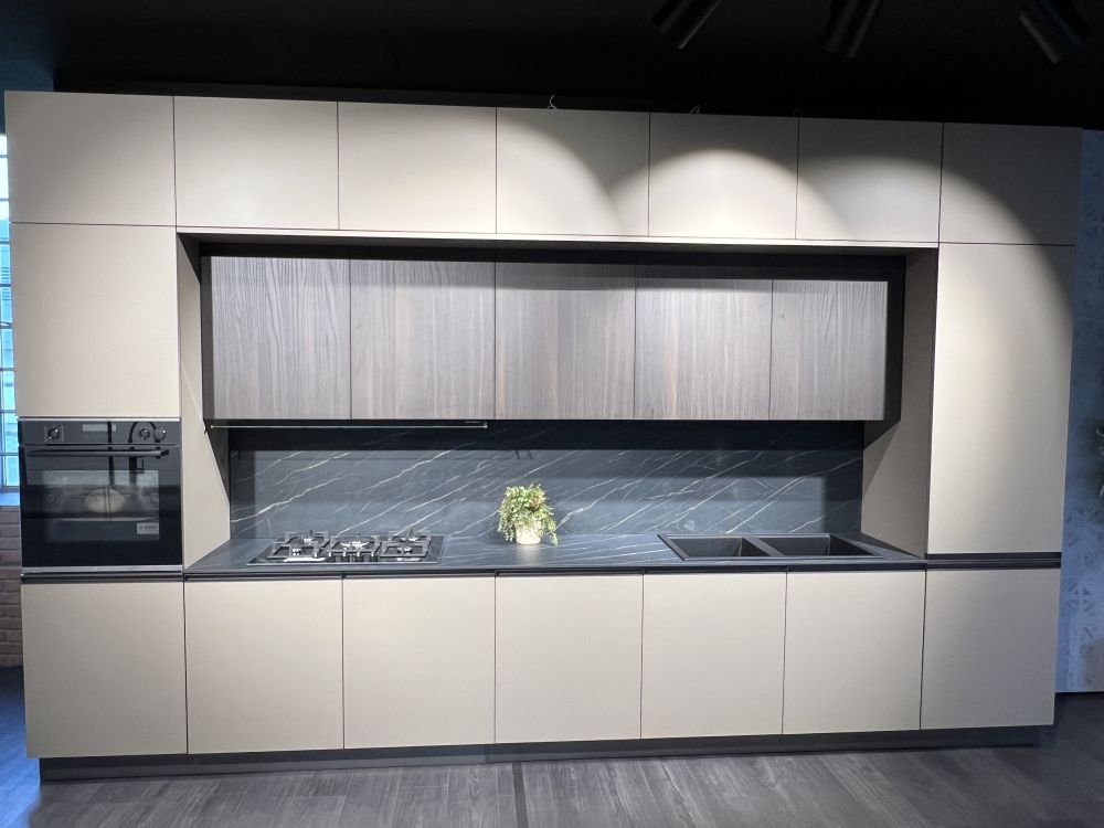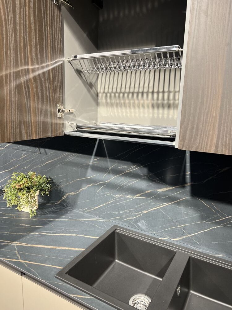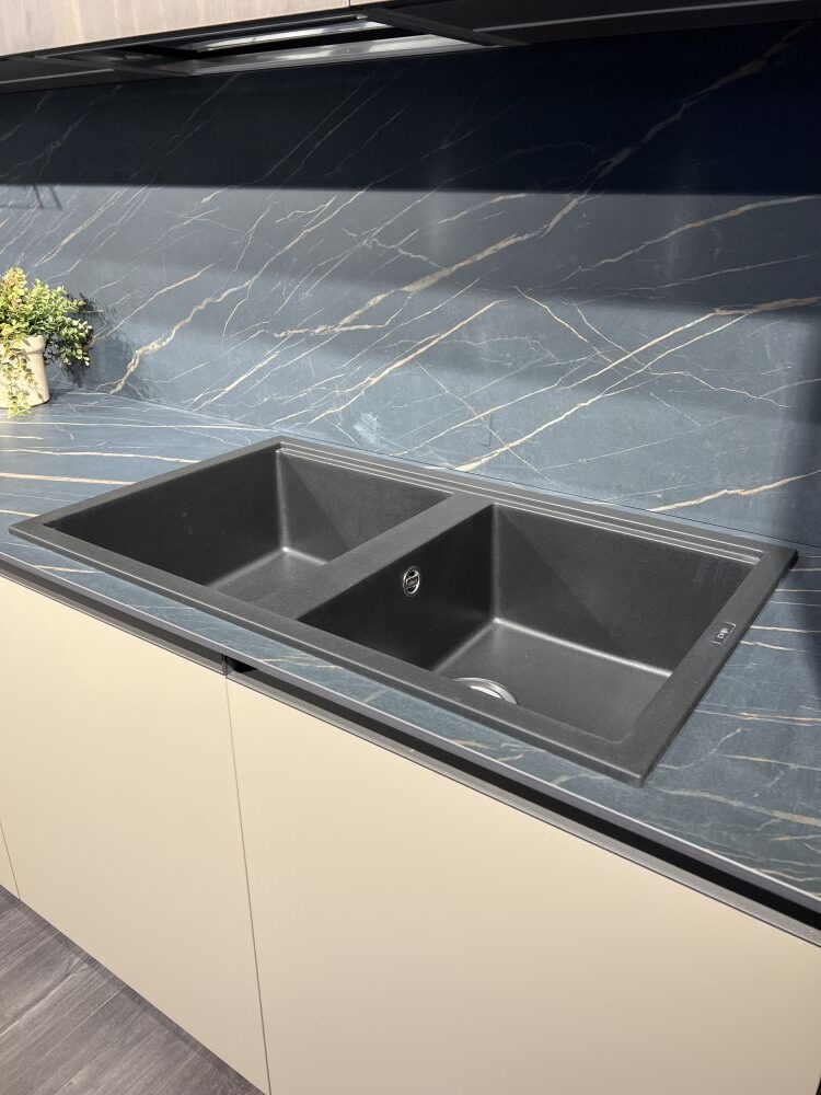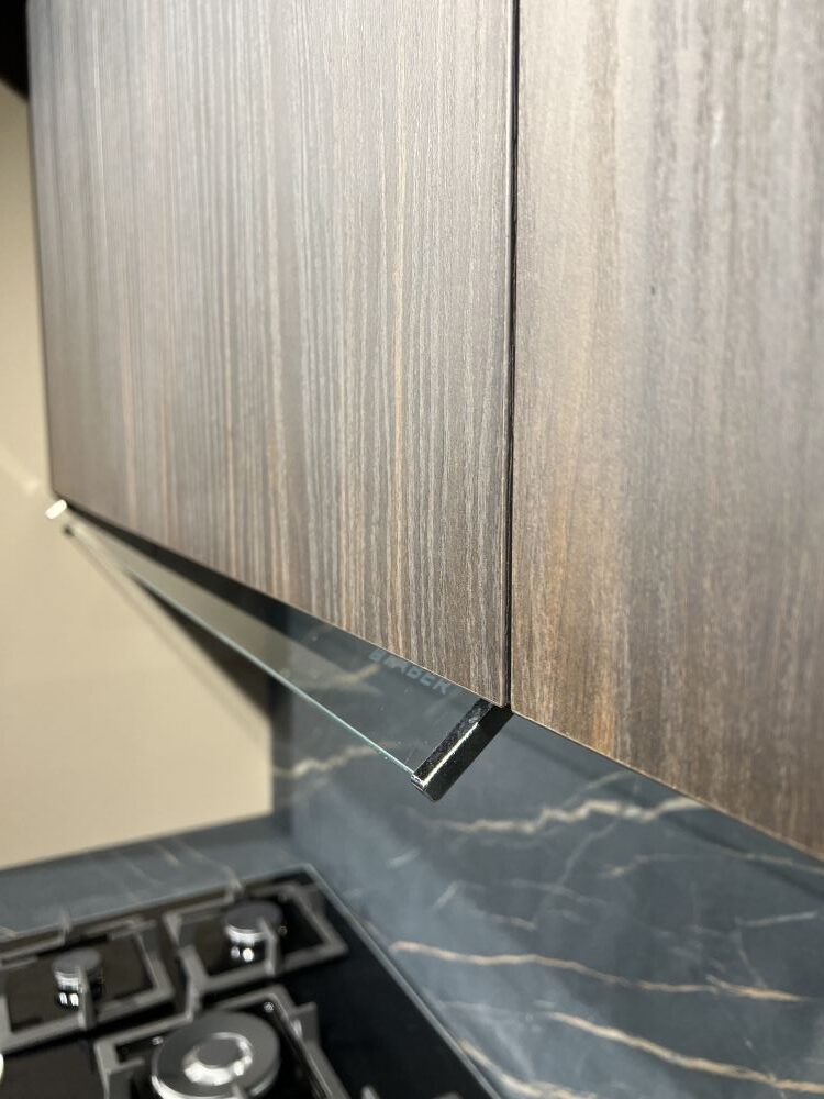 DETTAGLI E FINITURE: basi, colonne e sopra colonne laccato UV, pensili finitura rovere scott, maniglia integrata finitura piombo, top gres sp. 1,2 cm nero dorato naturale con schienale in tinta, zoccolo H.12 cm piombo. Lavello Elleci 2 vasche Nero, Cappa integrata Faber L 120 cm