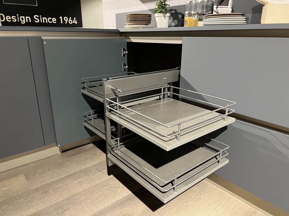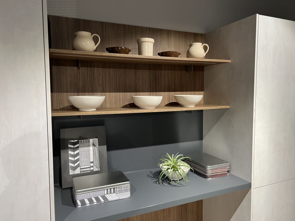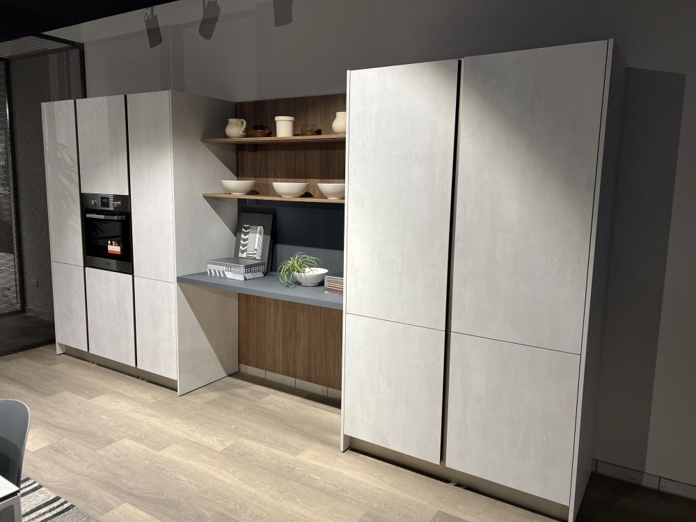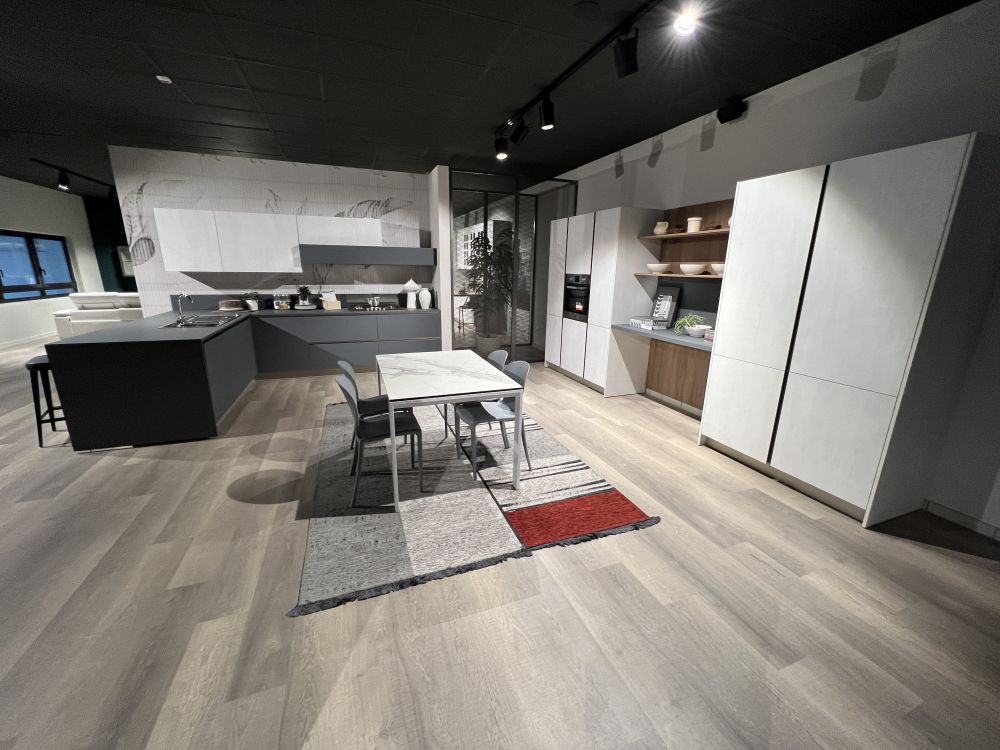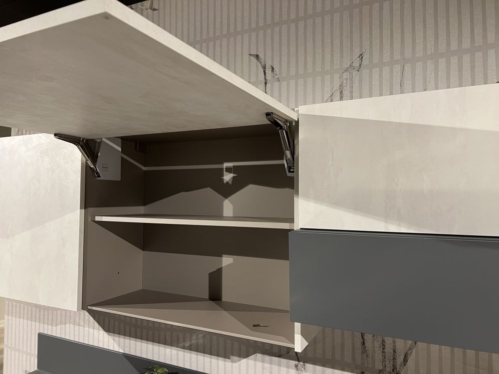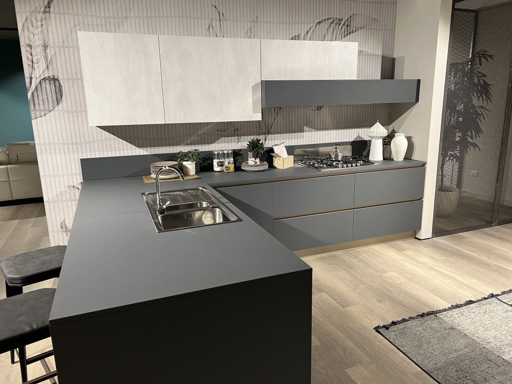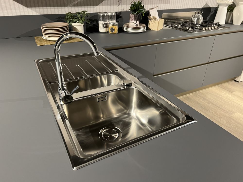 DETTAGLI E FINITURE: struttura rose, frontali basi fenix verde comodoro, frontali pensili e colonne laminato cemento bianco, gole titanio, zoccolo H 12 cm titanio; Piano Top Fenix Verde Comodoro Sp. 2cm