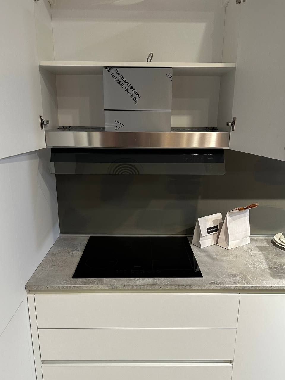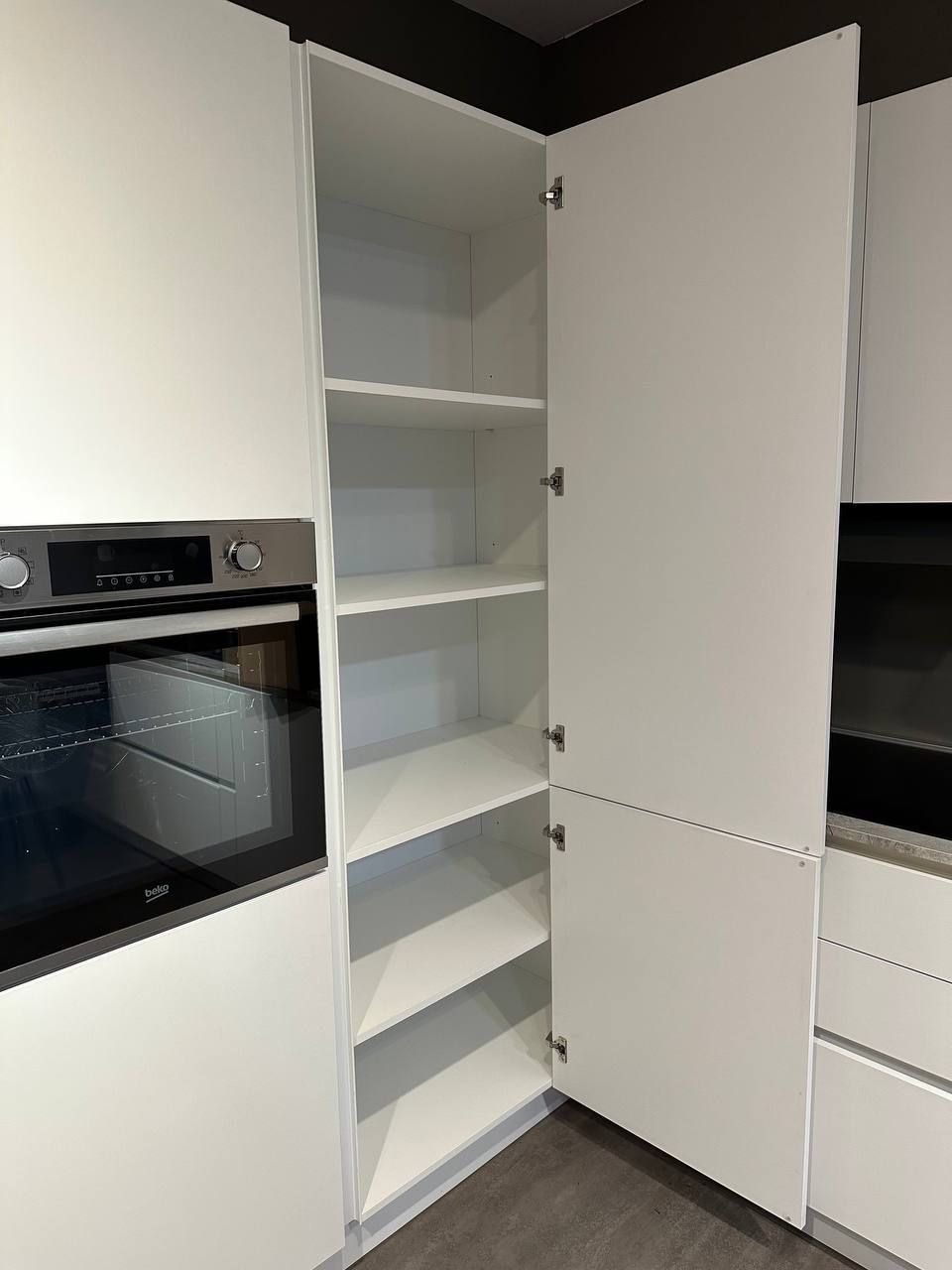 DETTAGLI E FINITURE: struttura bianca, frontali bianco soft, zoccolo e gola bianco. Cappa Falmec, lavello Franke 1 vasca in acciaio. Piano top in laminato sp. 2 cm e penisola in laminato sp. 4 cm