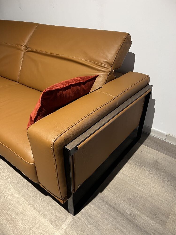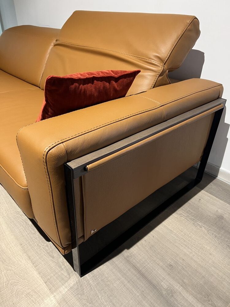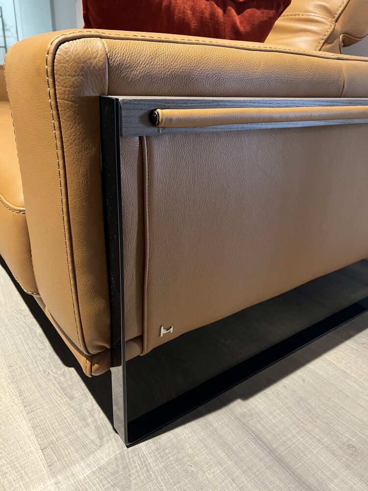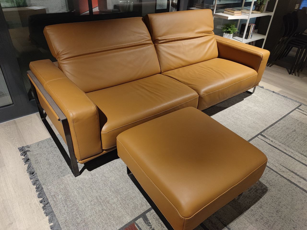DETTAGLI E FINITURE: salotto e pouf rivestiti in pelle cat. CK col. 2151 Botero Cuoio. Piedini in finitura Titanio