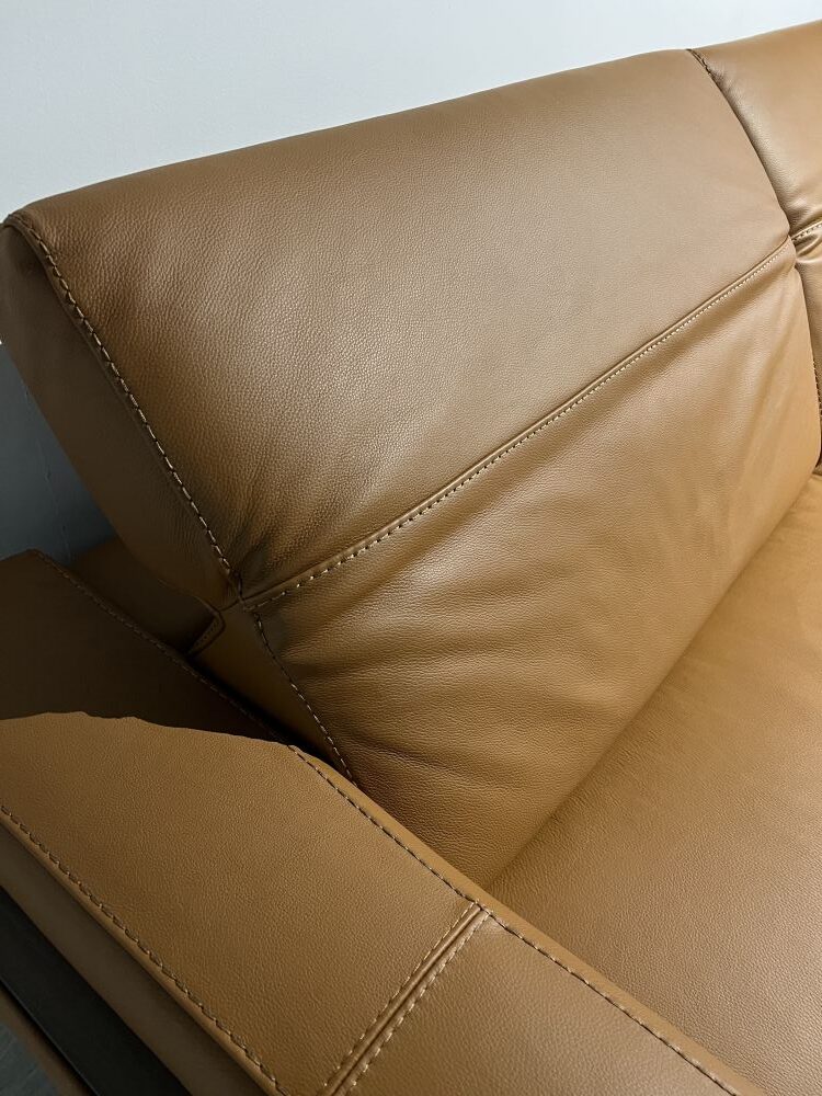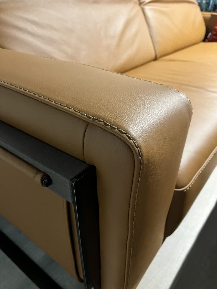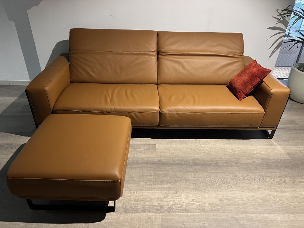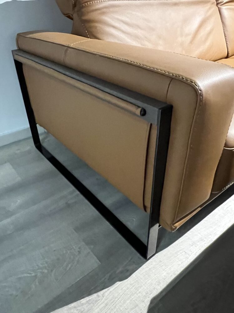 DETTAGLI E FINITURE: salotto e pouf rivestiti in pelle cat. CK col. 2151 Botero Cuoio. Piedini in finitura Titanio
