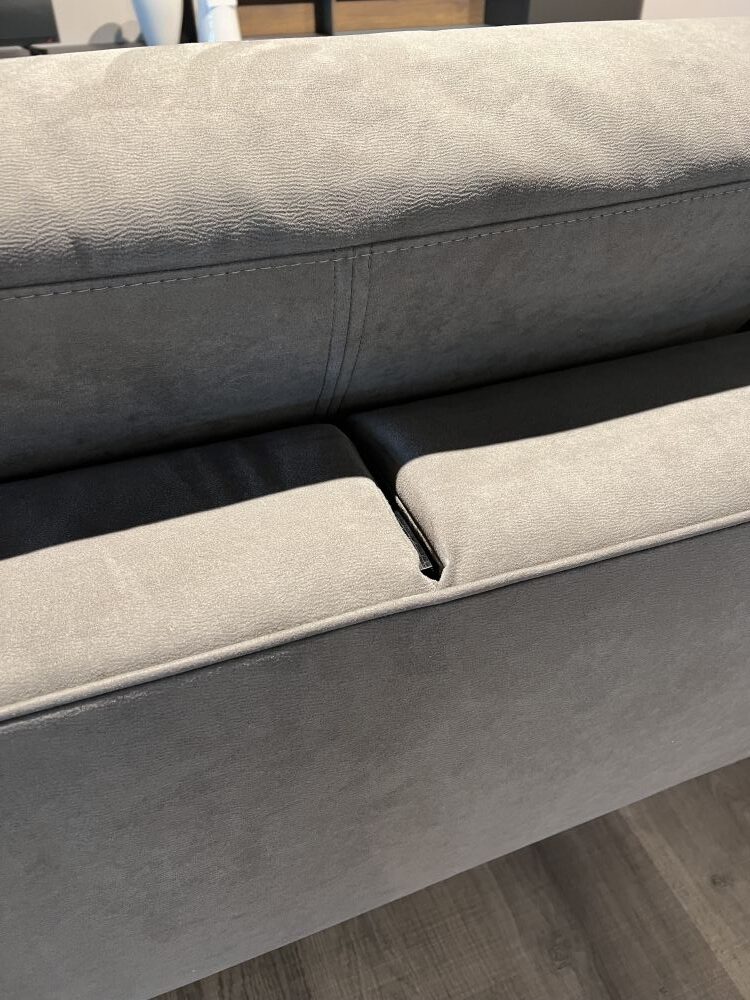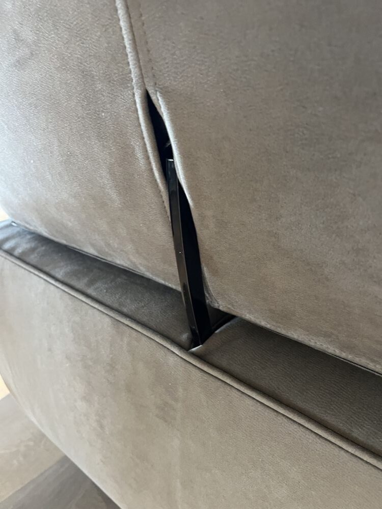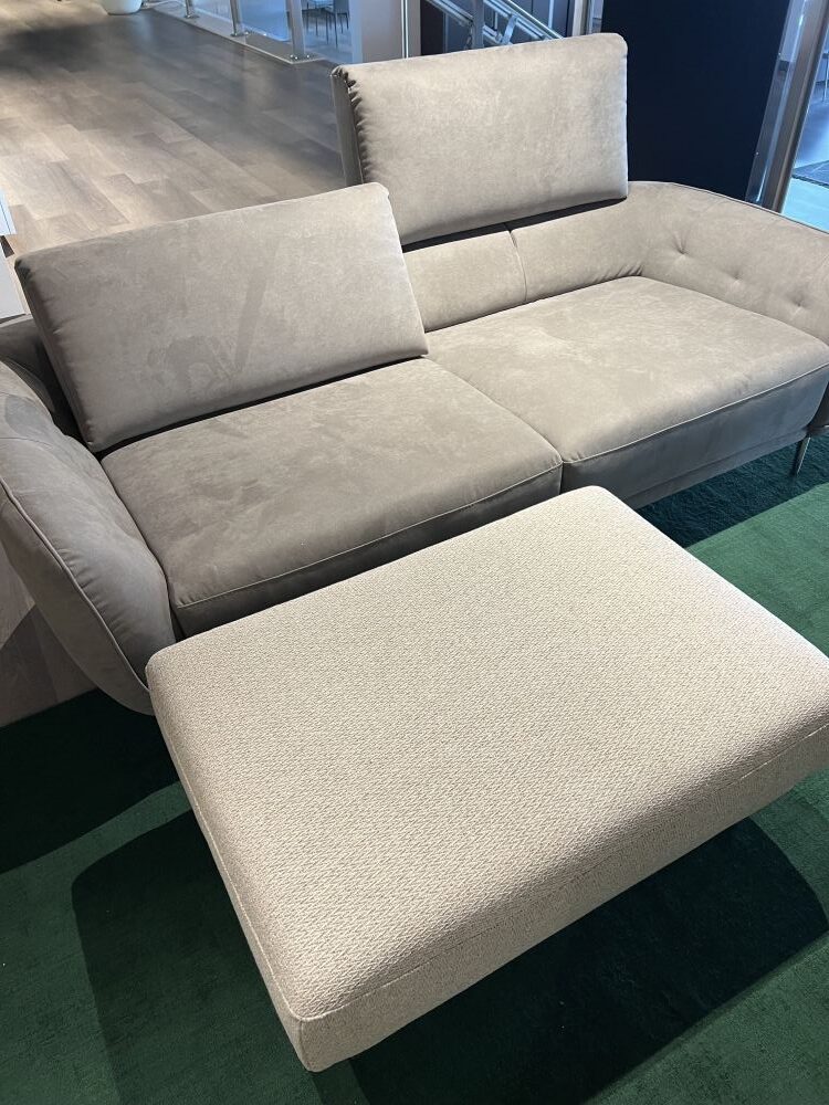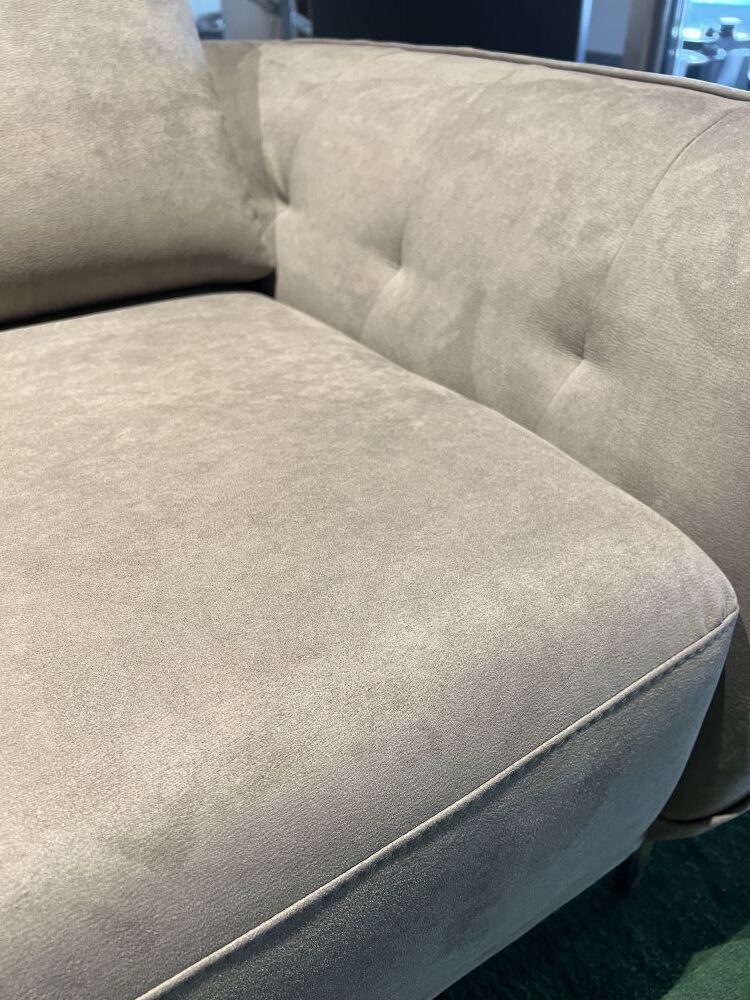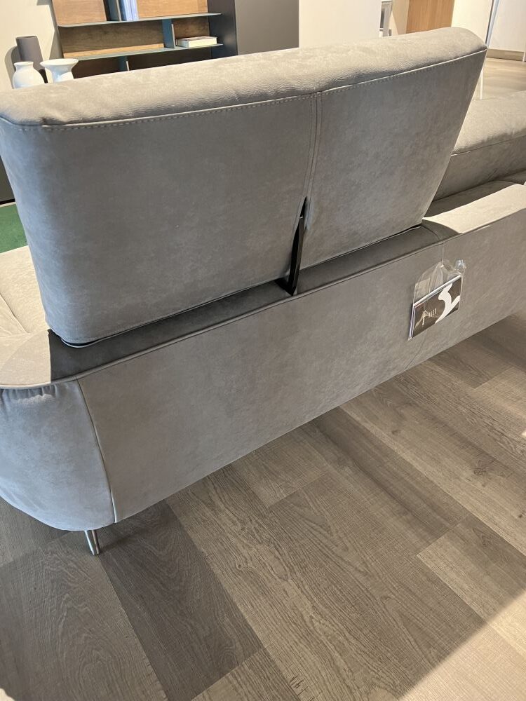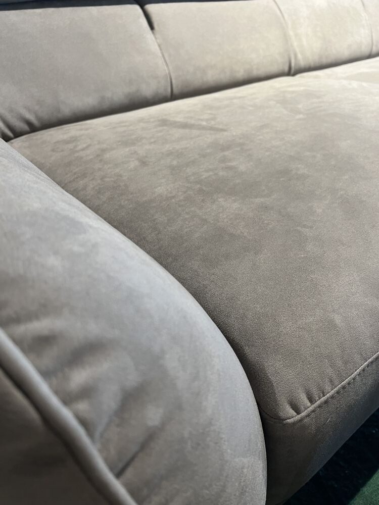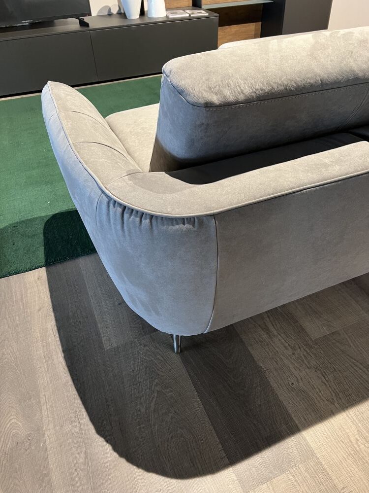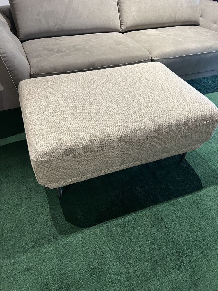 DETTAGLI E FINITURE: salotto dotato di spalliere sollevabili manualmente. Rivestimento in tessuto Microfibra cat. NE finitura Berlin, pouf rivestito in tessuto SHELL-G&G Colore 600. Piedini in fin. Metallo lucido
