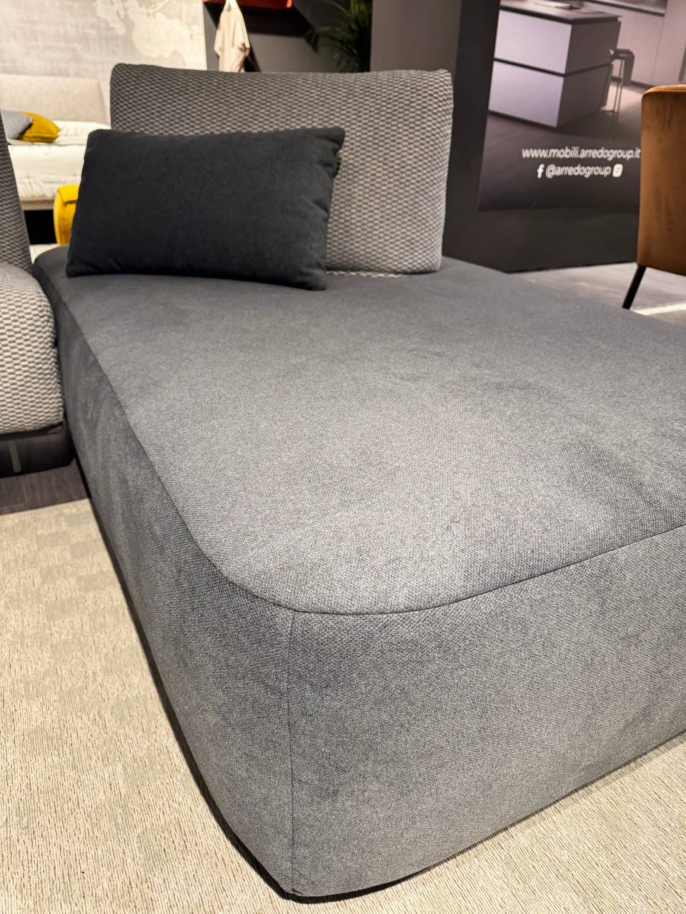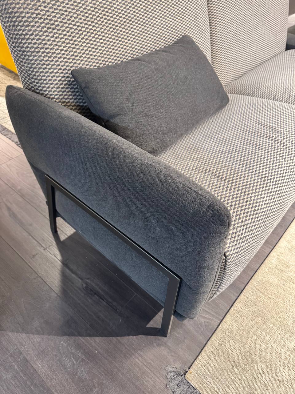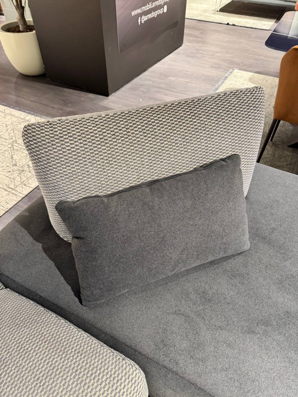 DETTAGLI E FINITURE: tessuto grigio topo, tessuto grigio antracite e tessuto tramato. Piedini in metallo antracite