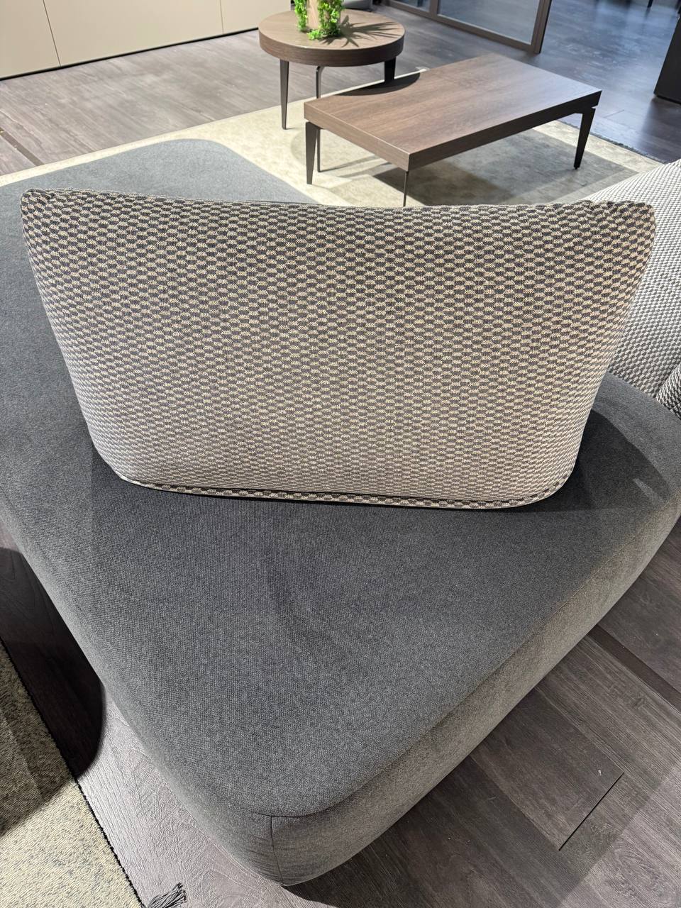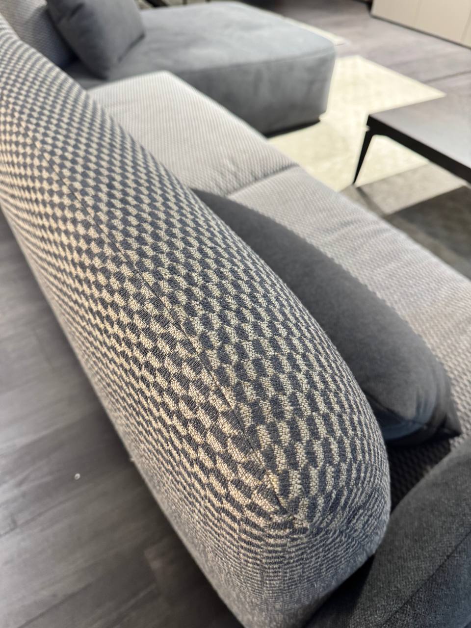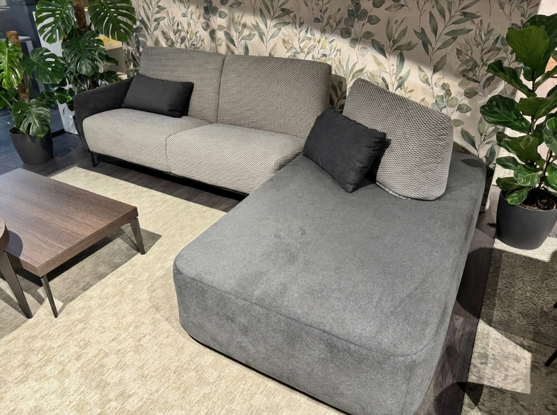 DETTAGLI E FINITURE: tessuto grigio topo, tessuto grigio antracite e tessuto tramato. Piedini in metallo antracite